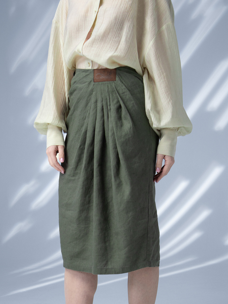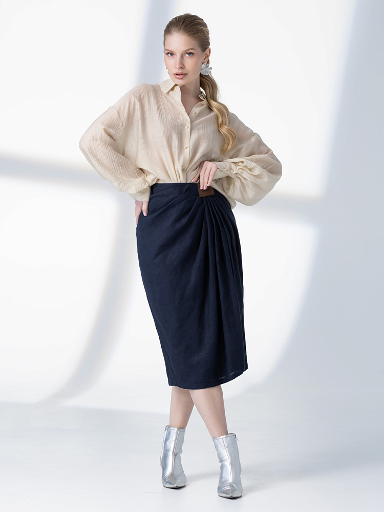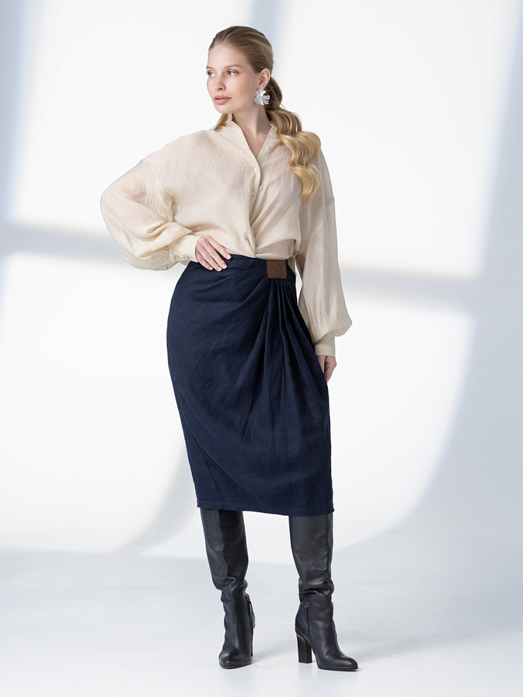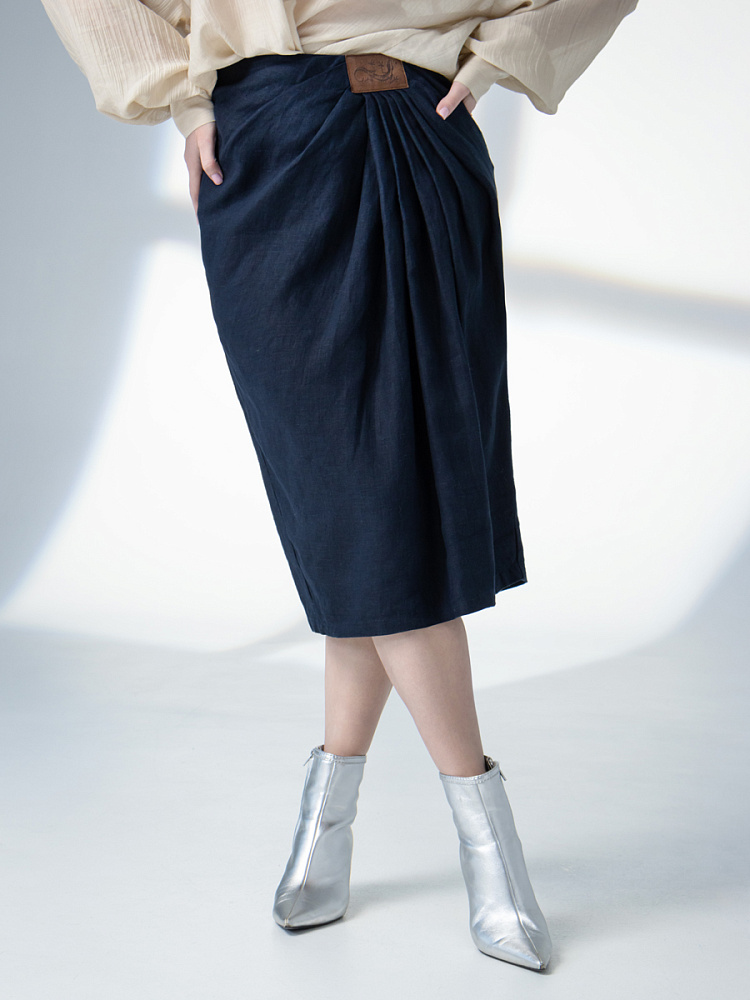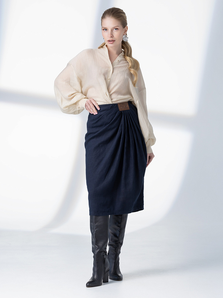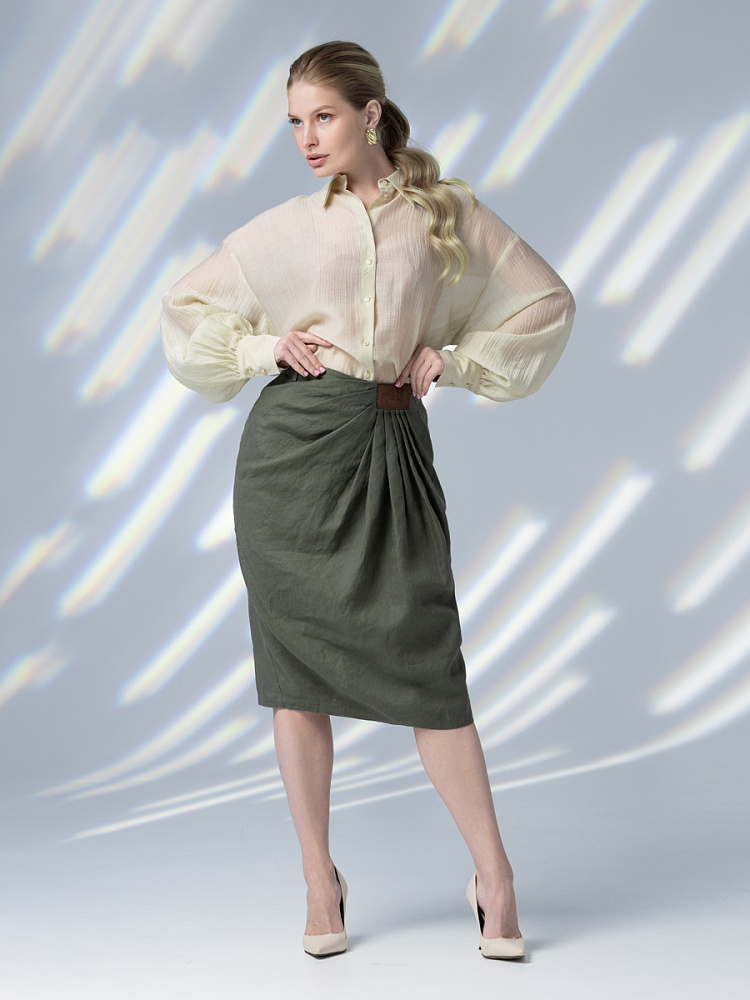 Элегантный и лаконичный образ создаёт представленная модель юбки. Глубокие драпировки натурального льна приковывают к себе внимание. Дизайнеры Kayros наглядно доказывают, что лён можно использовать не только в повседневных дуэтах, но и составлять вечерние утончённые аутфиты. Присмотритесь к этим изысканным складкам! Они подобно водным потокам плавно ниспадают с женских бёдер, создавая великолепную геометрию линий. На этом фоне очень утончённо и женственно выглядит линия талии. Длина чуть ниже колена – универсальна для обладательниц различного роста, хорошо подчёркивает красоту женских ножек и сочетается с самой разнообразной обувью. Задняя половинка юбки на этом фоне не смещает на себя стилистические акценты, чтобы не нарушить баланс композиции. Прямой крой, шлица для удобного шага и пояс на талии – практичные конструктивные решения, которые способствуют комфортному использованию модели. Уверены, в этой юбке вы будете неотразимы.