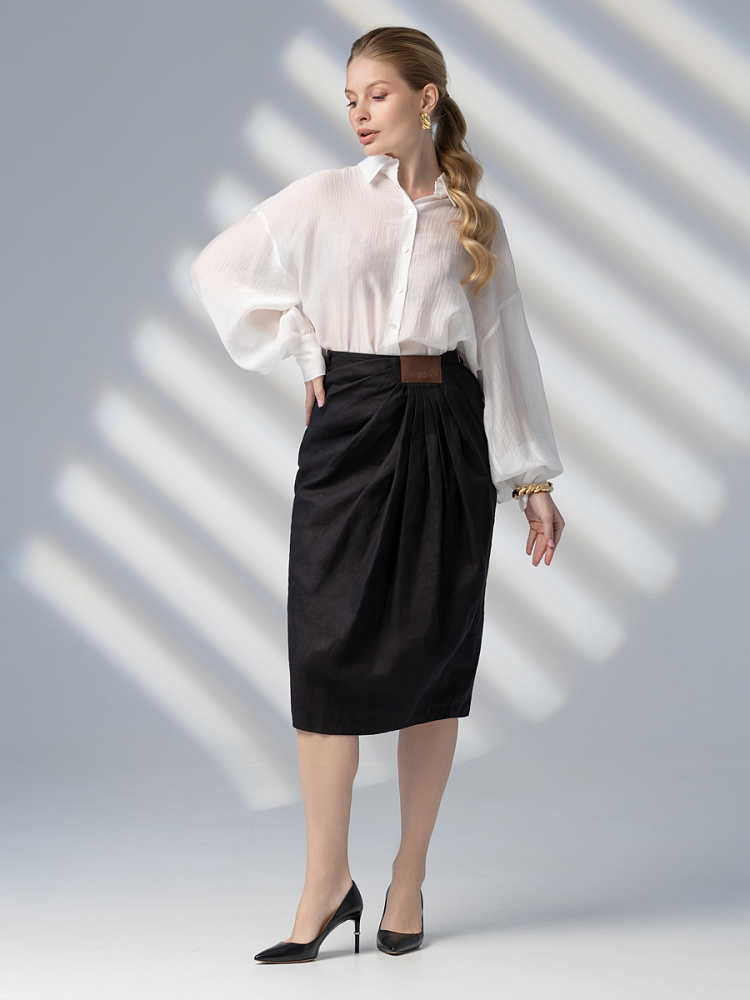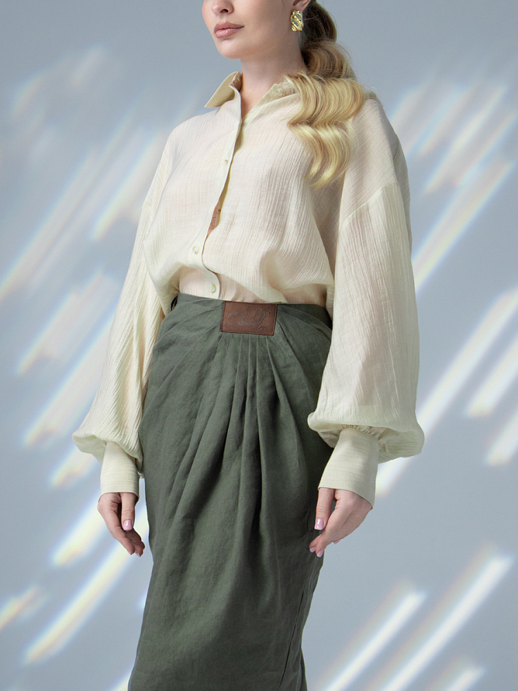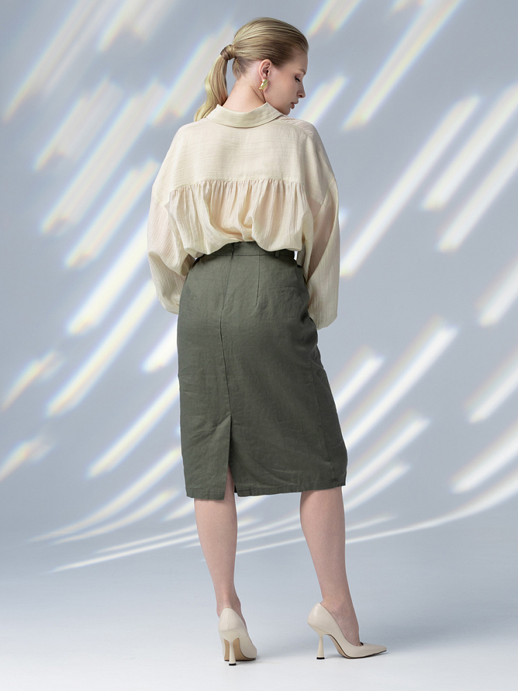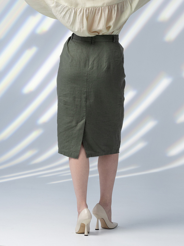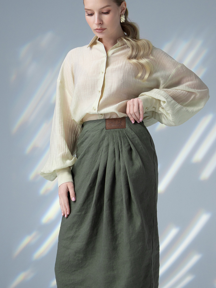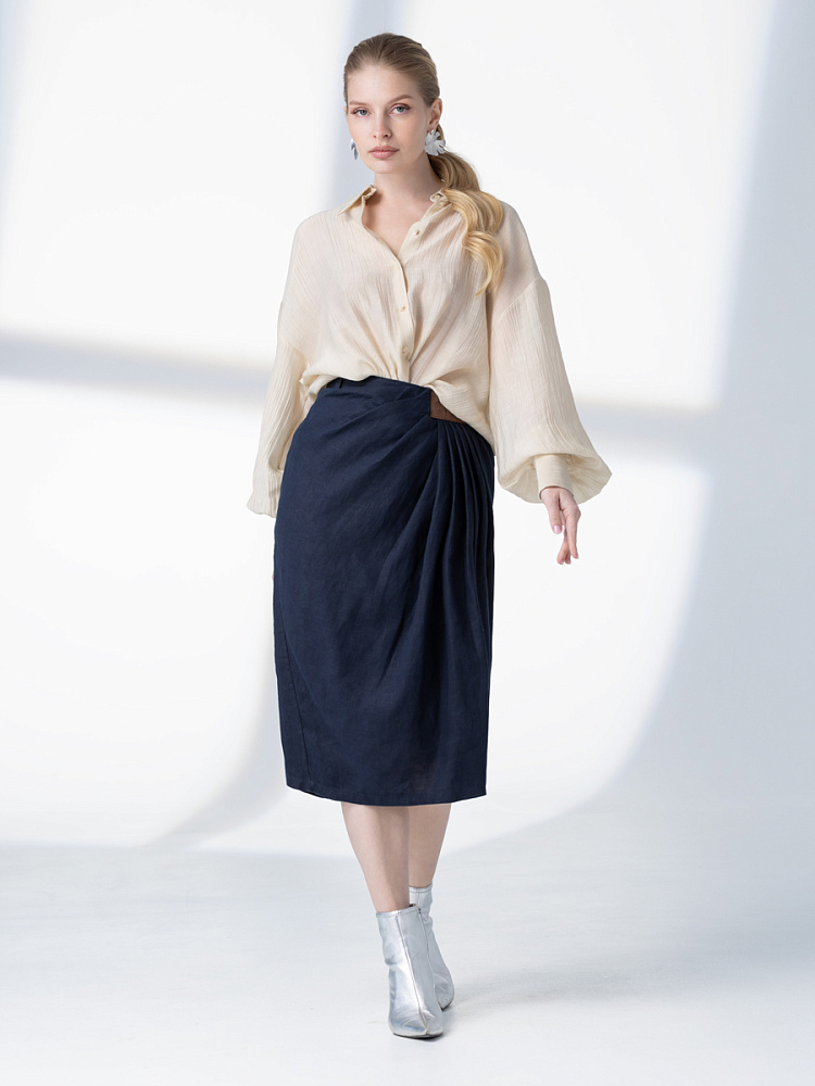 Элегантный и лаконичный образ создаёт представленная модель юбки. Глубокие драпировки натурального льна приковывают к себе внимание. Дизайнеры Kayros наглядно доказывают, что лён можно использовать не только в повседневных дуэтах, но и составлять вечерние утончённые аутфиты. Присмотритесь к этим изысканным складкам! Они подобно водным потокам плавно ниспадают с женских бёдер, создавая великолепную геометрию линий. На этом фоне очень утончённо и женственно выглядит линия талии. Длина чуть ниже колена – универсальна для обладательниц различного роста, хорошо подчёркивает красоту женских ножек и сочетается с самой разнообразной обувью. Задняя половинка юбки на этом фоне не смещает на себя стилистические акценты, чтобы не нарушить баланс композиции. Прямой крой, шлица для удобного шага и пояс на талии – практичные конструктивные решения, которые способствуют комфортному использованию модели. Уверены, в этой юбке вы будете неотразимы.
