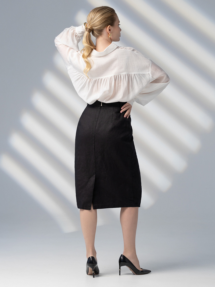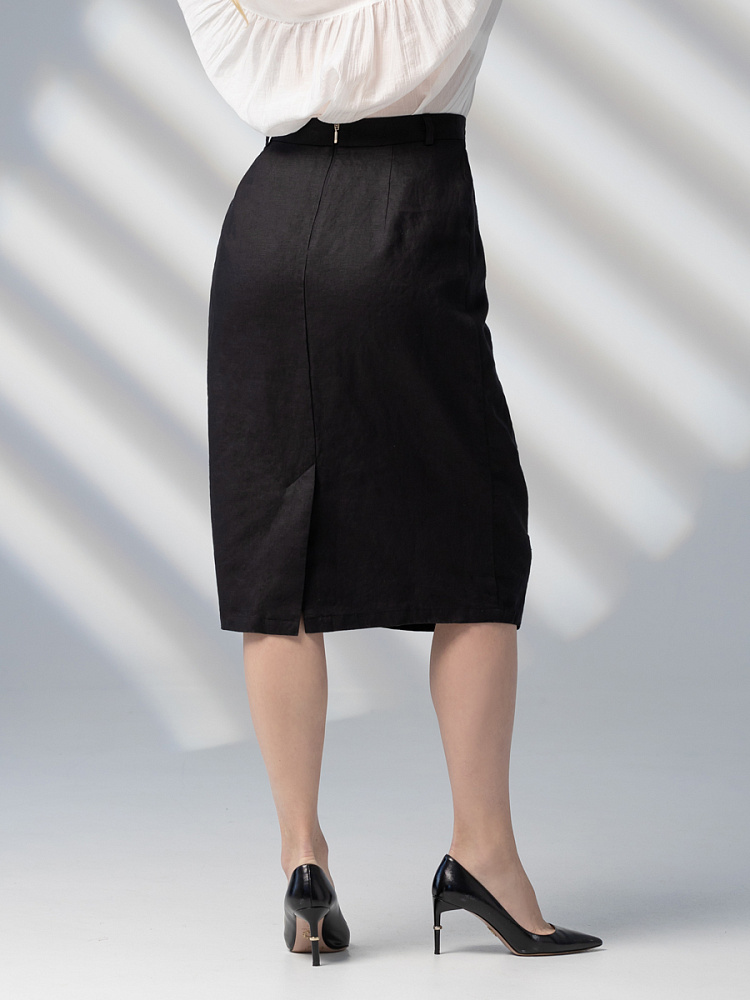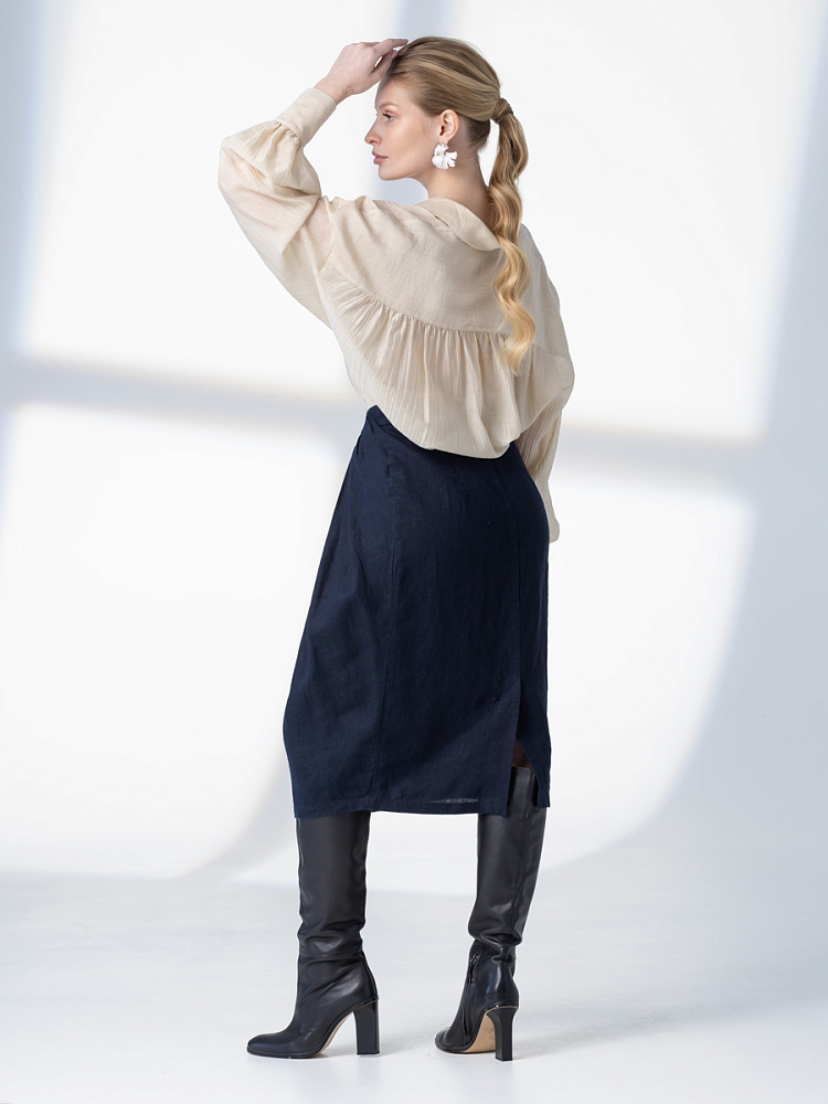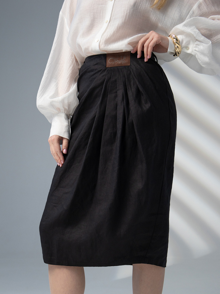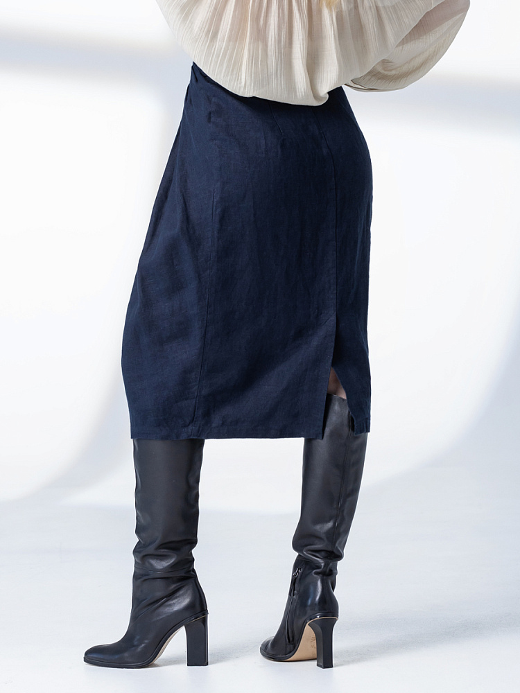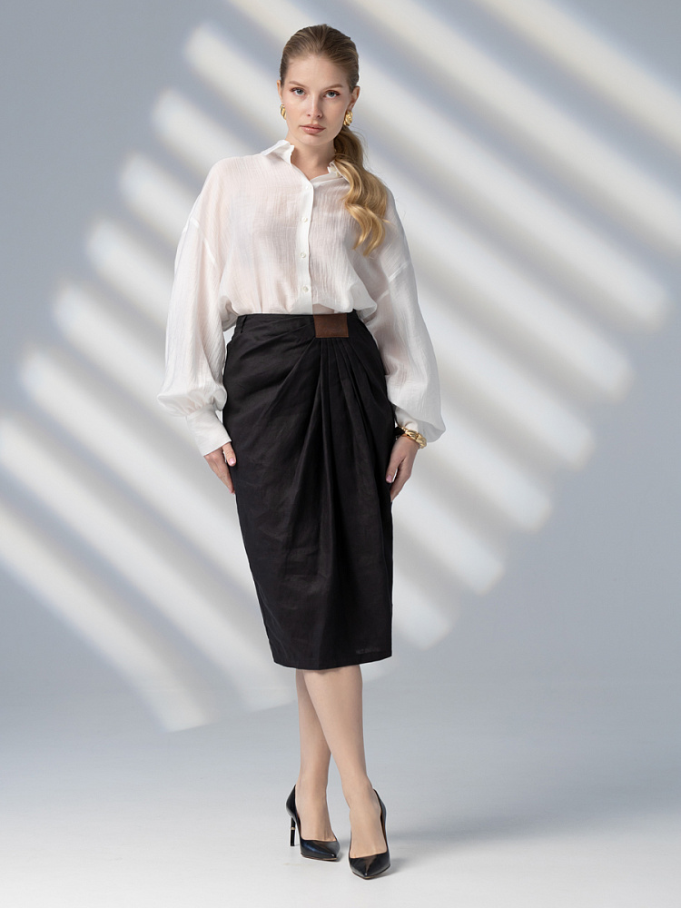 Элегантный и лаконичный образ создаёт представленная модель юбки. Глубокие драпировки натурального льна приковывают к себе внимание. Дизайнеры Kayros наглядно доказывают, что лён можно использовать не только в повседневных дуэтах, но и составлять вечерние утончённые аутфиты. Присмотритесь к этим изысканным складкам! Они подобно водным потокам плавно ниспадают с женских бёдер, создавая великолепную геометрию линий. На этом фоне очень утончённо и женственно выглядит линия талии. Длина чуть ниже колена – универсальна для обладательниц различного роста, хорошо подчёркивает красоту женских ножек и сочетается с самой разнообразной обувью. Задняя половинка юбки на этом фоне не смещает на себя стилистические акценты, чтобы не нарушить баланс композиции. Прямой крой, шлица для удобного шага и пояс на талии – практичные конструктивные решения, которые способствуют комфортному использованию модели. Уверены, в этой юбке вы будете неотразимы.
