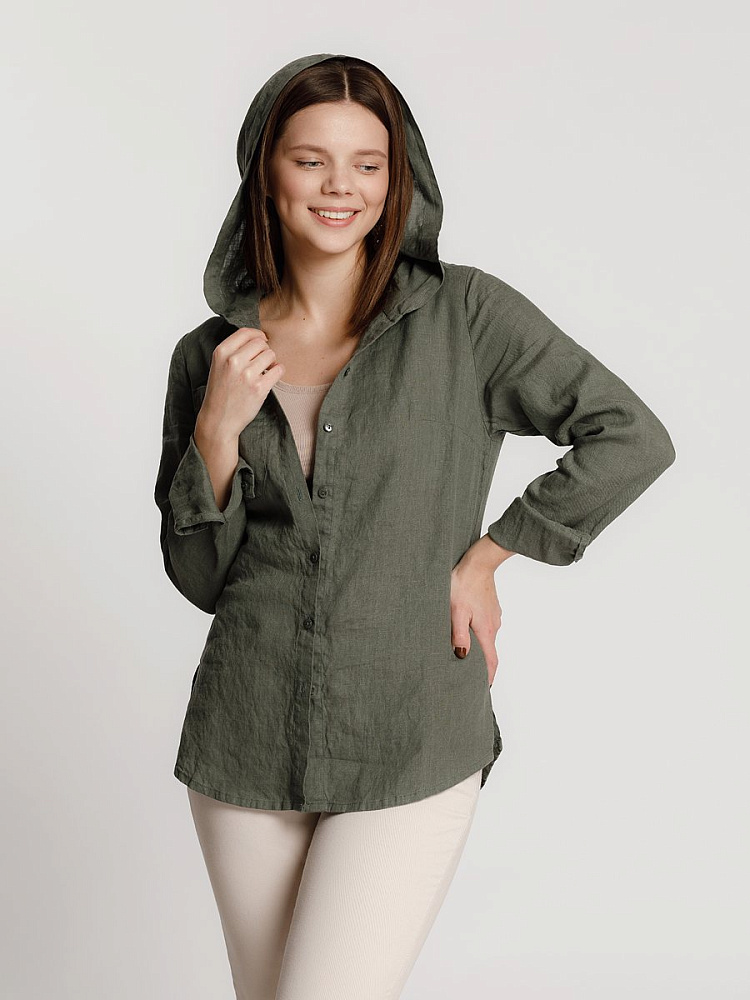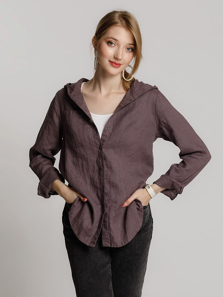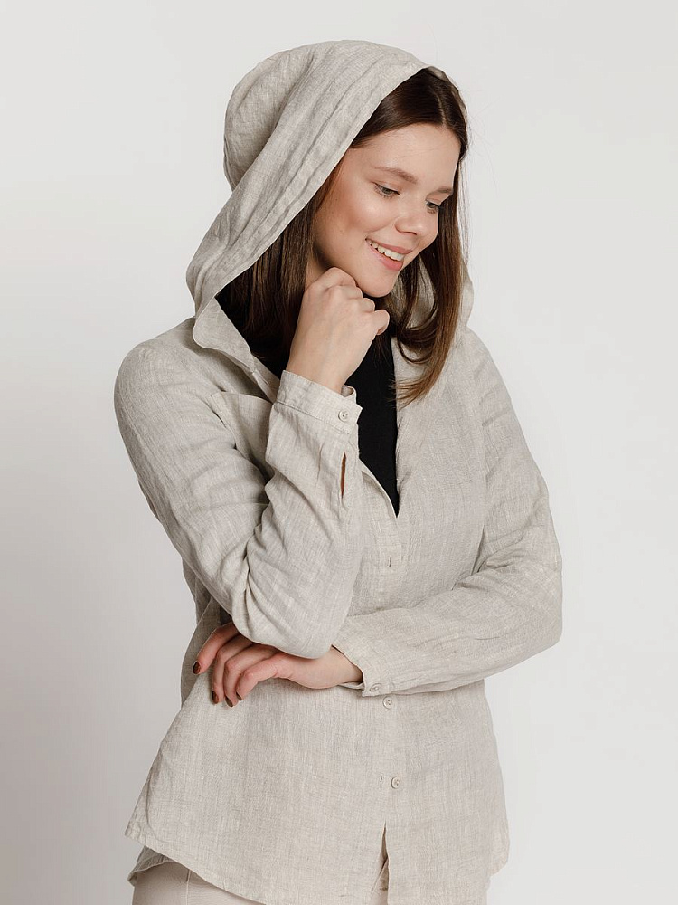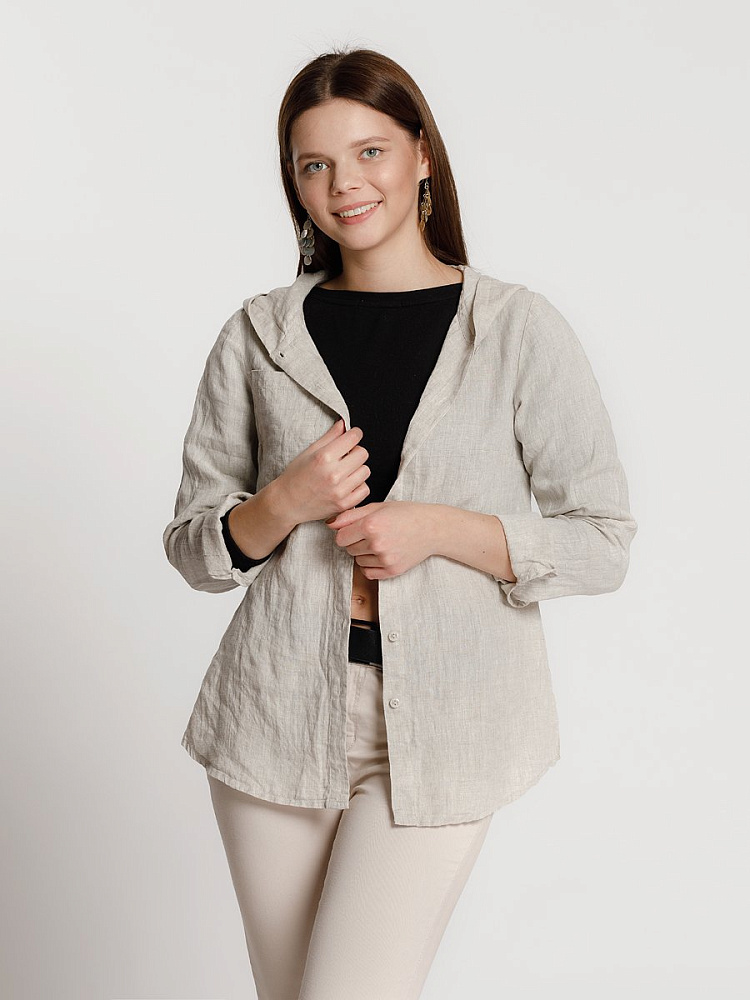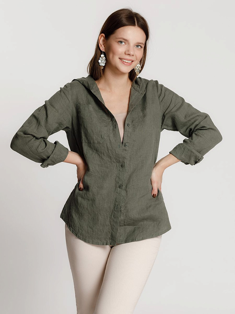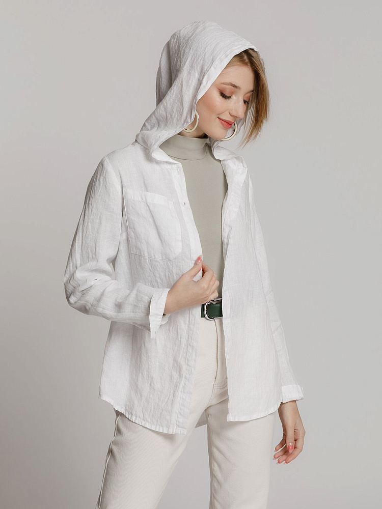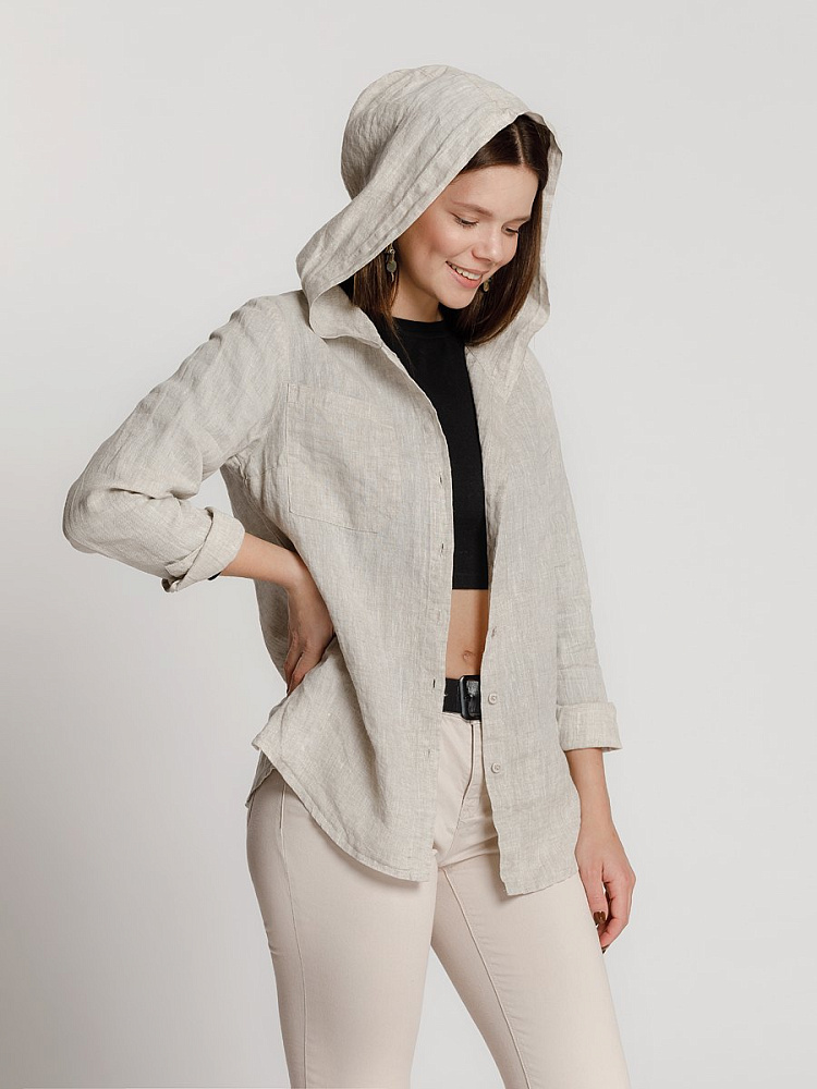 Мы вам можем привести много примеров, когда спортивные виды одежды успешно внедрились в повседневный гардероб, как женский, так и мужской. Благодаря своим практичным элементам и универсальным силуэтам они заняли почётное место в наших гардеробах. Представленная модель рубашки не исключение. Прямой полуприлегающий силуэт выгодно подчёркивает округлый нижний срез и разрезы в боковых швах. Спортивный характер модели отражают большой накладной карман и капюшон, который компенсирует отсутствие воротника. Классическая застёжка – планка на пуговицы и манжеты по низу рукава ставят финальную точку во всём стилистическом замысле. Вариант использования рубашки широк: её можно носить как самостоятельно, так и поверх любой футболки или топа, в качестве пыльника. Использование натурального льна, при изготовлении модели, позволит вам чувствовать себя комфортно в любых ситуациях.