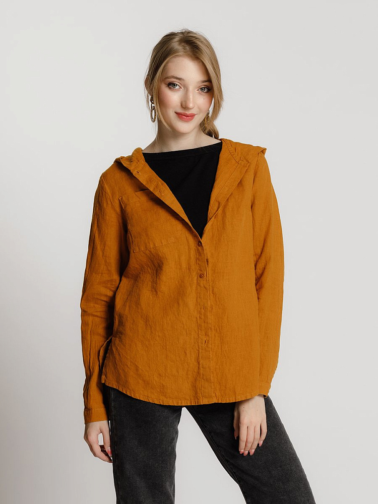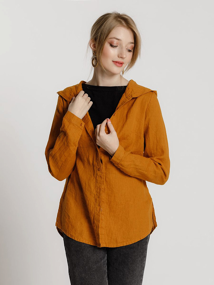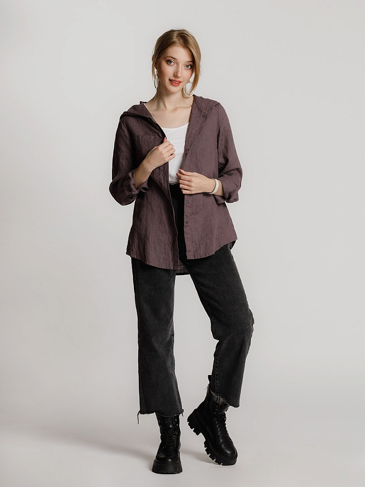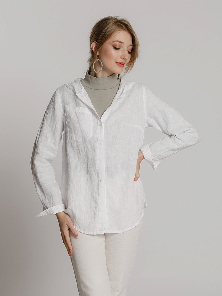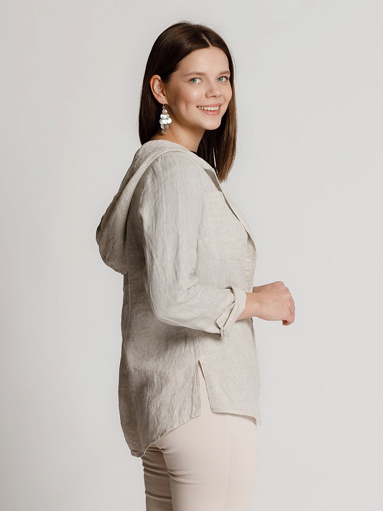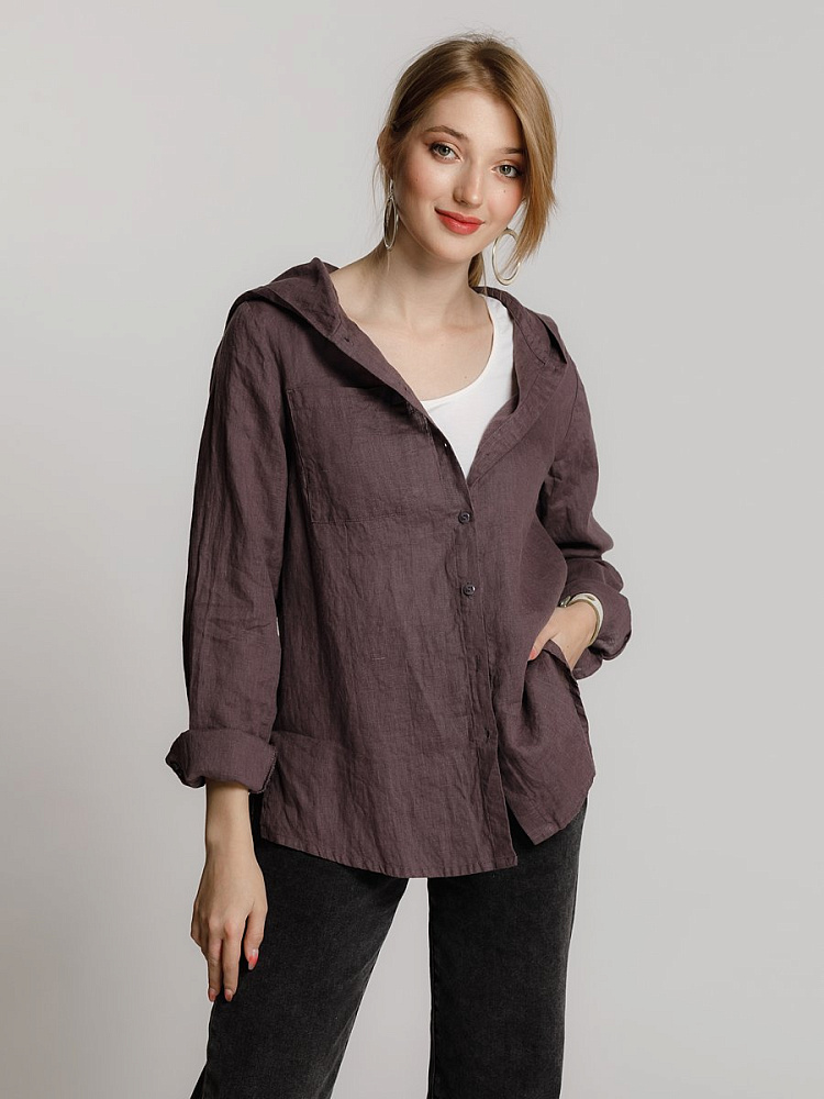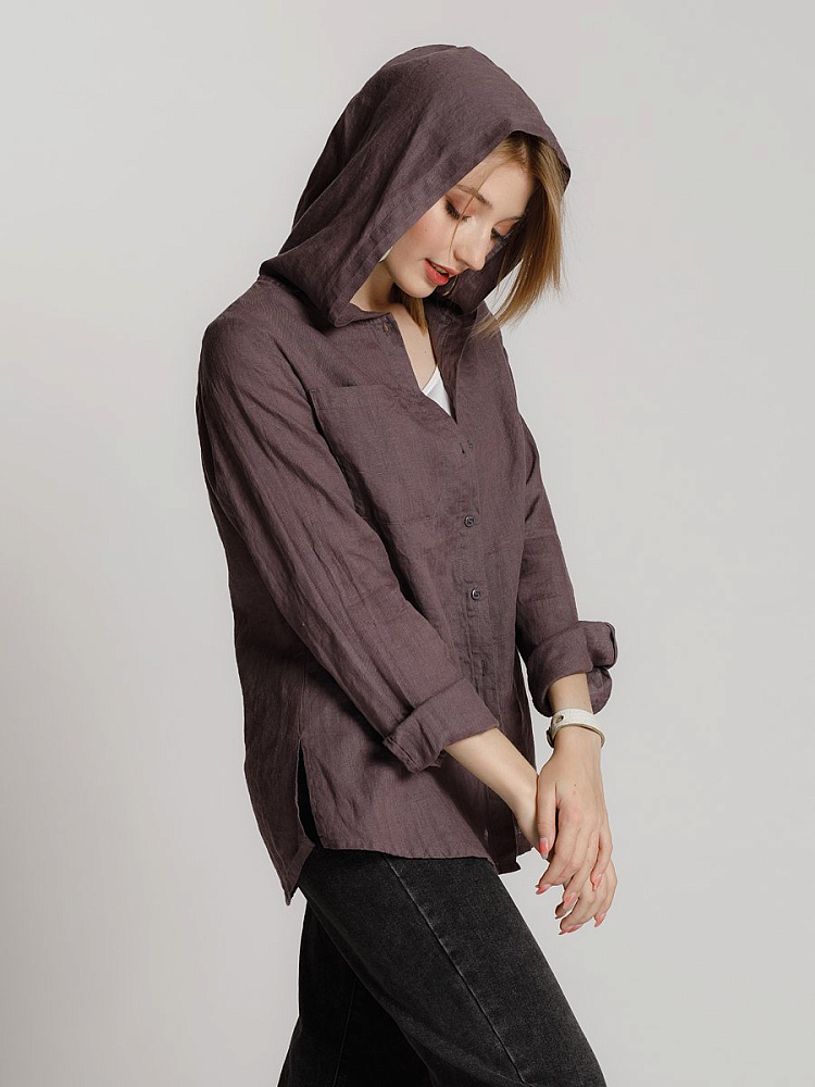 Мы вам можем привести много примеров, когда спортивные виды одежды успешно внедрились в повседневный гардероб, как женский, так и мужской. Благодаря своим практичным элементам и универсальным силуэтам они заняли почётное место в наших гардеробах. Представленная модель рубашки не исключение. Прямой полуприлегающий силуэт выгодно подчёркивает округлый нижний срез и разрезы в боковых швах. Спортивный характер модели отражают большой накладной карман и капюшон, который компенсирует отсутствие воротника. Классическая застёжка – планка на пуговицы и манжеты по низу рукава ставят финальную точку во всём стилистическом замысле. Вариант использования рубашки широк: её можно носить как самостоятельно, так и поверх любой футболки или топа, в качестве пыльника. Использование натурального льна, при изготовлении модели, позволит вам чувствовать себя комфортно в любых ситуациях.