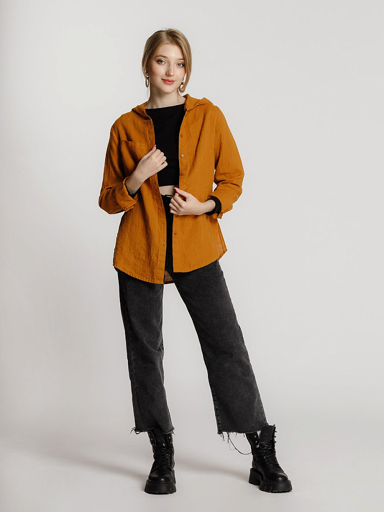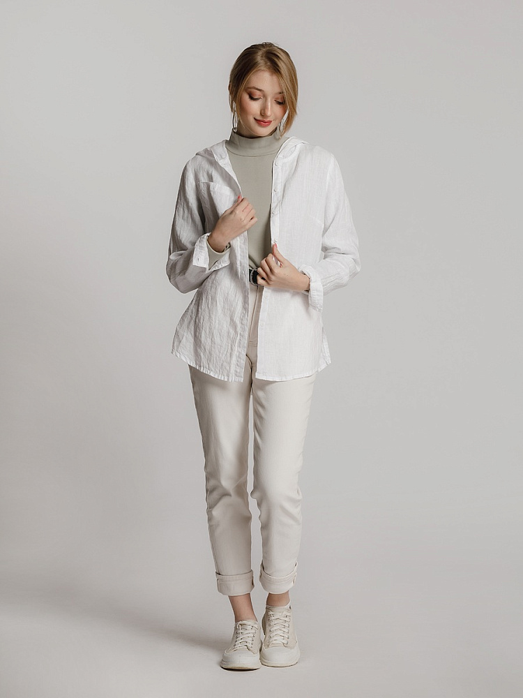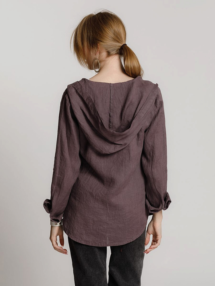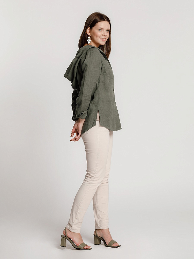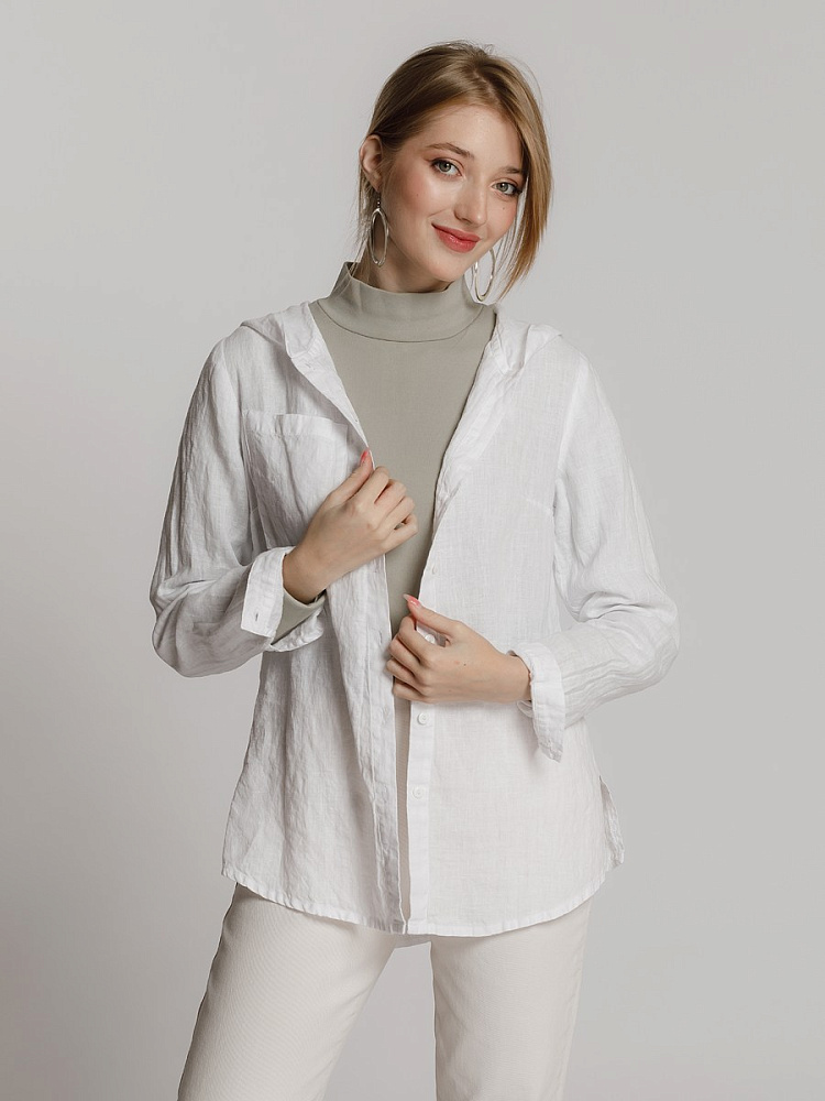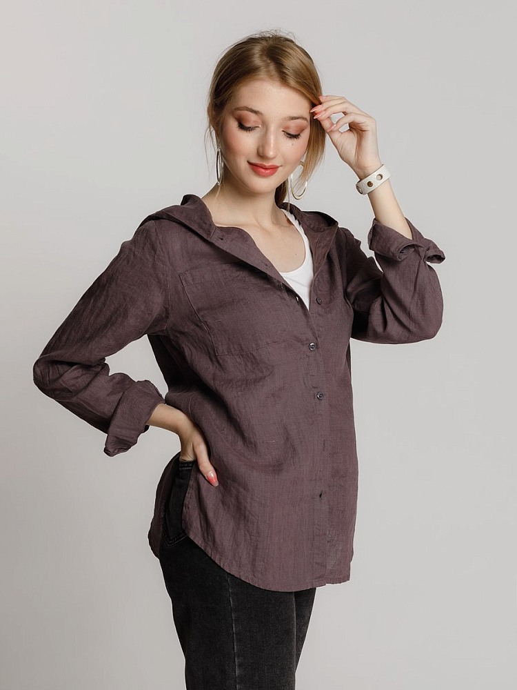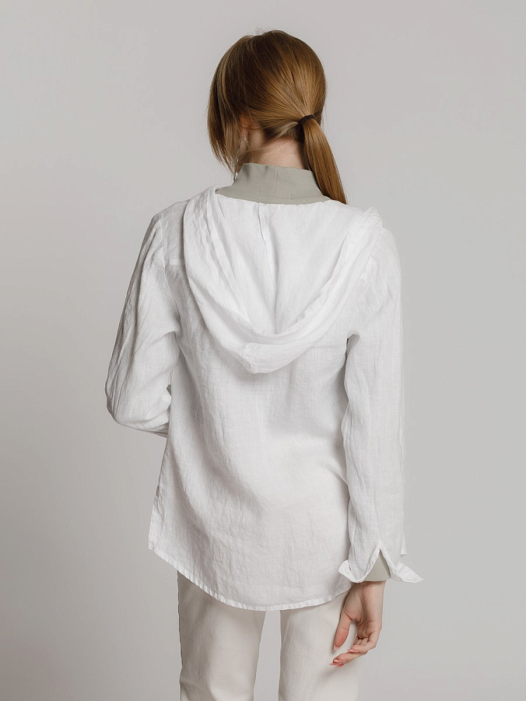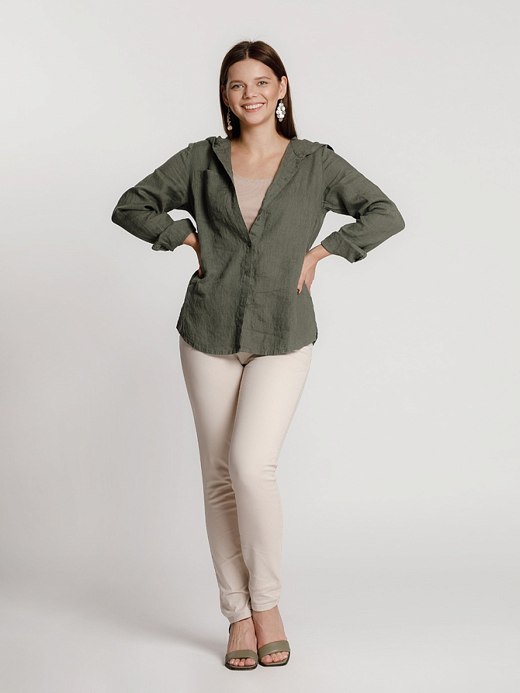 Мы вам можем привести много примеров, когда спортивные виды одежды успешно внедрились в повседневный гардероб, как женский, так и мужской. Благодаря своим практичным элементам и универсальным силуэтам они заняли почётное место в наших гардеробах. Представленная модель рубашки не исключение. Прямой полуприлегающий силуэт выгодно подчёркивает округлый нижний срез и разрезы в боковых швах. Спортивный характер модели отражают большой накладной карман и капюшон, который компенсирует отсутствие воротника. Классическая застёжка – планка на пуговицы и манжеты по низу рукава ставят финальную точку во всём стилистическом замысле. Вариант использования рубашки широк: её можно носить как самостоятельно, так и поверх любой футболки или топа, в качестве пыльника. Использование натурального льна, при изготовлении модели, позволит вам чувствовать себя комфортно в любых ситуациях.