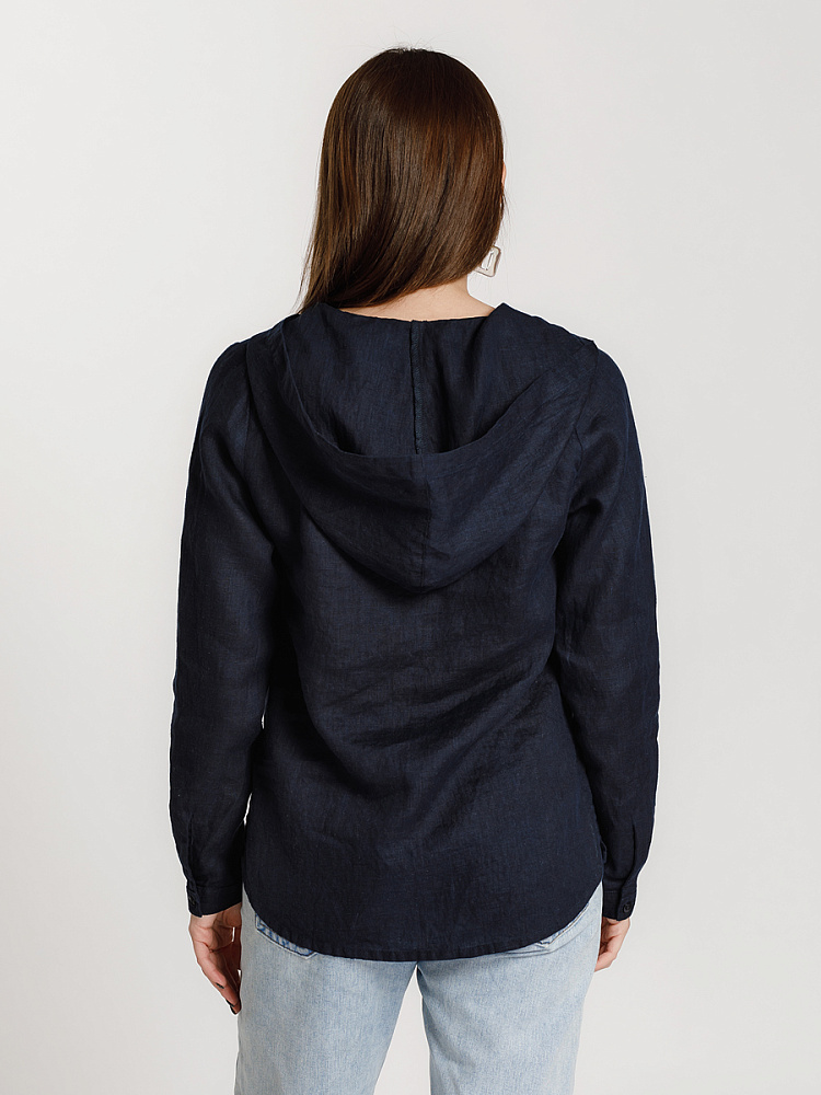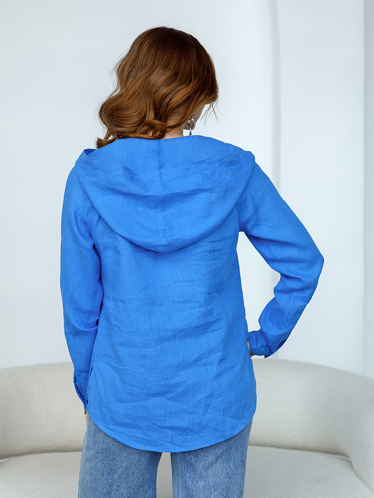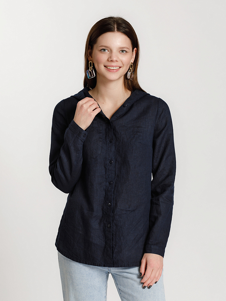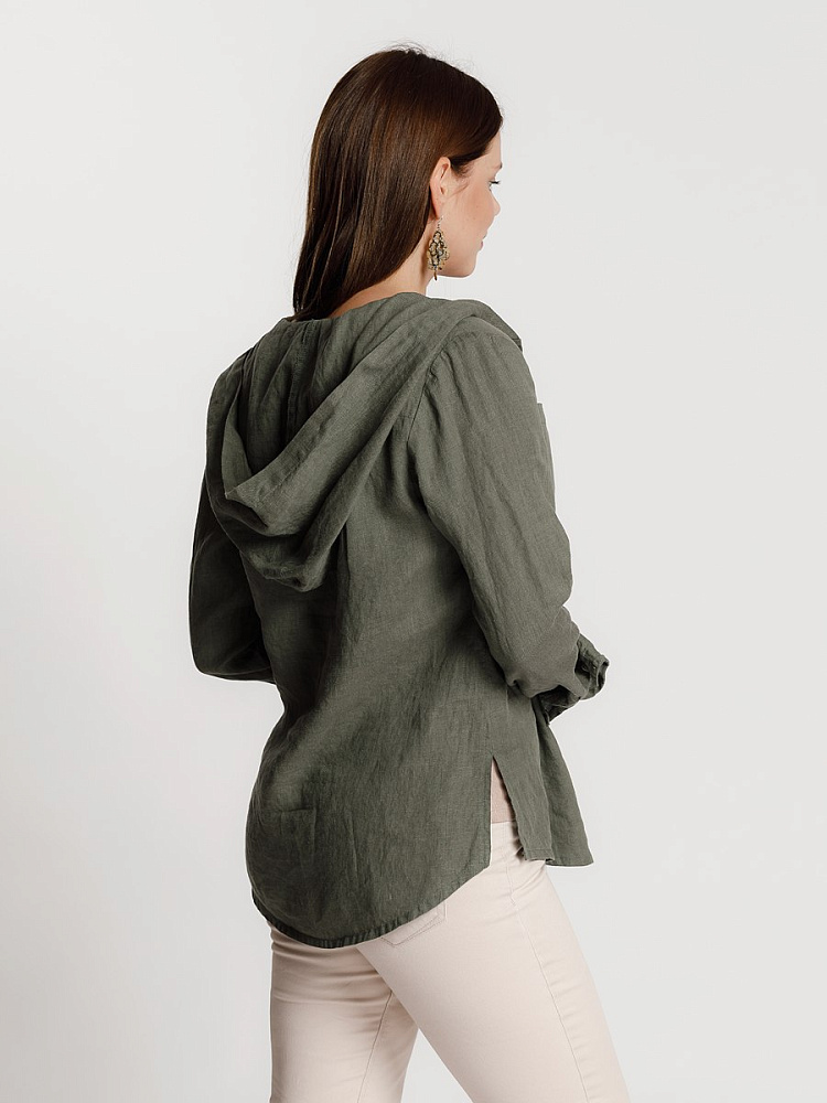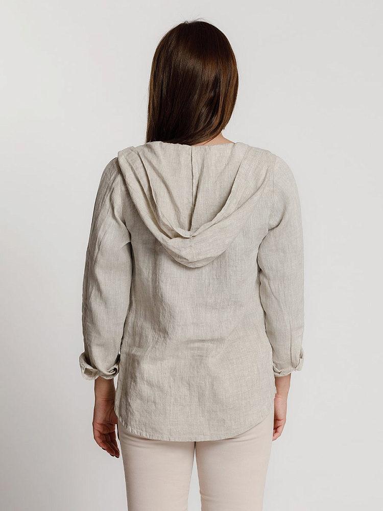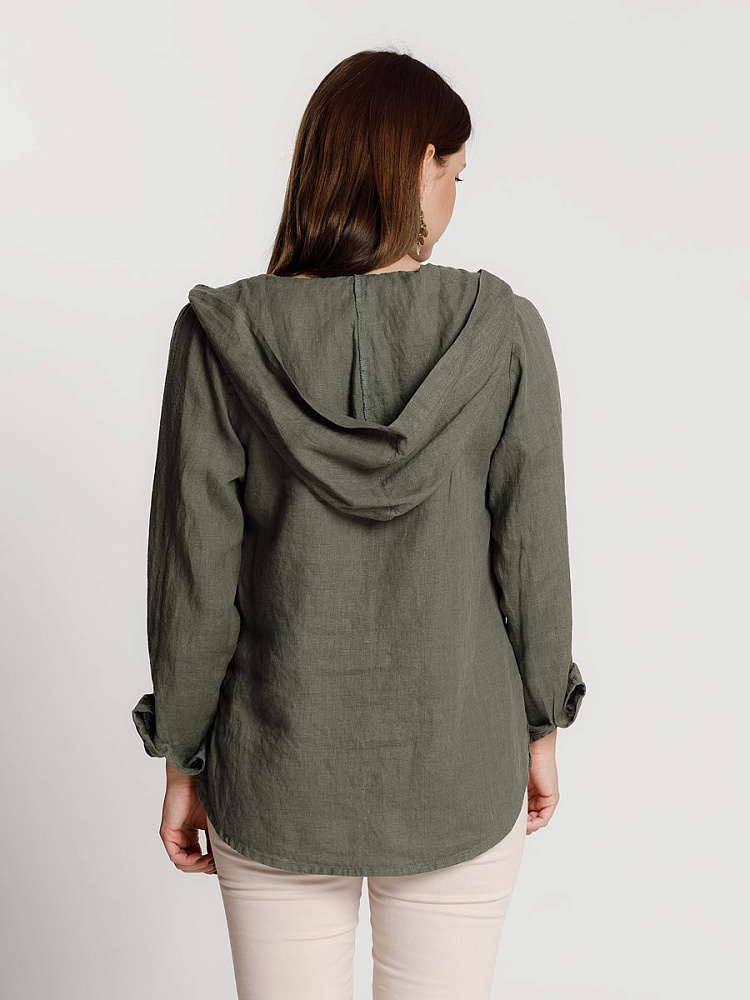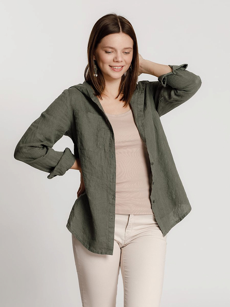Мы вам можем привести много примеров, когда спортивные виды одежды успешно внедрились в повседневный гардероб, как женский, так и мужской. Благодаря своим практичным элементам и универсальным силуэтам они заняли почётное место в наших гардеробах. Представленная модель рубашки не исключение. Прямой полуприлегающий силуэт выгодно подчёркивает округлый нижний срез и разрезы в боковых швах. Спортивный характер модели отражают большой накладной карман и капюшон, который компенсирует отсутствие воротника. Классическая застёжка – планка на пуговицы и манжеты по низу рукава ставят финальную точку во всём стилистическом замысле. Вариант использования рубашки широк: её можно носить как самостоятельно, так и поверх любой футболки или топа, в качестве пыльника. Использование натурального льна, при изготовлении модели, позволит вам чувствовать себя комфортно в любых ситуациях.