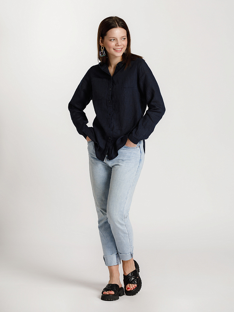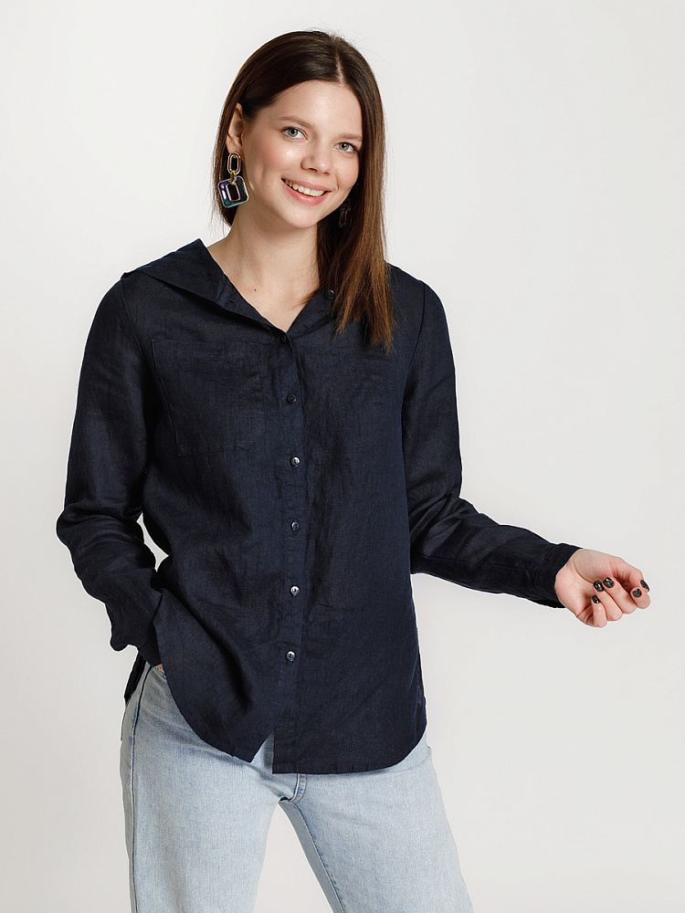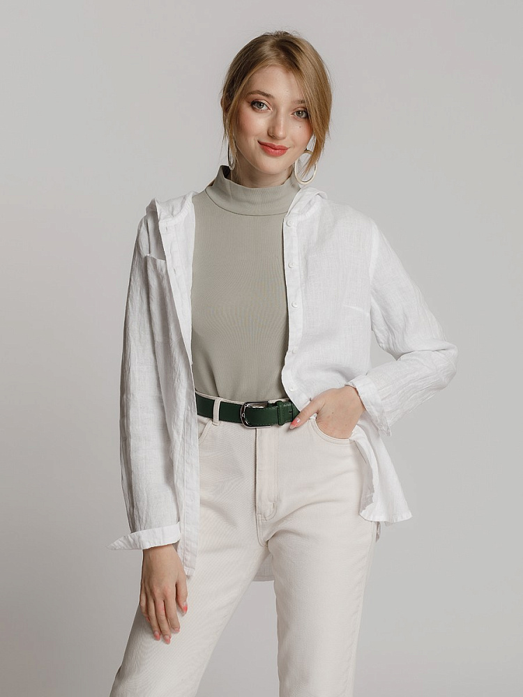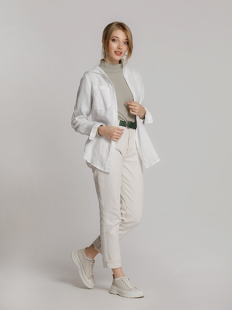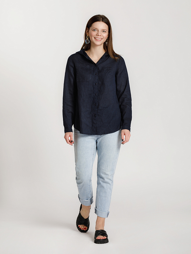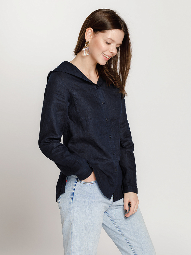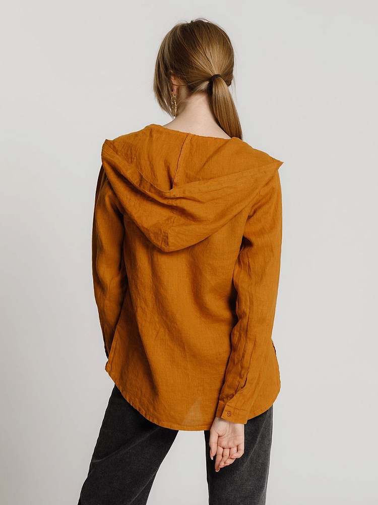 Мы вам можем привести много примеров, когда спортивные виды одежды успешно внедрились в повседневный гардероб, как женский, так и мужской. Благодаря своим практичным элементам и универсальным силуэтам они заняли почётное место в наших гардеробах. Представленная модель рубашки не исключение. Прямой полуприлегающий силуэт выгодно подчёркивает округлый нижний срез и разрезы в боковых швах. Спортивный характер модели отражают большой накладной карман и капюшон, который компенсирует отсутствие воротника. Классическая застёжка – планка на пуговицы и манжеты по низу рукава ставят финальную точку во всём стилистическом замысле. Вариант использования рубашки широк: её можно носить как самостоятельно, так и поверх любой футболки или топа, в качестве пыльника. Использование натурального льна, при изготовлении модели, позволит вам чувствовать себя комфортно в любых ситуациях.