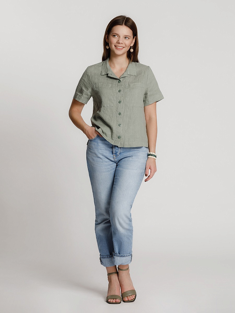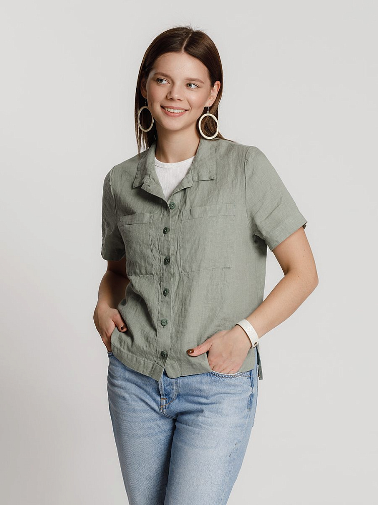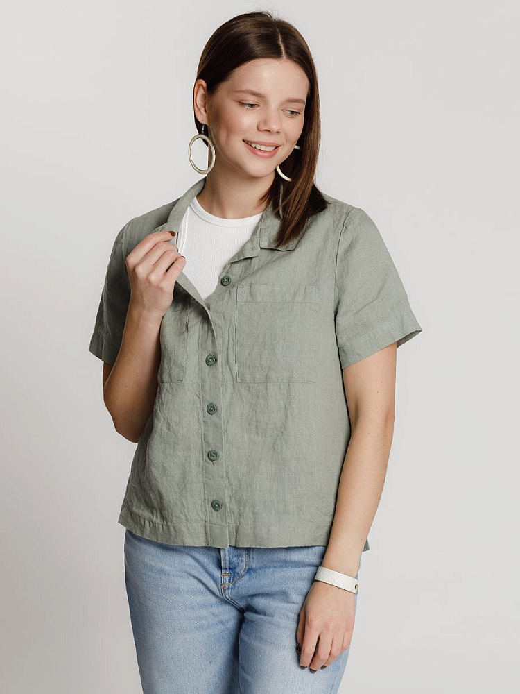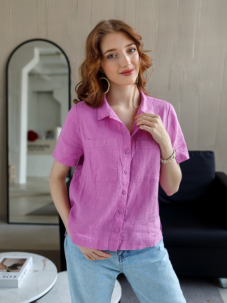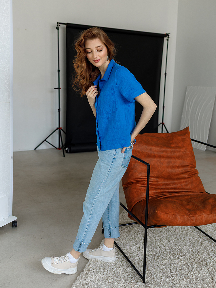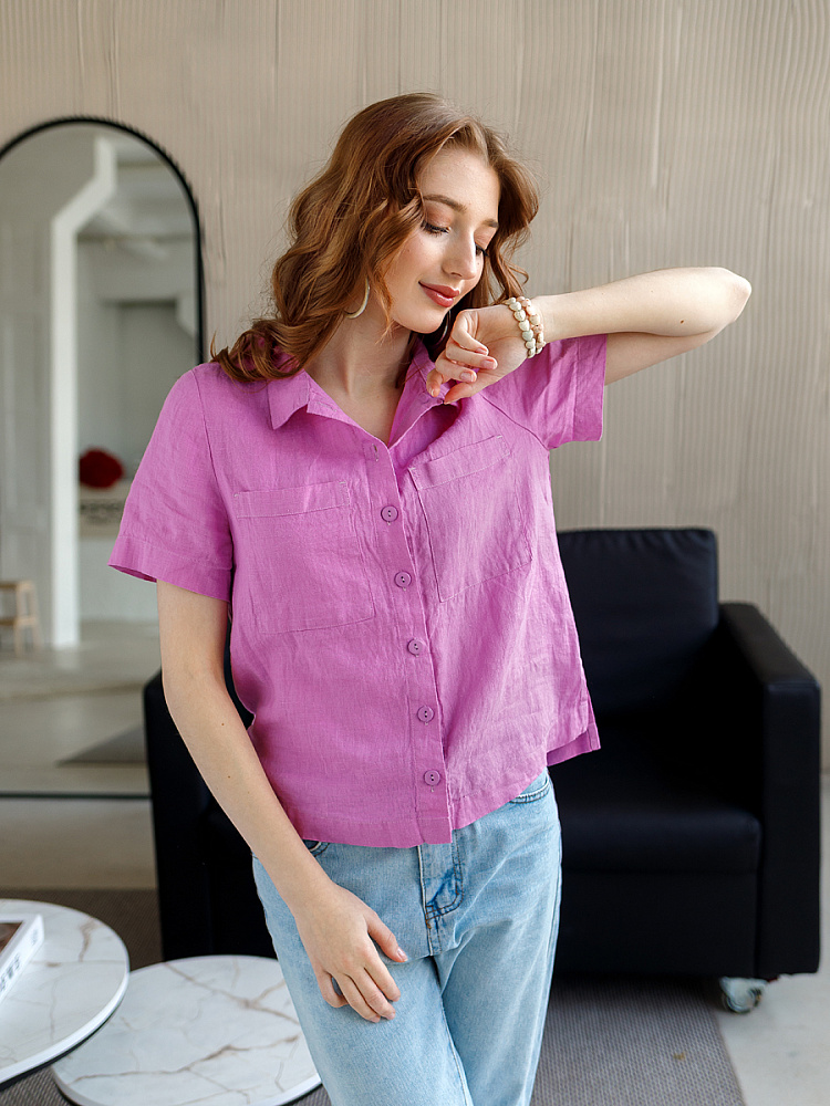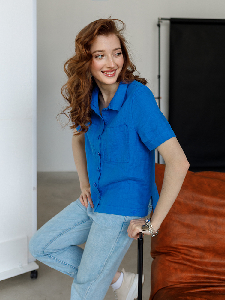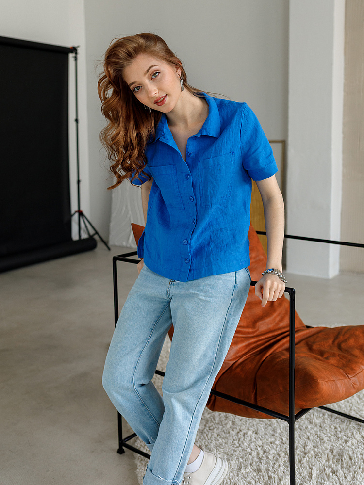 В отличие от скудного мужского вариатива, женская рубашка отличается большим количеством фасонов и стилей. Этот предмет женского гардероба может похвастаться разнообразием длин, силуэтов, формой воротников, видом тканей, количеством декора и сезонным предназначением. Представленная модель рубашки влюбляет в себя с первого взгляда. Прямой крой подарит комфорт и практичность при использовании. Это особенно актуально в тёплый летний период. Сочетание небольшой длинны и короткого рукава – простое и стильное решение, которое диктует носить эту рубашку поверх поясных изделий. Эти условия создают динамичный и свободный внешний вид. Большие накладные карманы, отложной воротник и планка на пуговицы – выказывают неоспоримые доказательства принадлежности к классическим традициям. Органично и неповторимо выглядят декоративные строчки на жатой текстуре натурального льна, который использован для пошива этой модели.