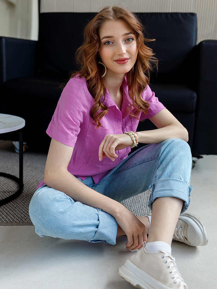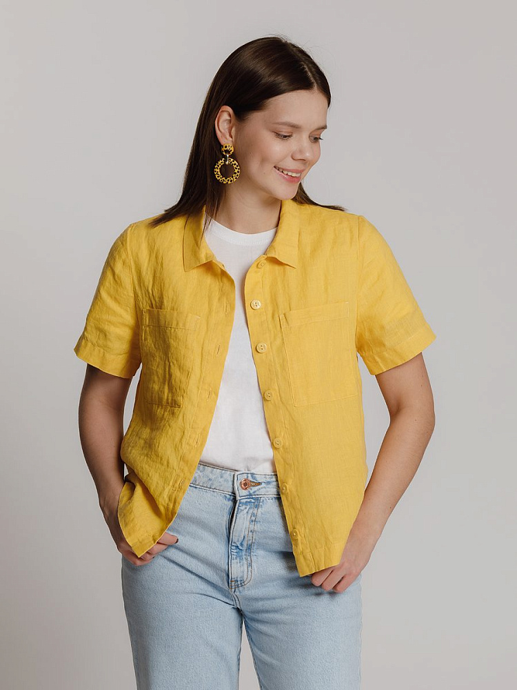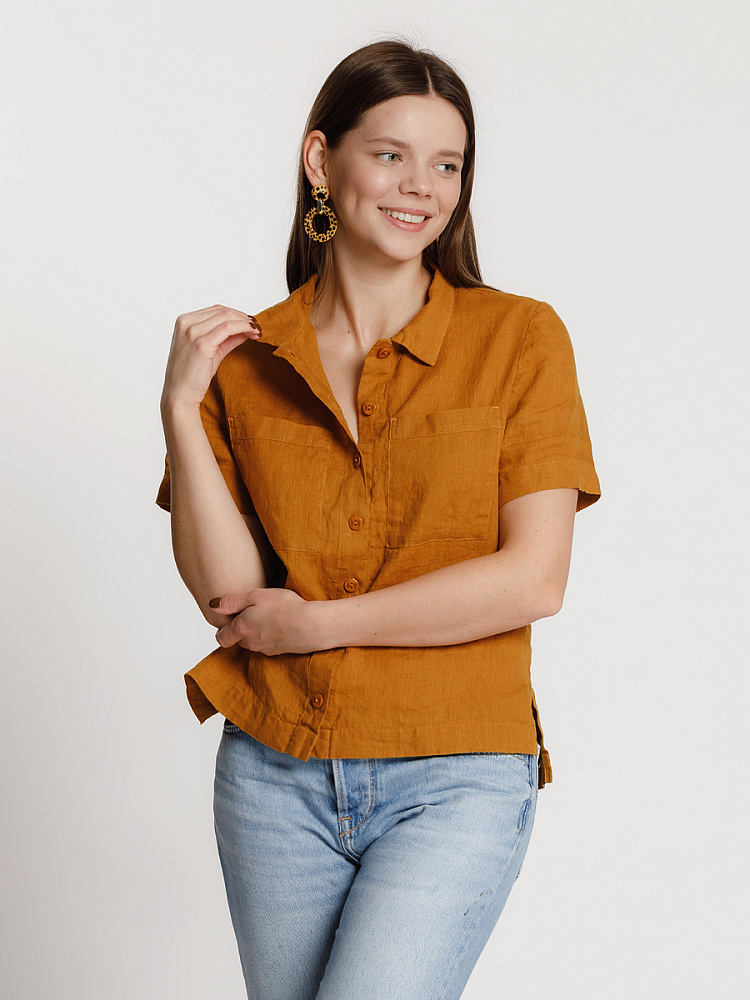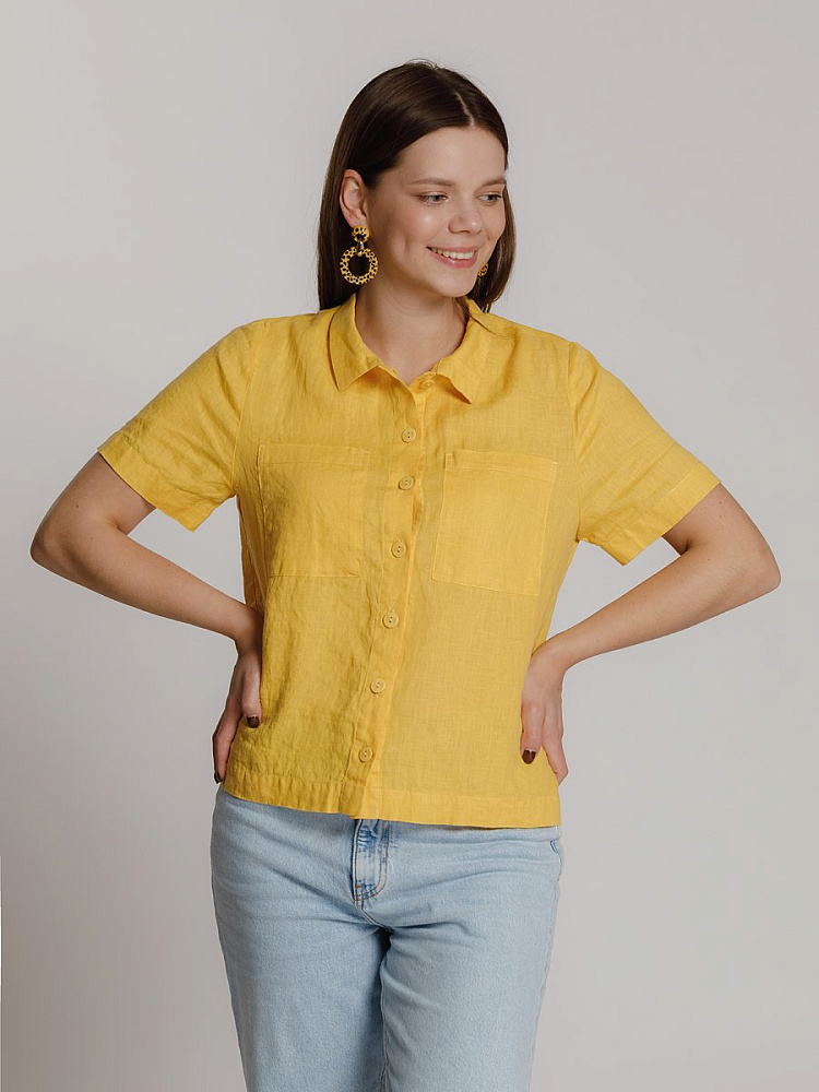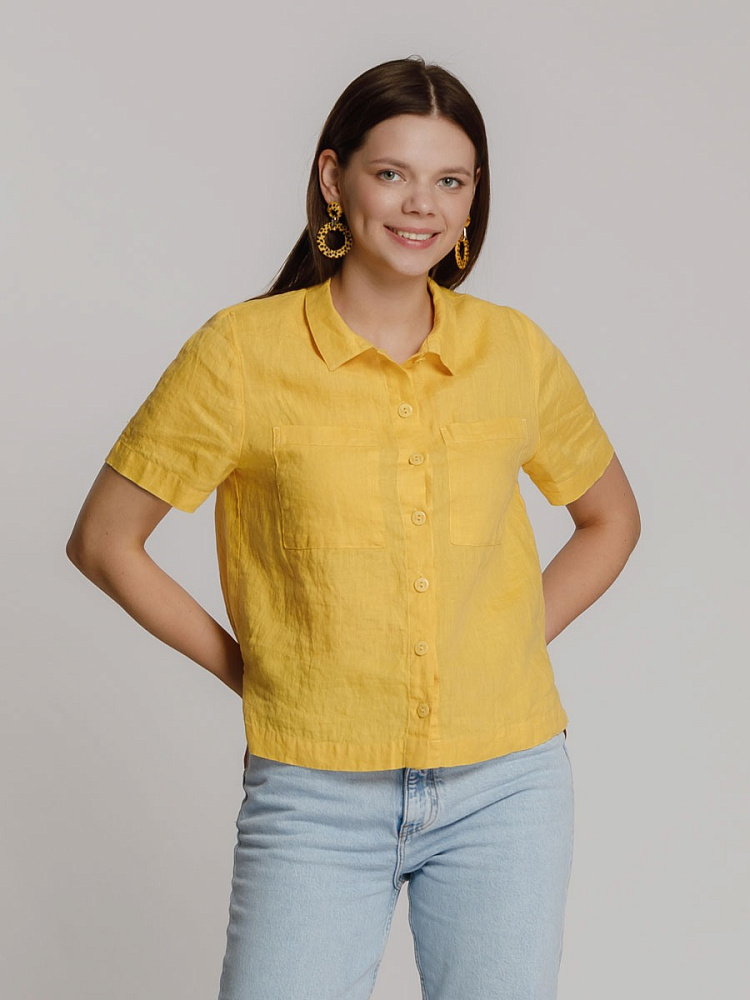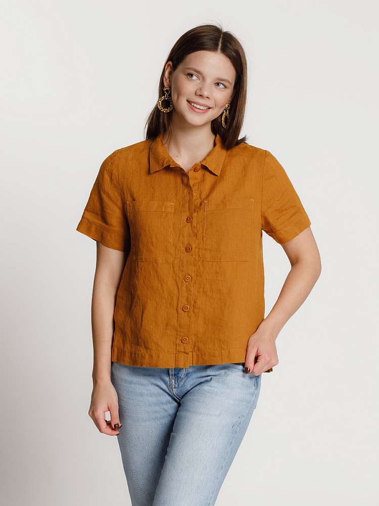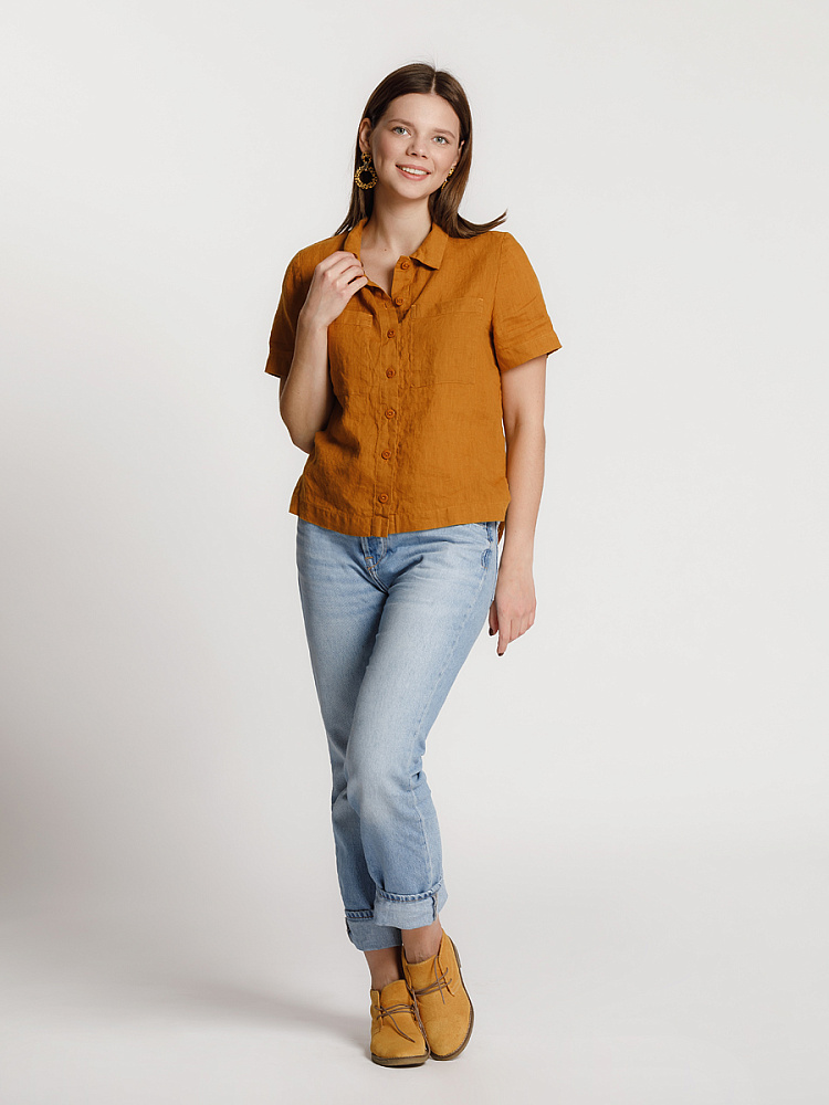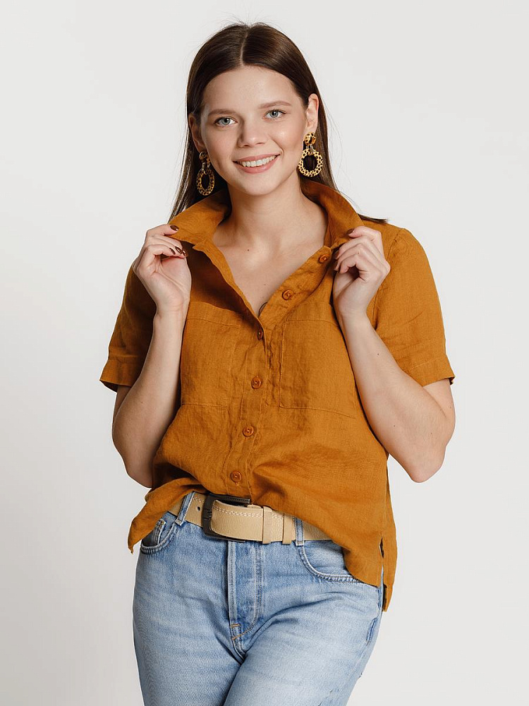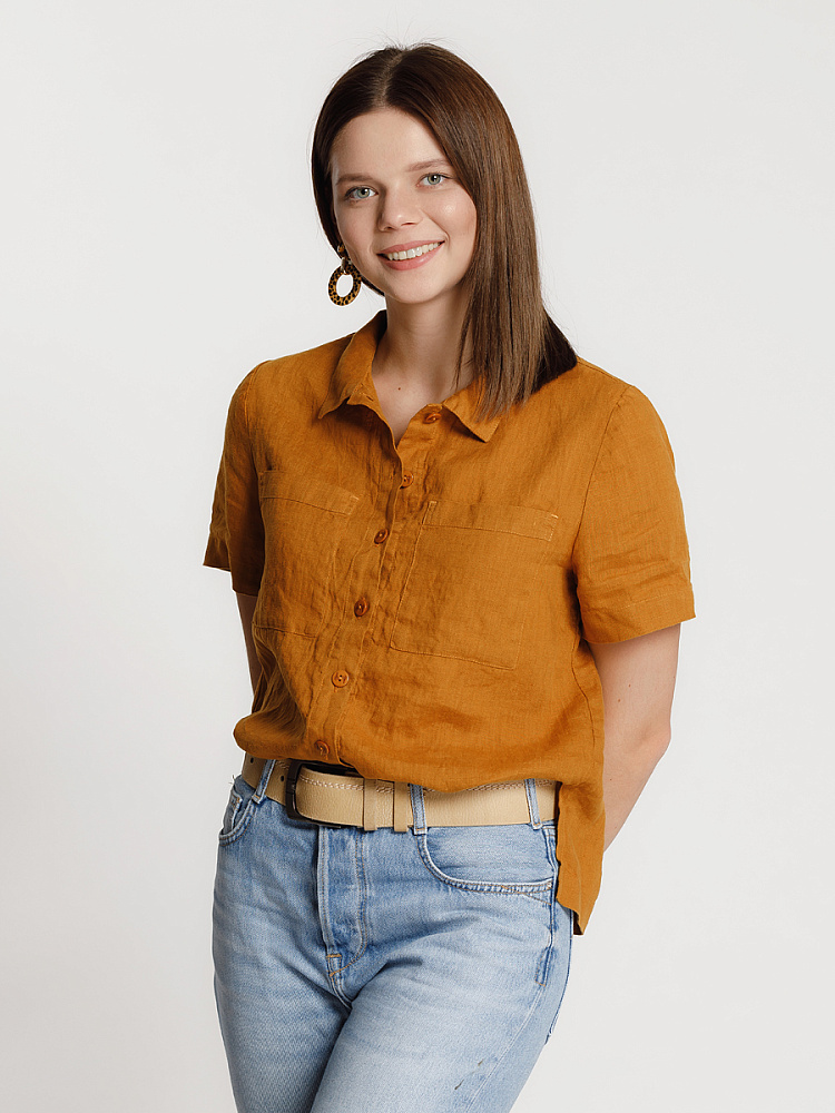 В отличие от скудного мужского вариатива, женская рубашка отличается большим количеством фасонов и стилей. Этот предмет женского гардероба может похвастаться разнообразием длин, силуэтов, формой воротников, видом тканей, количеством декора и сезонным предназначением. Представленная модель рубашки влюбляет в себя с первого взгляда. Прямой крой подарит комфорт и практичность при использовании. Это особенно актуально в тёплый летний период. Сочетание небольшой длинны и короткого рукава – простое и стильное решение, которое диктует носить эту рубашку поверх поясных изделий. Эти условия создают динамичный и свободный внешний вид. Большие накладные карманы, отложной воротник и планка на пуговицы – выказывают неоспоримые доказательства принадлежности к классическим традициям. Органично и неповторимо выглядят декоративные строчки на жатой текстуре натурального льна, который использован для пошива этой модели.