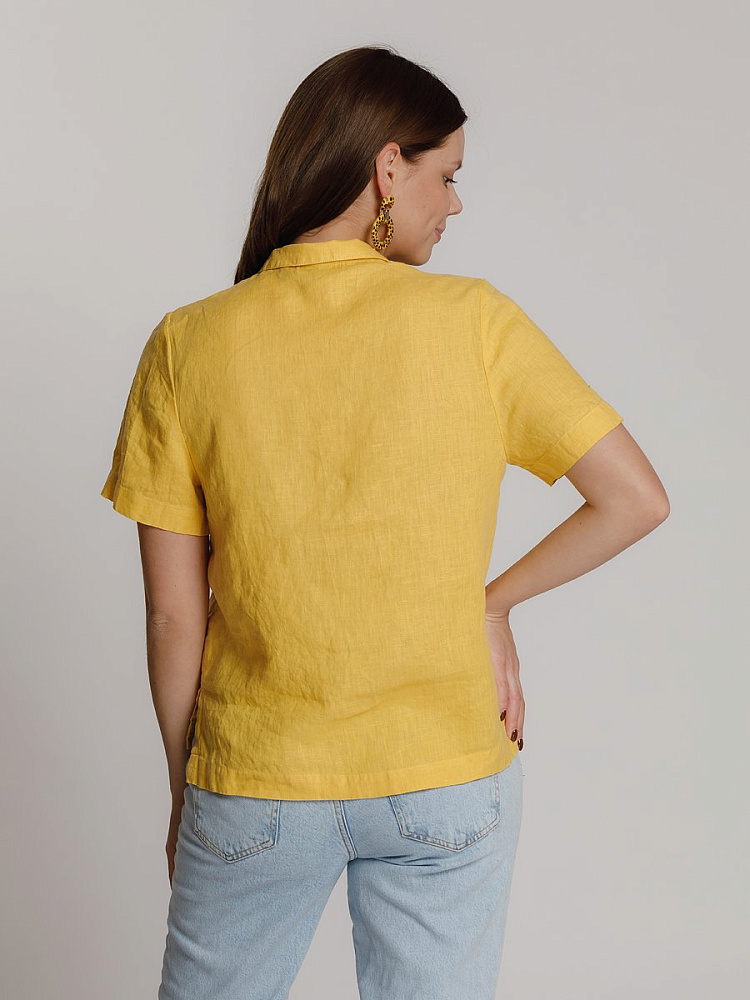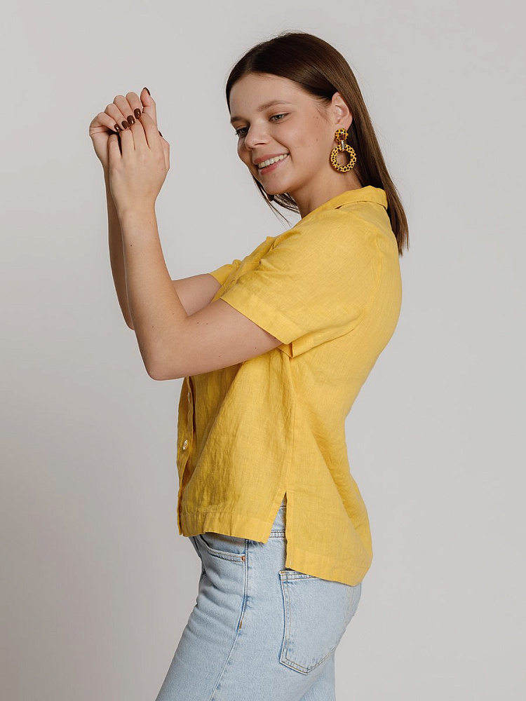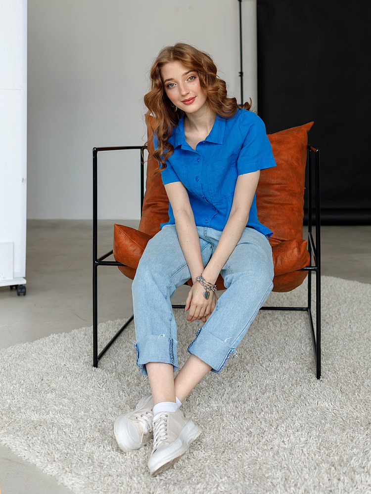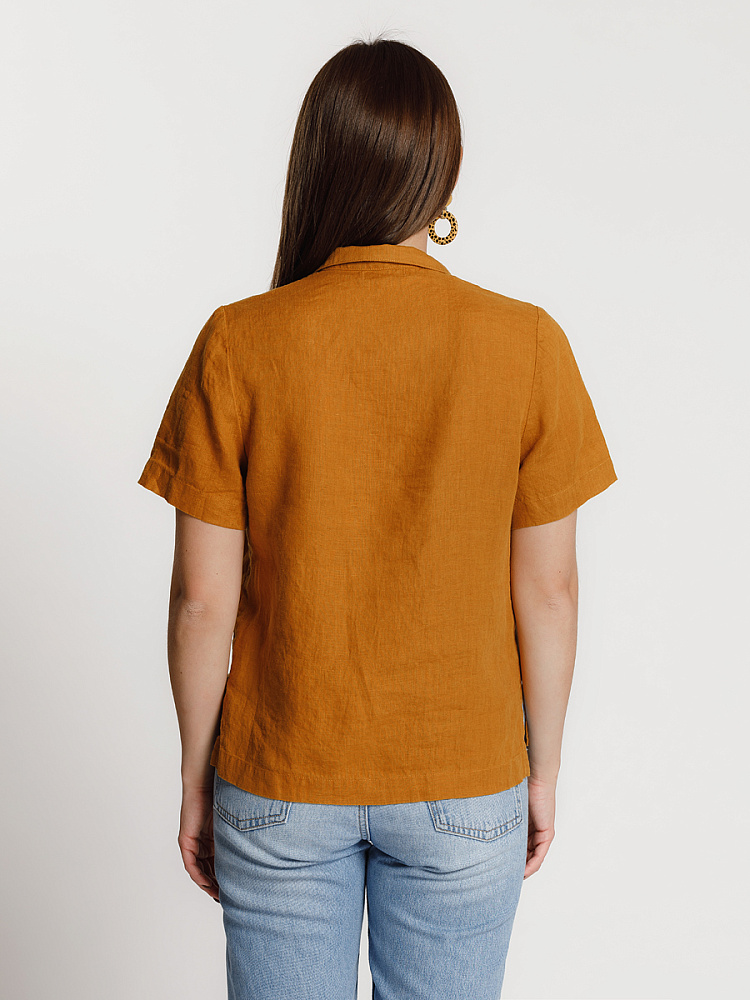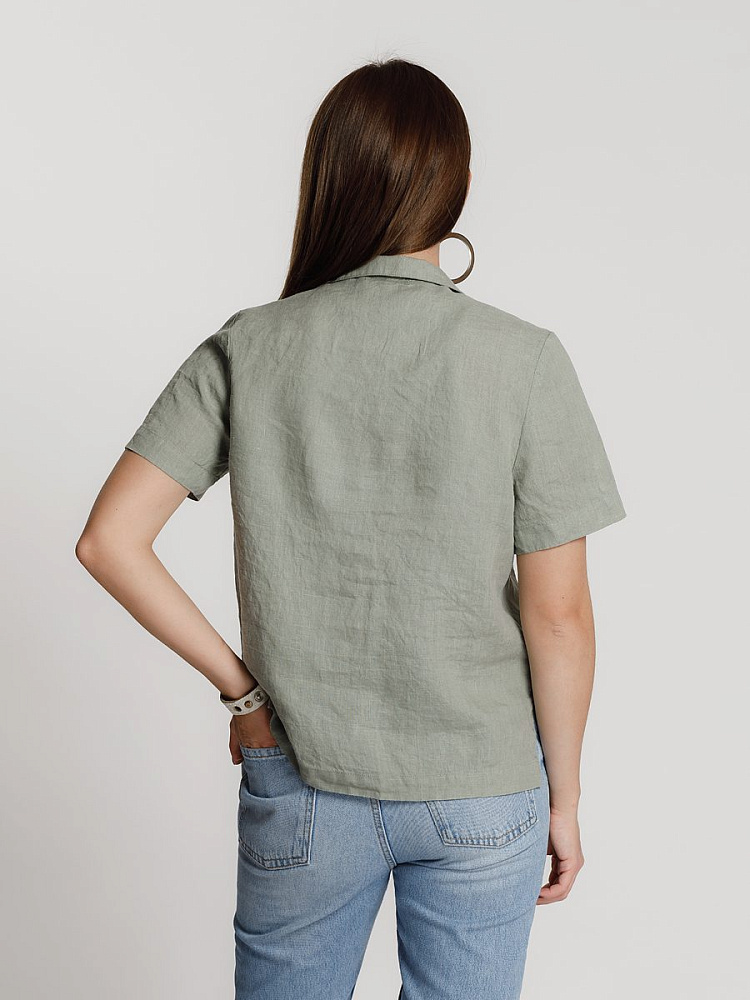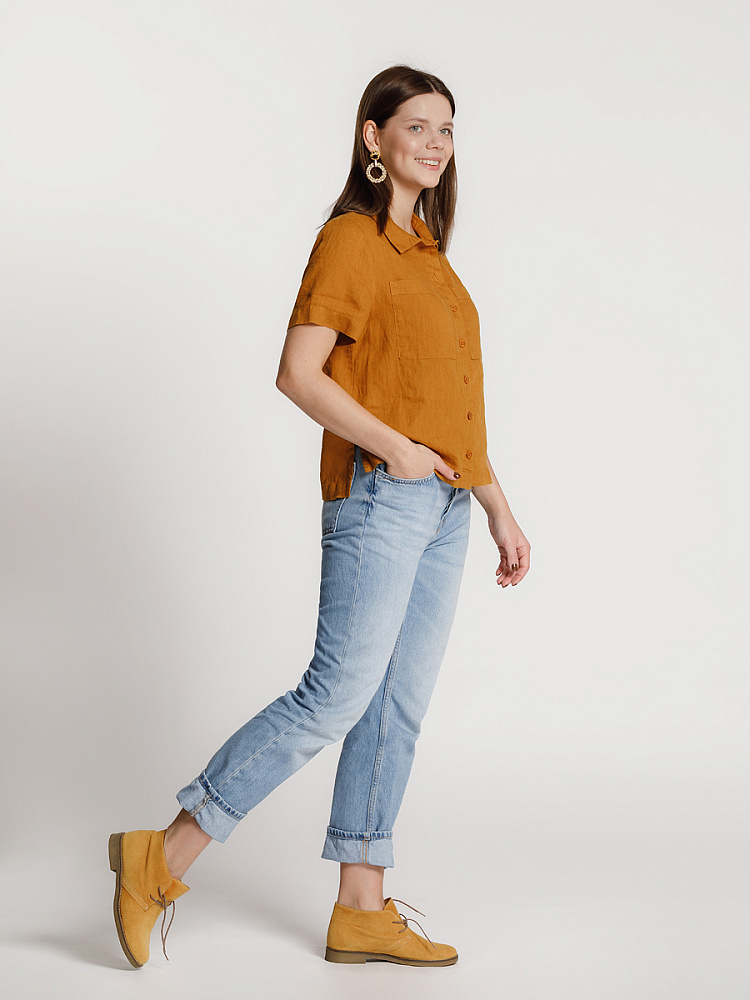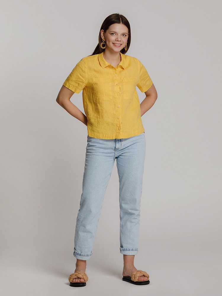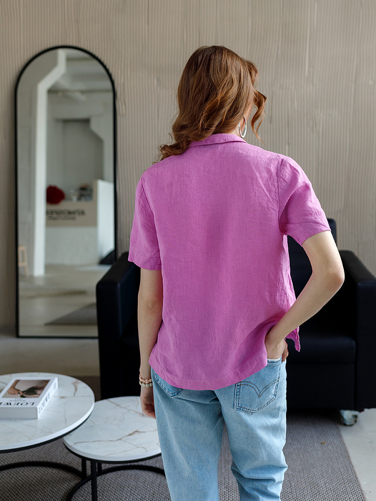 В отличие от скудного мужского вариатива, женская рубашка отличается большим количеством фасонов и стилей. Этот предмет женского гардероба может похвастаться разнообразием длин, силуэтов, формой воротников, видом тканей, количеством декора и сезонным предназначением. Представленная модель рубашки влюбляет в себя с первого взгляда. Прямой крой подарит комфорт и практичность при использовании. Это особенно актуально в тёплый летний период. Сочетание небольшой длинны и короткого рукава – простое и стильное решение, которое диктует носить эту рубашку поверх поясных изделий. Эти условия создают динамичный и свободный внешний вид. Большие накладные карманы, отложной воротник и планка на пуговицы – выказывают неоспоримые доказательства принадлежности к классическим традициям. Органично и неповторимо выглядят декоративные строчки на жатой текстуре натурального льна, который использован для пошива этой модели.
