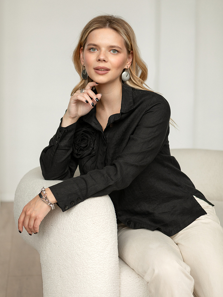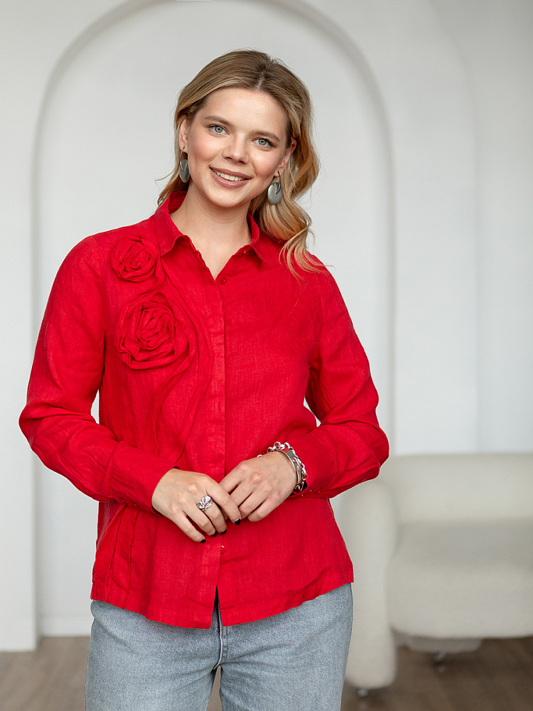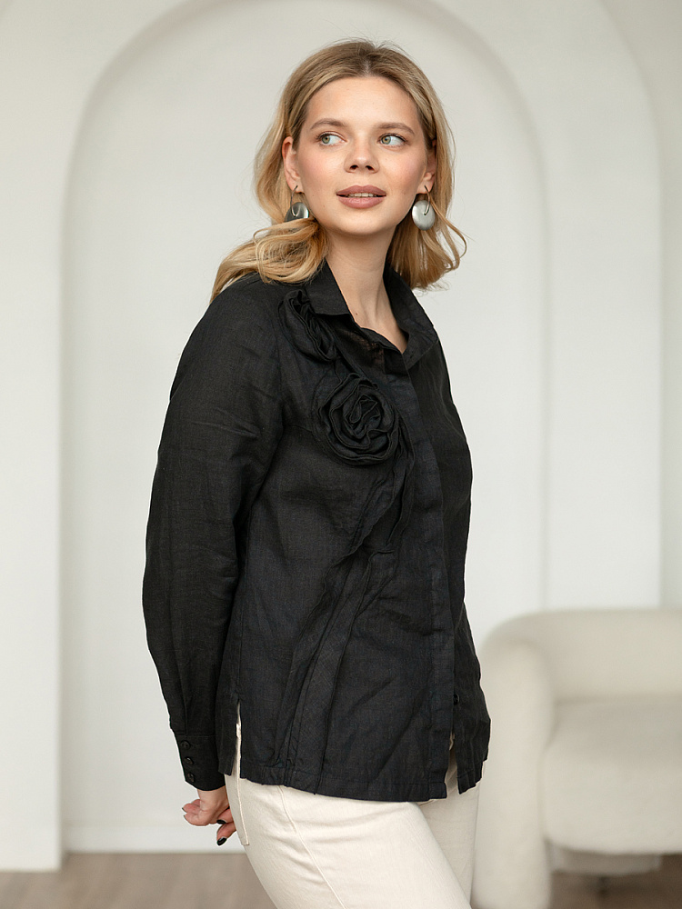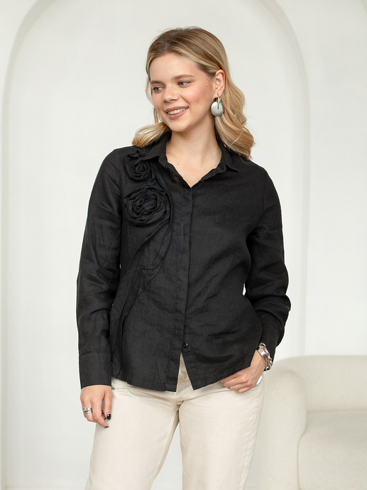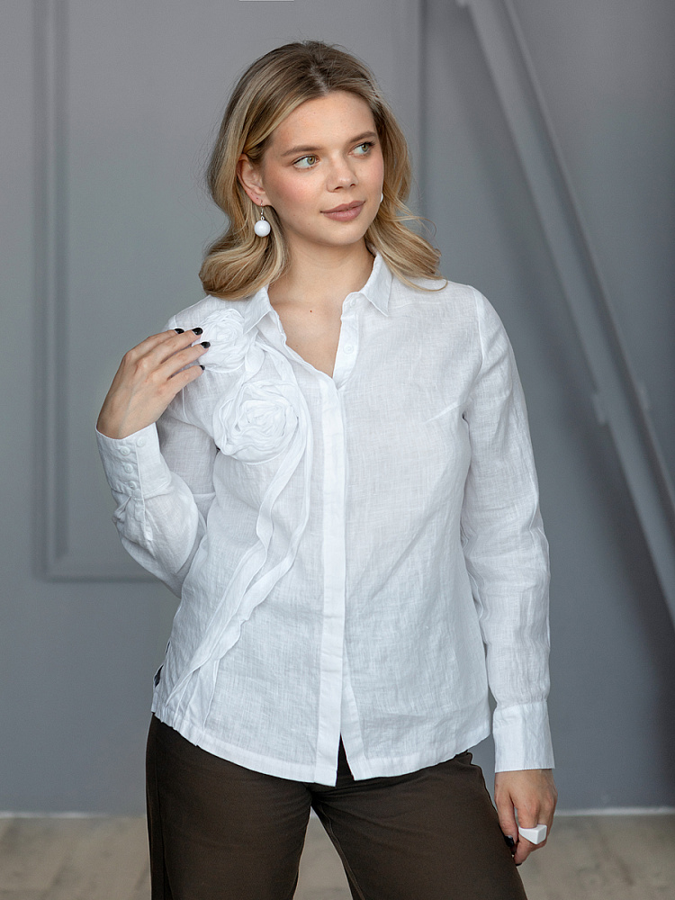 Деловые будни могут быть разными, не только скучными и рутинными. Многое зависит от вашего отношения к процессу и настроения. Дизайнеры марки Kayros сделали попытку скрасить вам серые будни и предлагают обратить внимание на представленную модель блузы. Про неё можно сказать – два в одном. Классический крой блузы – сорочки как основа для стильного и элегантного декора. Прямой полуприлегающий силуэт прост и лаконичен, его практичность не вызывает сомнений. Свободный крой стильно скроет проблемные зоны, не будет предательски их обтягивать. Длина до бёдер универсальна для любых брюк и юбок. Классический стояче-отложной воротник с центральной застёжкой на пуговицы и втачным рукавом с манжетой по низу – всё это характерно для стиля кэжуал, который «верховодит» в деловом гардеробе. Однако, всю эту практичность и привычность дополняет незаурядный цветочный декор. Жатая и рельефная текстура натурального льна позволила создать уникальный и стильный акцент, превращающий базовую модель в авторскую. Витиеватые линии мастерски закручены в соцветия пионов, которые способны поднять настроения и придать уверенности.