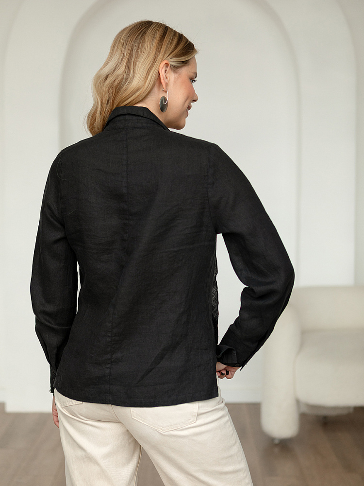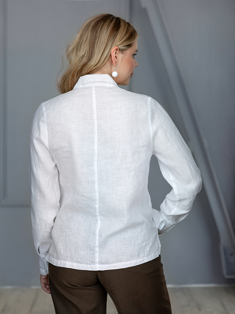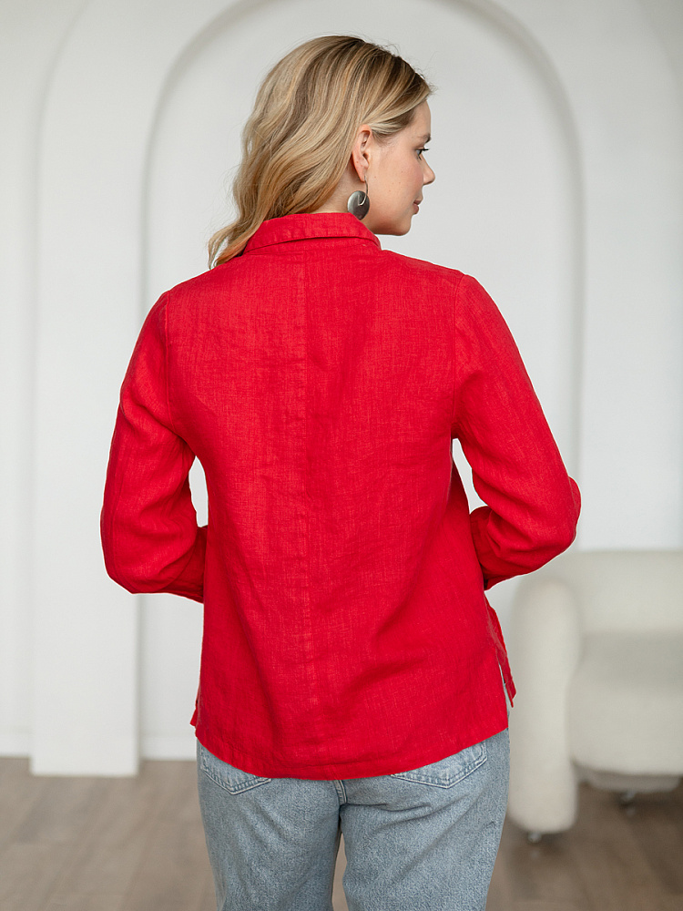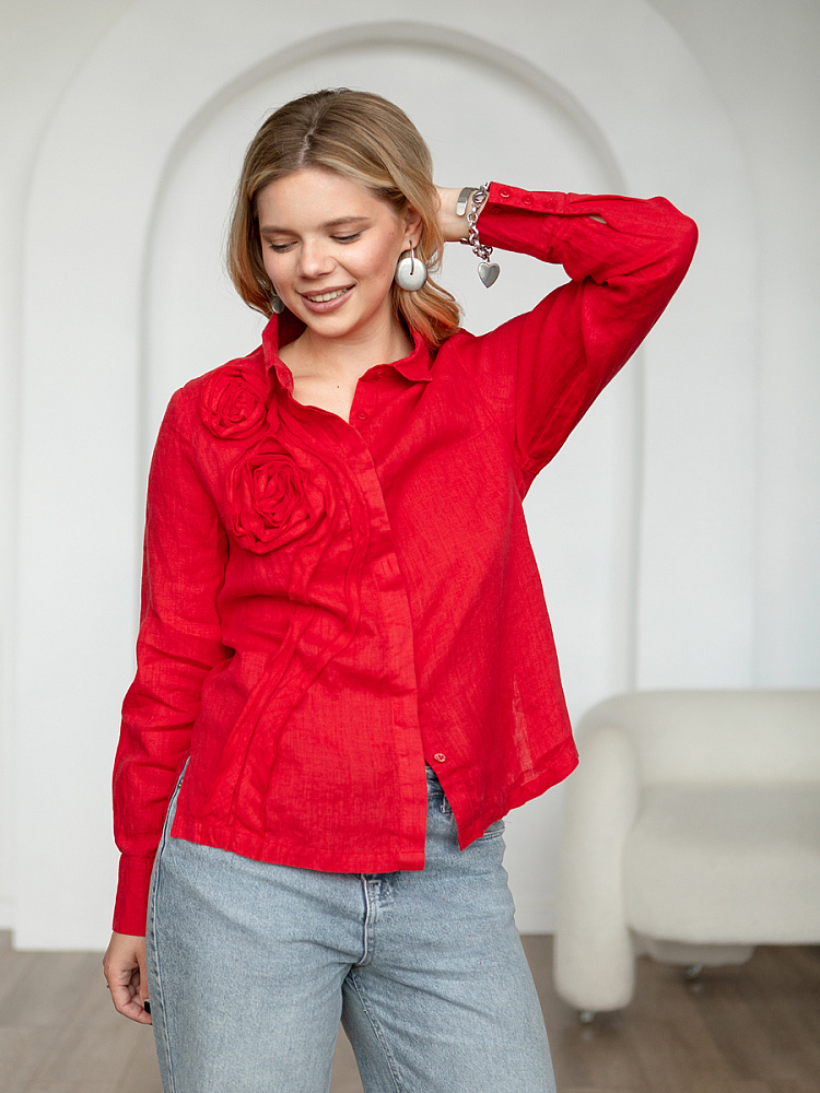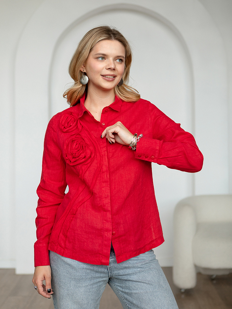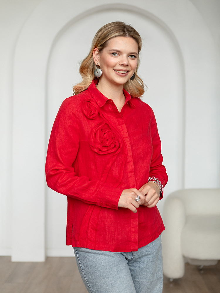 Деловые будни могут быть разными, не только скучными и рутинными. Многое зависит от вашего отношения к процессу и настроения. Дизайнеры марки Kayros сделали попытку скрасить вам серые будни и предлагают обратить внимание на представленную модель блузы. Про неё можно сказать – два в одном. Классический крой блузы – сорочки как основа для стильного и элегантного декора. Прямой полуприлегающий силуэт прост и лаконичен, его практичность не вызывает сомнений. Свободный крой стильно скроет проблемные зоны, не будет предательски их обтягивать. Длина до бёдер универсальна для любых брюк и юбок. Классический стояче-отложной воротник с центральной застёжкой на пуговицы и втачным рукавом с манжетой по низу – всё это характерно для стиля кэжуал, который «верховодит» в деловом гардеробе. Однако, всю эту практичность и привычность дополняет незаурядный цветочный декор. Жатая и рельефная текстура натурального льна позволила создать уникальный и стильный акцент, превращающий базовую модель в авторскую. Витиеватые линии мастерски закручены в соцветия пионов, которые способны поднять настроения и придать уверенности.