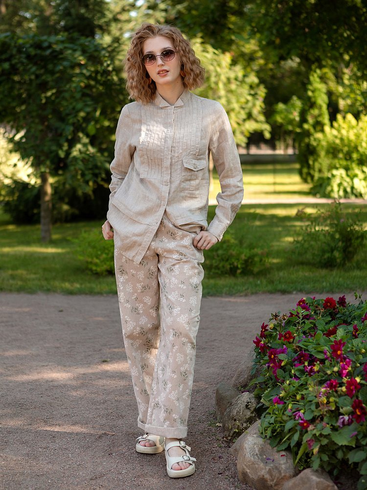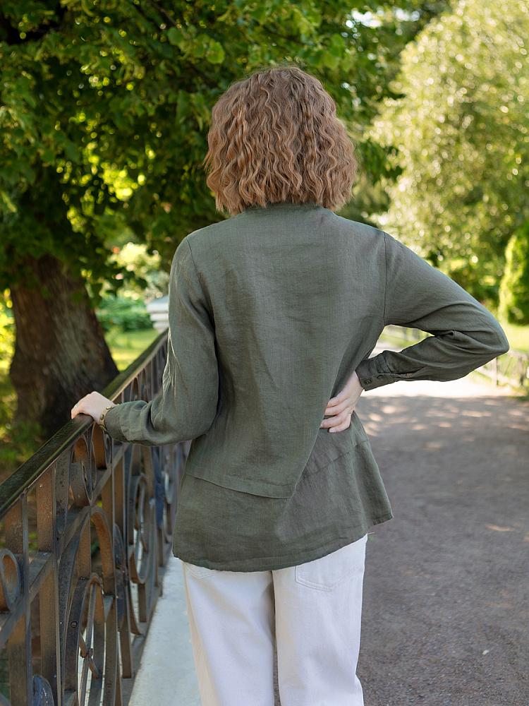 Блуза из льна – практичное решение на каждый день. Мало того что натуральный лён хорошо вентилируется и отводит влагу, что позволяет коже дышать. Ещё он весьма неприхотлив. После стирки можно не гладит изделие. Лёгкая небрежность в виде жатой текстуры придадут благородную небрежность образу. Представленная модель блузы изобилует декоративными элементами, которые интересно изучат взглядом. Прямой силуэт обладает длиной чуть ниже линии бёдер, диктуя нам носить модель поверх поясных изделий. Горизонтальная складка на полочке и спинке создаёт пропорции более удлинённой верхней части, что придаёт роста женской фигуре. Вставка на полочке с многочисленными складками заполняет собой всё пространство, создавая объёмную текстуру. На таком многообразии линий можно заметить ассиметричный накладной карман, который также привносит оригинальности. И конечно из виду не ускользнёт оригинальная конструкция воротника – стойки с загнутыми кончиками. А вот внимания чтобы заметить различное расположение пуговиц на планке уже не хватает.