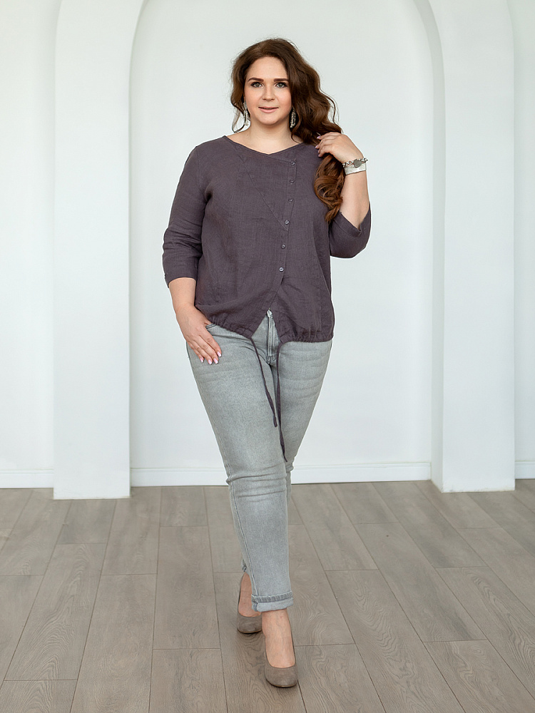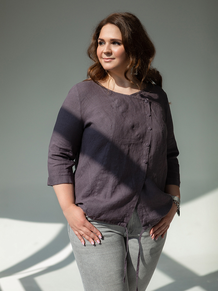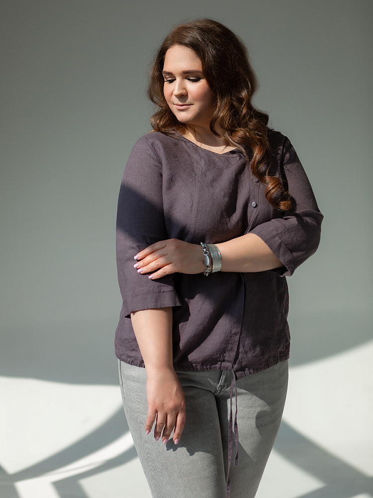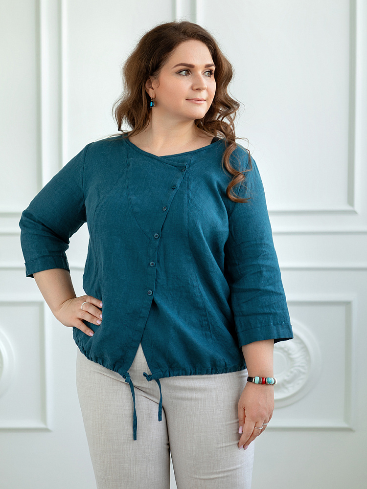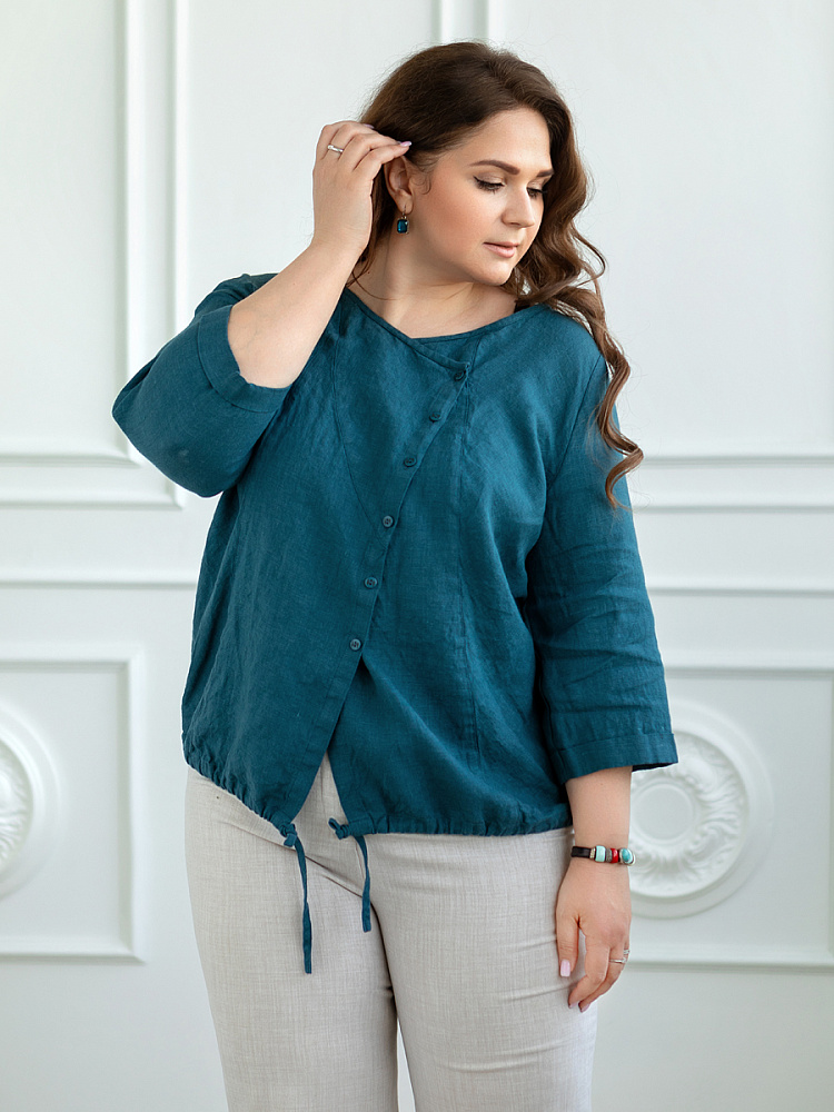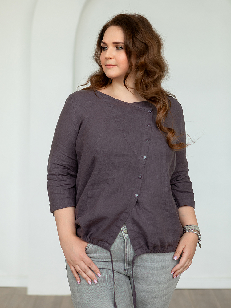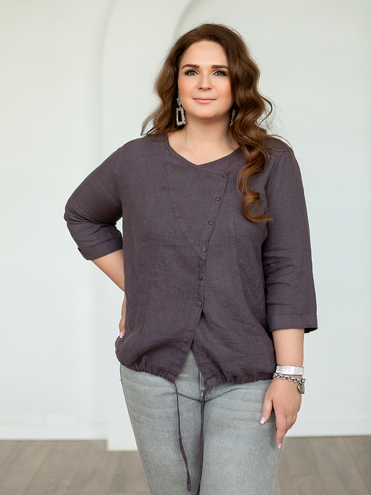 Блузам в женском гардеробе отводится значимая роль. Они выполняют много самых разнообразных задач, потому что это очень универсальный предмет гардероба. По средствам одной модели можно создать много различных дуэтов и образов. Поэтому их должно быть в достаточном количестве в вашем гардеробе. Но уверены, у женщин весомых достоинств возникают проблемы с этим. Производители не всегда могут порадовать эту категорию покупательниц разнообразием выбора. Не переживайте милые дамы, обратите внимание на представленную модель блузы из натурального льна! Оригинальный и лаконичный образ порадует вас, а натуральная ткань подарит массу приятных тактильных ощущений. Прямой крой не обтягивает фигуру, маскируя проблемные участки. Кулиса по низу позволяет придать силуэтным формам шарм и обаяния. Смещённая ассиметричная застёжка на пуговицы не только выполняет свой функционал, но и является яркой декоративной частью блузы. Лёгкости внешнему виду придаёт отсутствие каких-либо воротников. Округлый вырез горловины, обработанный кантом логичен в духе всей стилистической задумки.