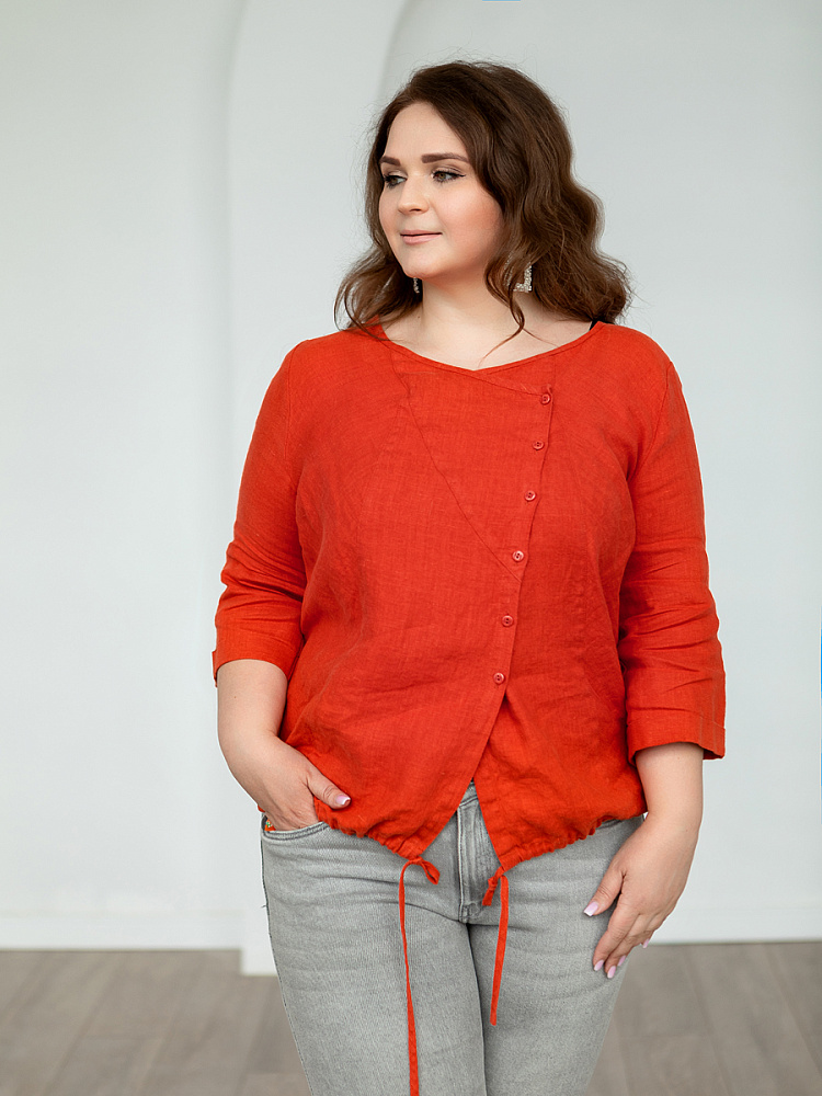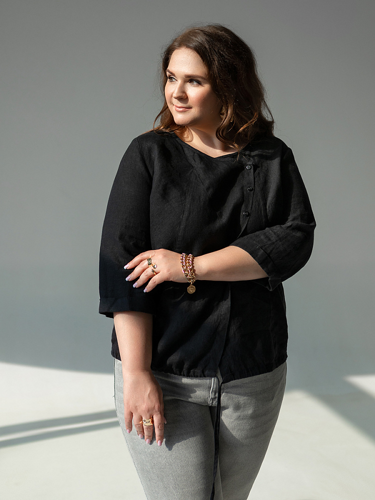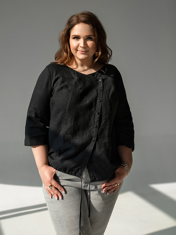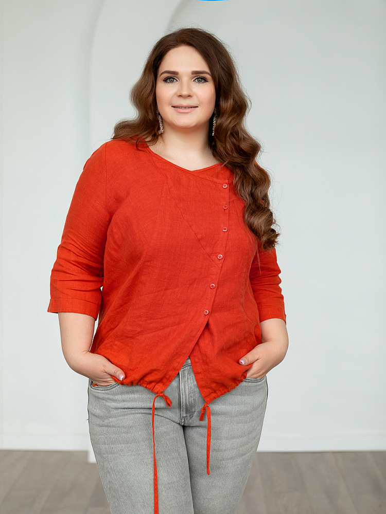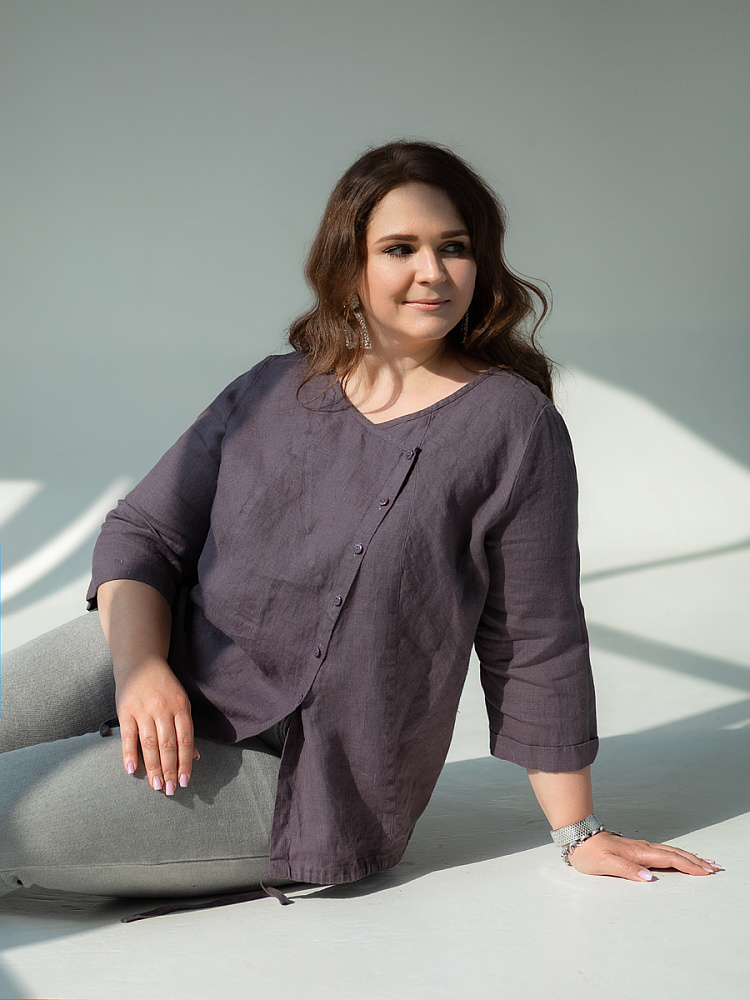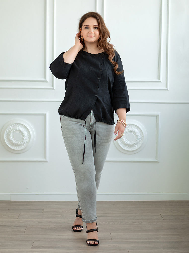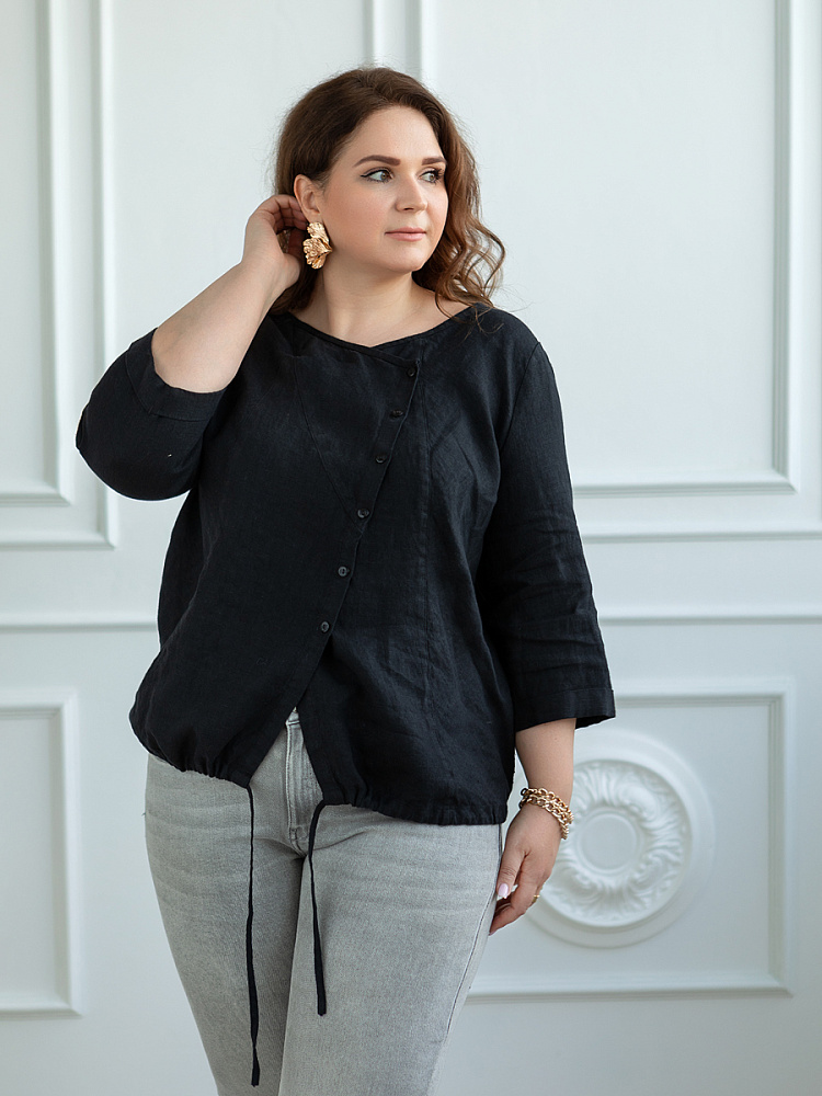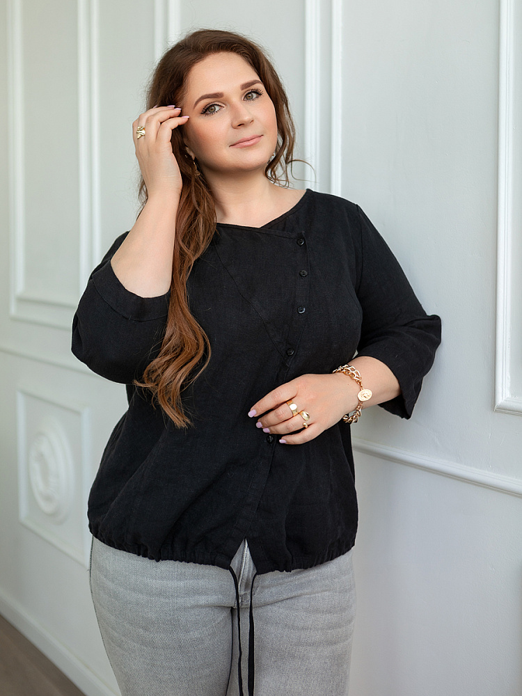 Блузам в женском гардеробе отводится значимая роль. Они выполняют много самых разнообразных задач, потому что это очень универсальный предмет гардероба. По средствам одной модели можно создать много различных дуэтов и образов. Поэтому их должно быть в достаточном количестве в вашем гардеробе. Но уверены, у женщин весомых достоинств возникают проблемы с этим. Производители не всегда могут порадовать эту категорию покупательниц разнообразием выбора. Не переживайте милые дамы, обратите внимание на представленную модель блузы из натурального льна! Оригинальный и лаконичный образ порадует вас, а натуральная ткань подарит массу приятных тактильных ощущений. Прямой крой не обтягивает фигуру, маскируя проблемные участки. Кулиса по низу позволяет придать силуэтным формам шарм и обаяния. Смещённая ассиметричная застёжка на пуговицы не только выполняет свой функционал, но и является яркой декоративной частью блузы. Лёгкости внешнему виду придаёт отсутствие каких-либо воротников. Округлый вырез горловины, обработанный кантом логичен в духе всей стилистической задумки.