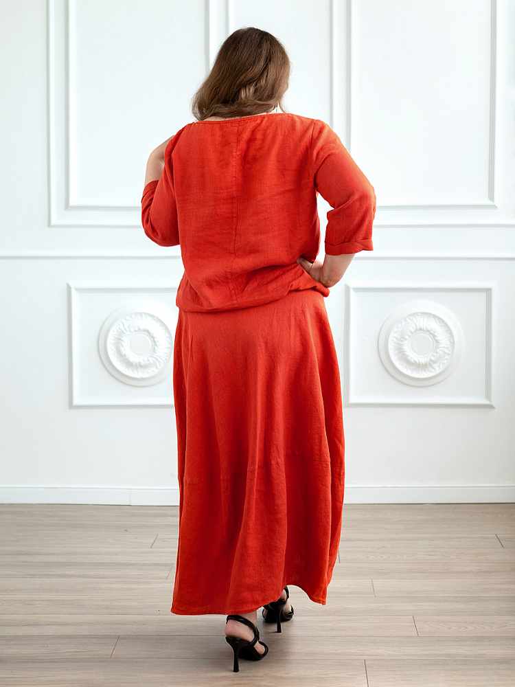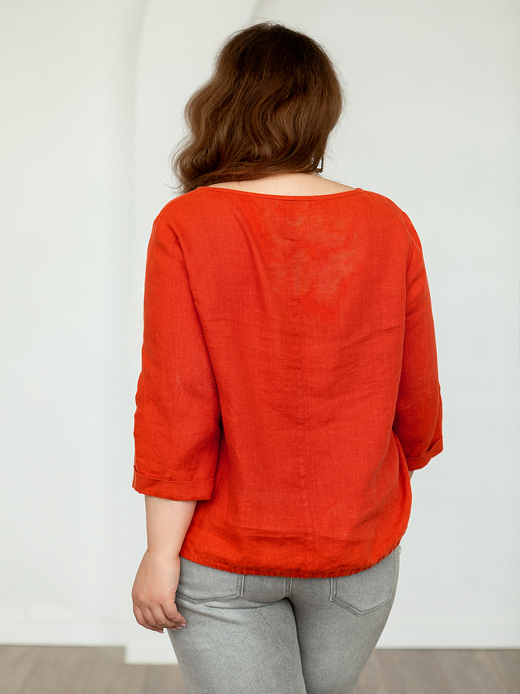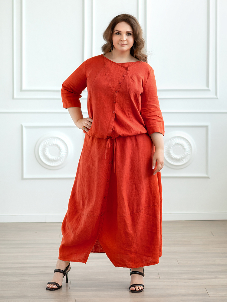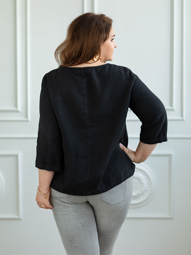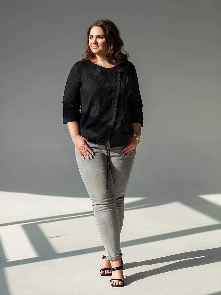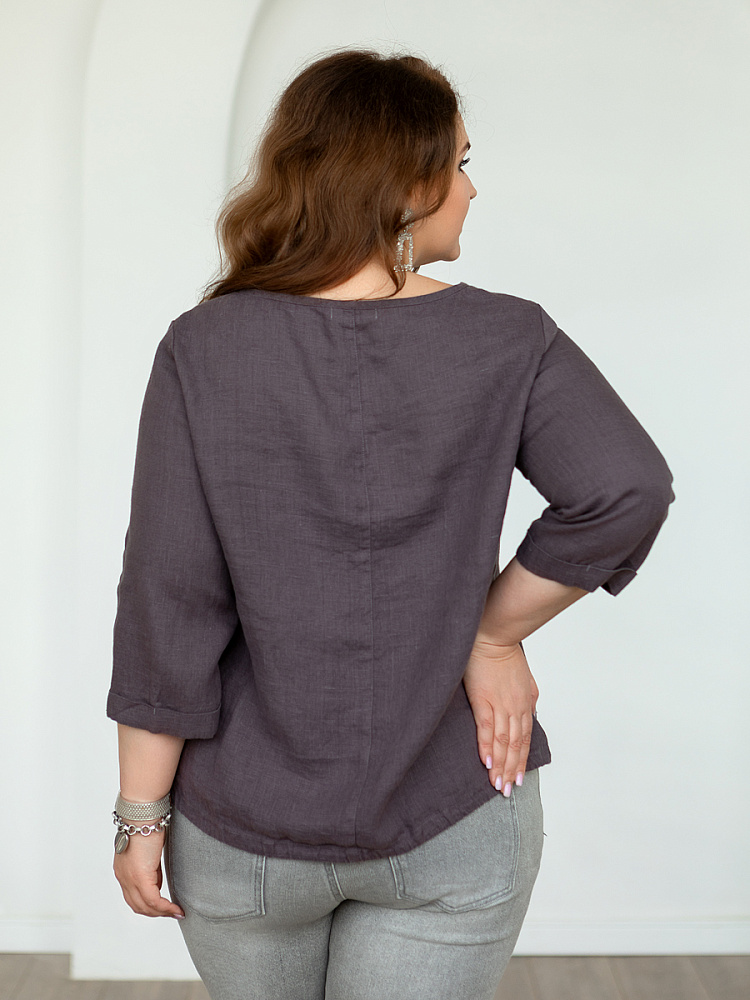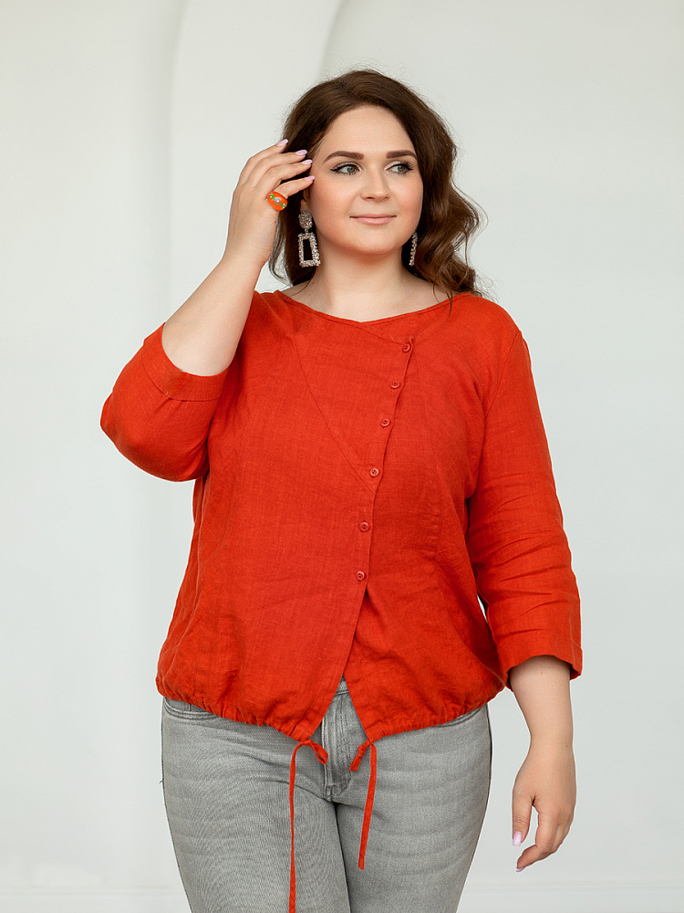 Блузам в женском гардеробе отводится значимая роль. Они выполняют много самых разнообразных задач, потому что это очень универсальный предмет гардероба. По средствам одной модели можно создать много различных дуэтов и образов. Поэтому их должно быть в достаточном количестве в вашем гардеробе. Но уверены, у женщин весомых достоинств возникают проблемы с этим. Производители не всегда могут порадовать эту категорию покупательниц разнообразием выбора. Не переживайте милые дамы, обратите внимание на представленную модель блузы из натурального льна! Оригинальный и лаконичный образ порадует вас, а натуральная ткань подарит массу приятных тактильных ощущений. Прямой крой не обтягивает фигуру, маскируя проблемные участки. Кулиса по низу позволяет придать силуэтным формам шарм и обаяния. Смещённая ассиметричная застёжка на пуговицы не только выполняет свой функционал, но и является яркой декоративной частью блузы. Лёгкости внешнему виду придаёт отсутствие каких-либо воротников. Округлый вырез горловины, обработанный кантом логичен в духе всей стилистической задумки.