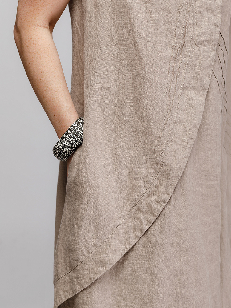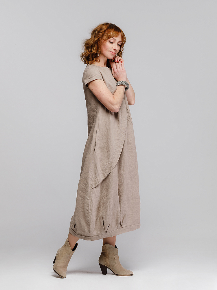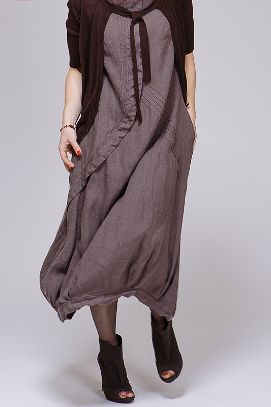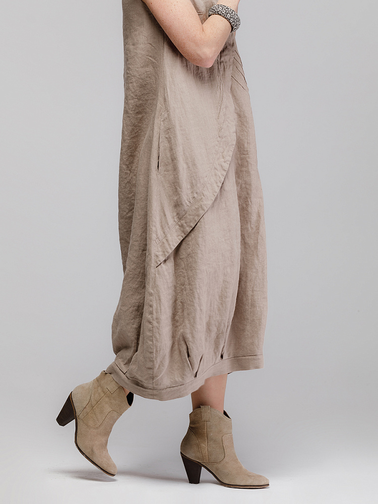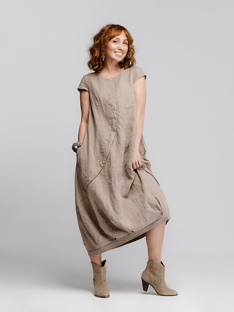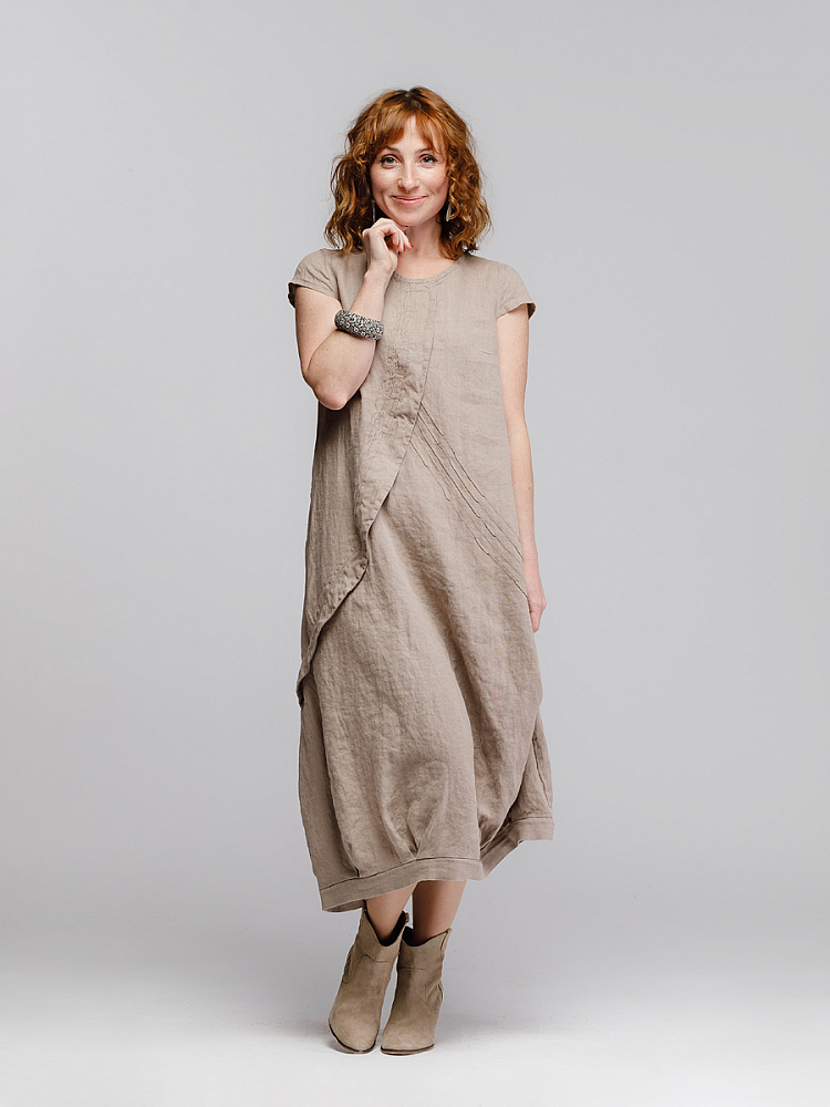 Подобно смелым движениям кисти художника, на этом платье выполнены диагональные строчки и защипы, в самом центре нашего внимания. А само платье выступает в роли холста, с весьма оригинальной текстурой льна. Дизайнер мастерски присборил длину миди по низу, создав неповторимый женский силуэт.