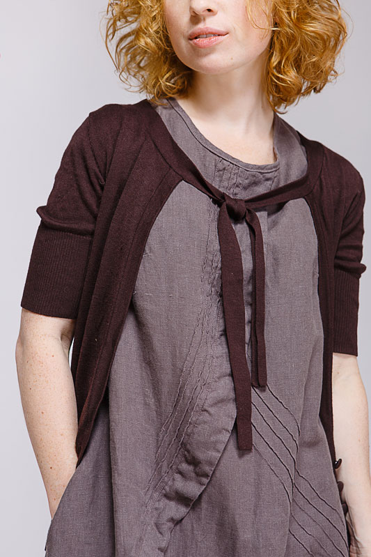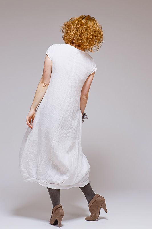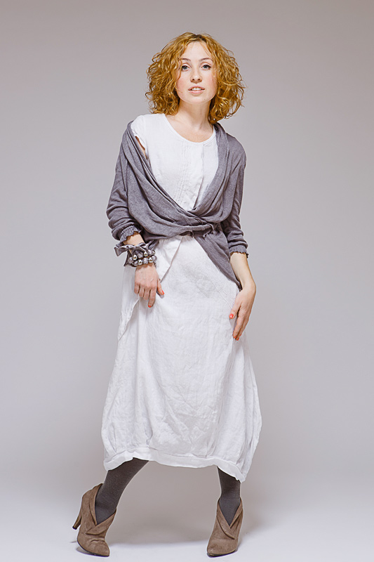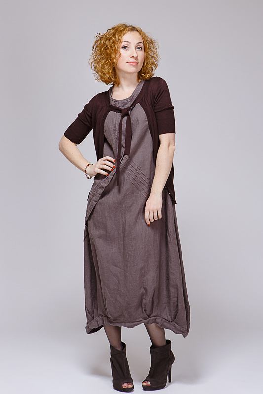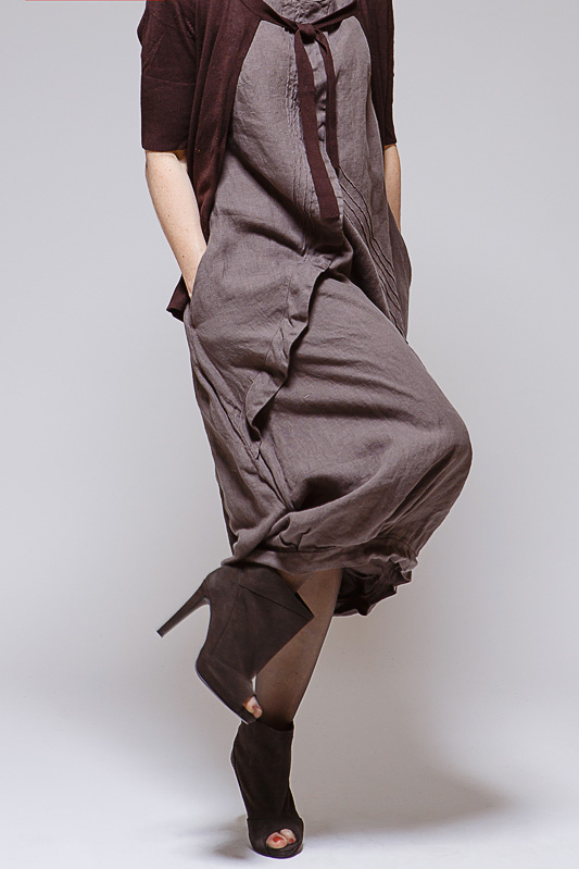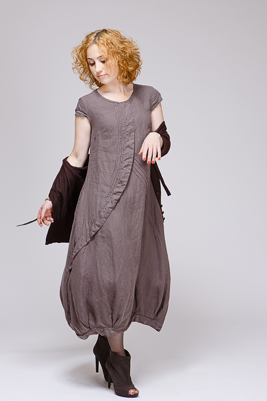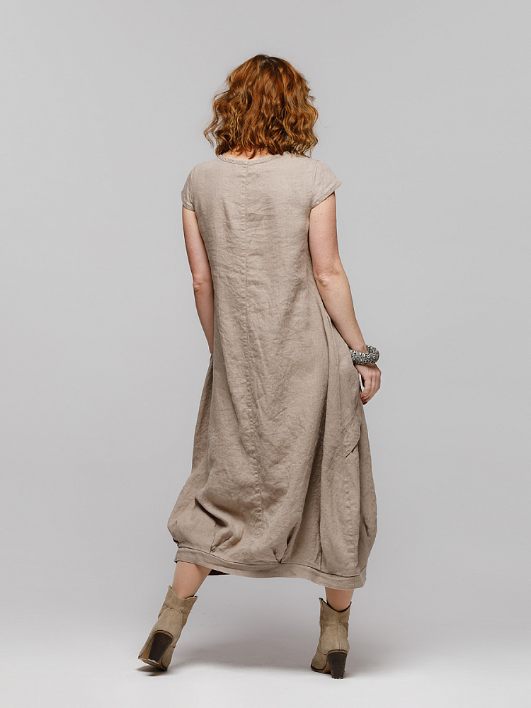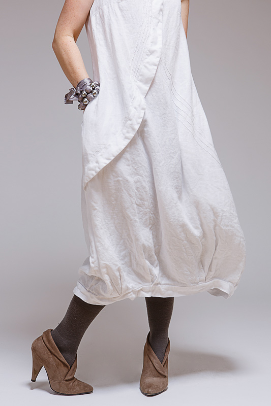 Подобно смелым движениям кисти художника, на этом платье выполнены диагональные строчки и защипы, в самом центре нашего внимания. А само платье выступает в роли холста, с весьма оригинальной текстурой льна. Дизайнер мастерски присборил длину миди по низу, создав неповторимый женский силуэт.