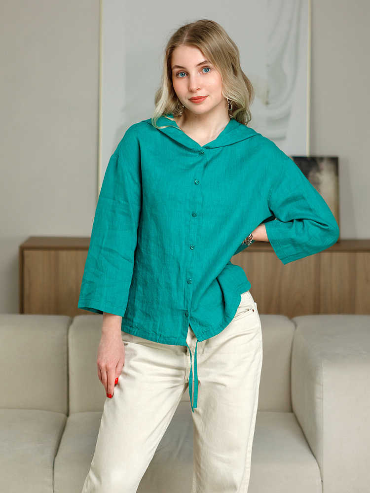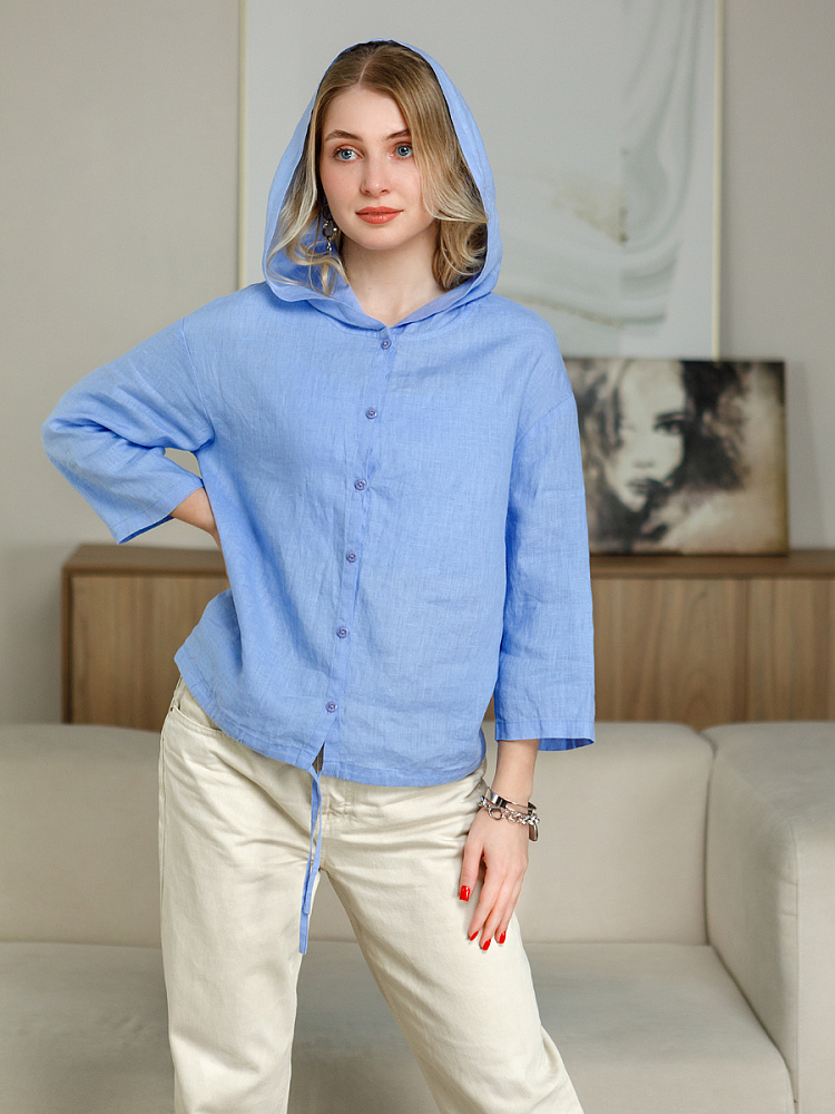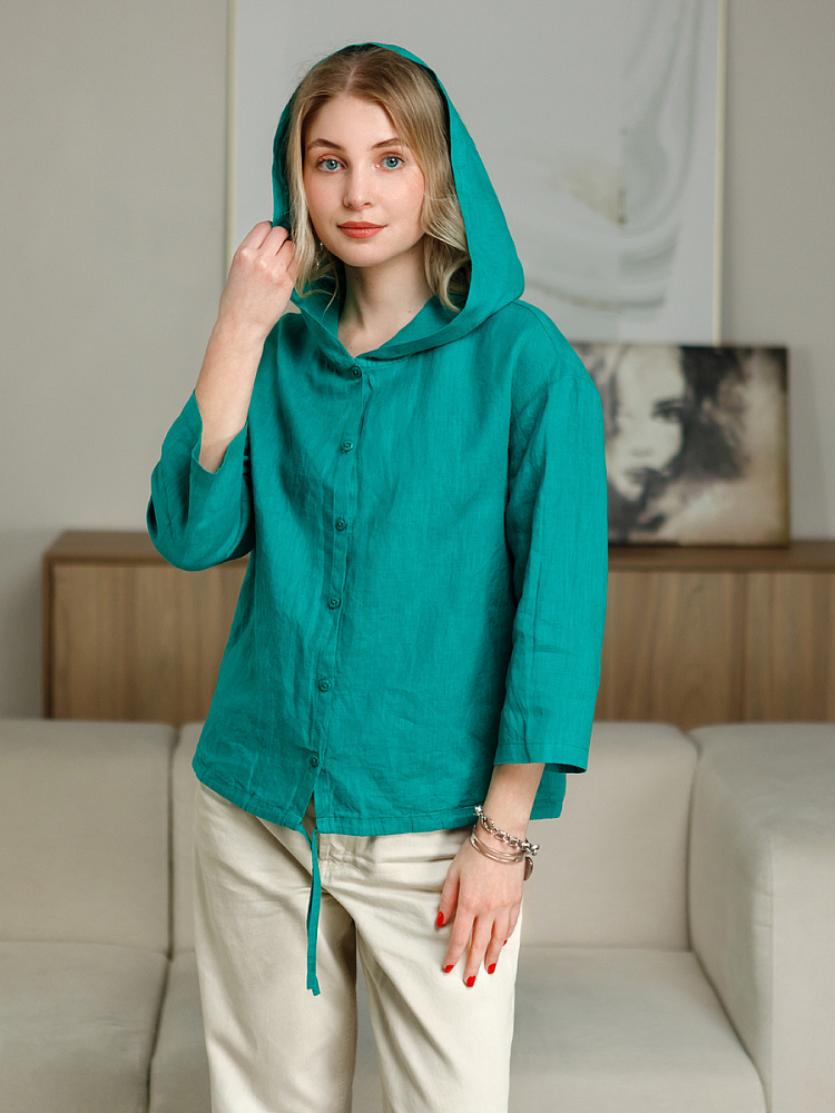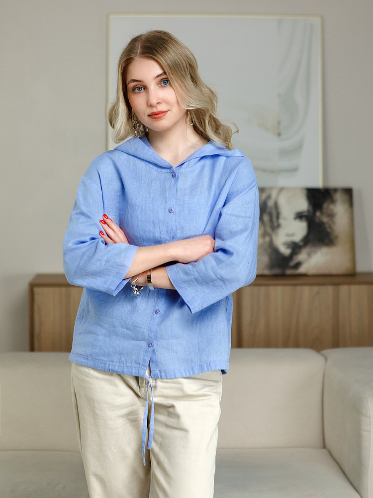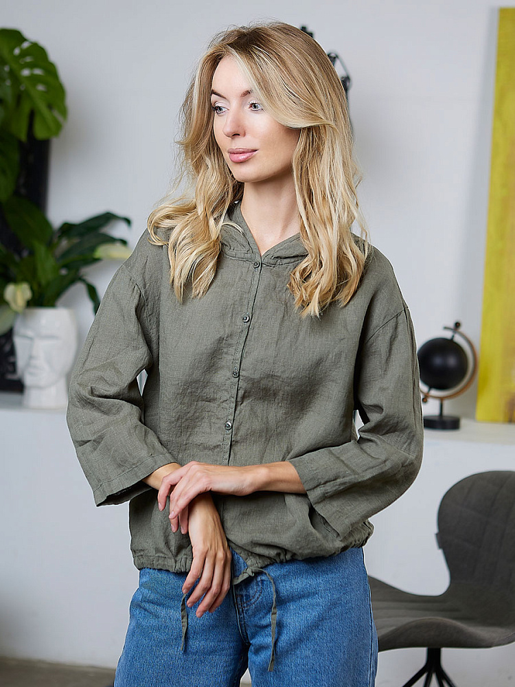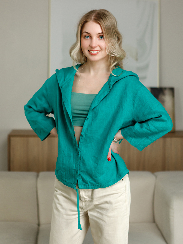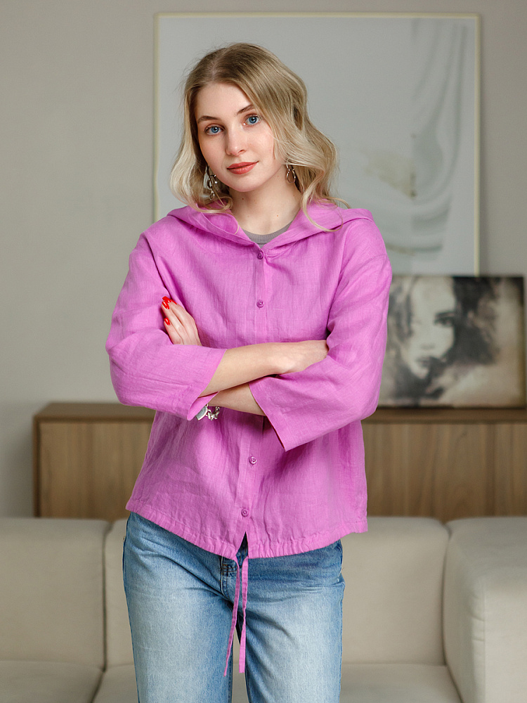 Лаконичность форм и декора демонстрирует представленная модель блузы. Простота и непринуждённость во всём. Прямой свободный крой подкупает своим комфортом. Укороченная длинна рассчитана на энергичные и смелые натуры. Она прекрасна для различных сочетаний с джинсами, брюками и юбками. «Минимализм» форм поддерживает укороченный рукав. О спортивном характере свидетельствует капюшон, наличие которого привносит в образ лёгкую непринуждённость. Модель лишена привычных застёжек – тонкий кант по краю борта фиксирует на маленькие пуговки. Согласитесь, креативное решение! Кулиса по низу изделия способна задать силуэту округлые формы. Жатая текстура натурального льна придаёт изделию неповторимые черты. Можете не тревожиться о внешнем виде изделия, если вы в поездке. Она прекрасно перенесёт любой чемодан или сумку. Представленная модель «выручит» вас в любых ситуациях.