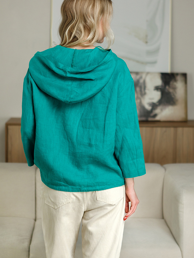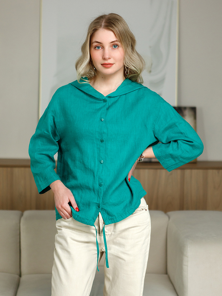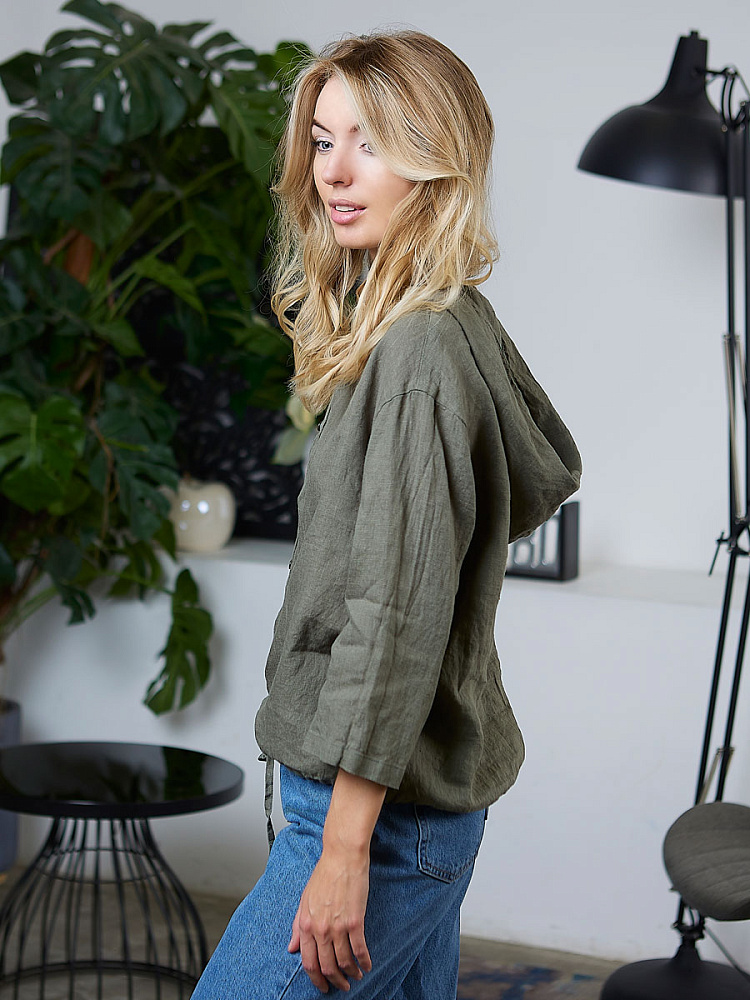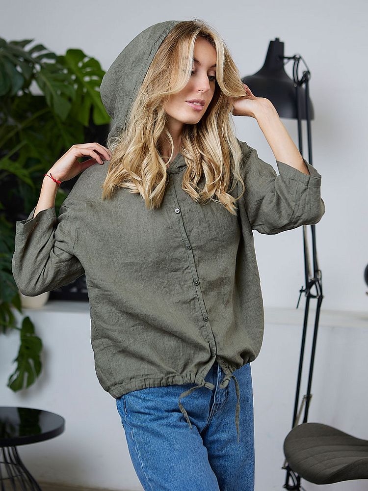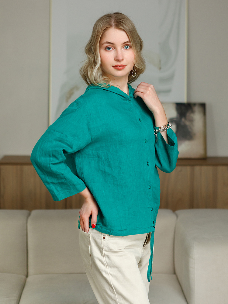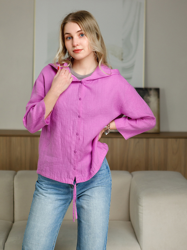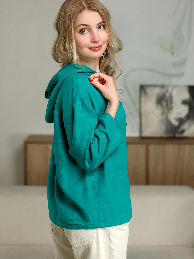Лаконичность форм и декора демонстрирует представленная модель блузы. Простота и непринуждённость во всём. Прямой свободный крой подкупает своим комфортом. Укороченная длинна рассчитана на энергичные и смелые натуры. Она прекрасна для различных сочетаний с джинсами, брюками и юбками. «Минимализм» форм поддерживает укороченный рукав. О спортивном характере свидетельствует капюшон, наличие которого привносит в образ лёгкую непринуждённость. Модель лишена привычных застёжек – тонкий кант по краю борта фиксирует на маленькие пуговки. Согласитесь, креативное решение! Кулиса по низу изделия способна задать силуэту округлые формы. Жатая текстура натурального льна придаёт изделию неповторимые черты. Можете не тревожиться о внешнем виде изделия, если вы в поездке. Она прекрасно перенесёт любой чемодан или сумку. Представленная модель «выручит» вас в любых ситуациях.