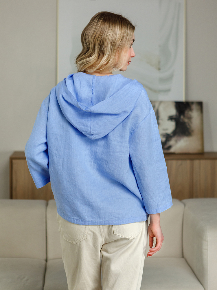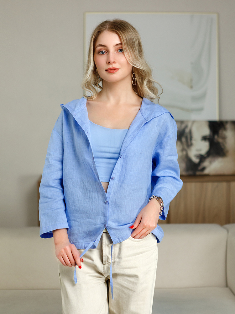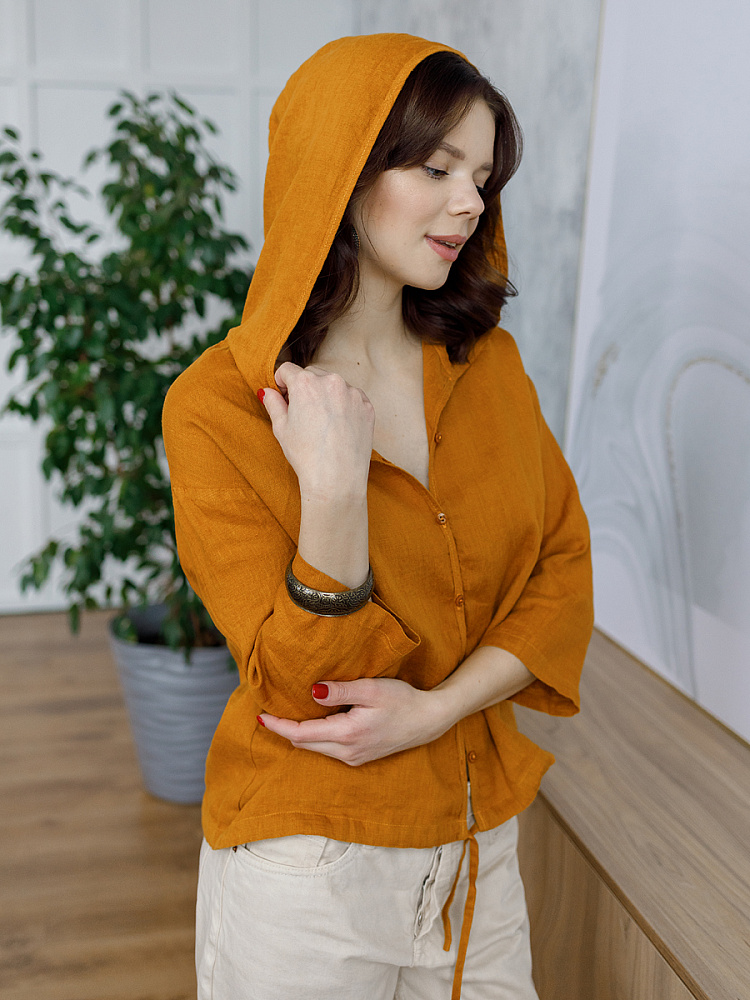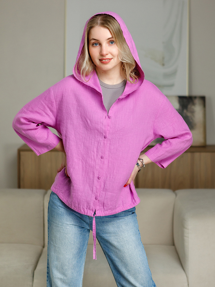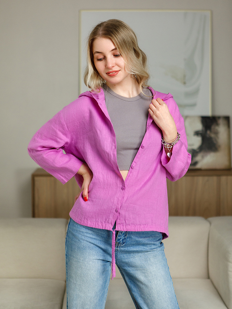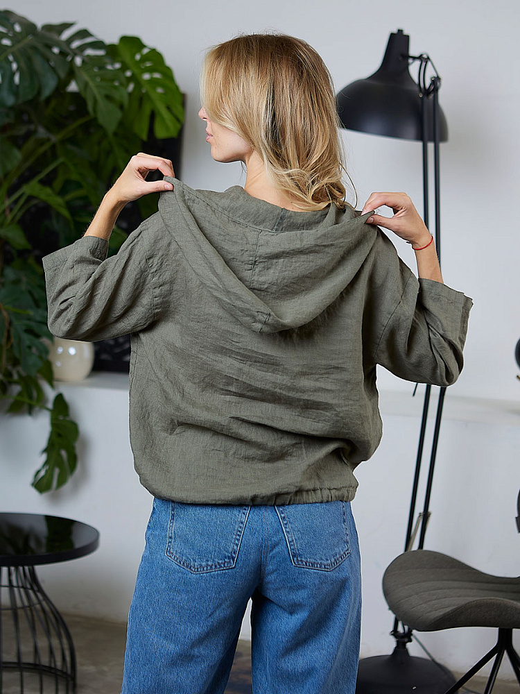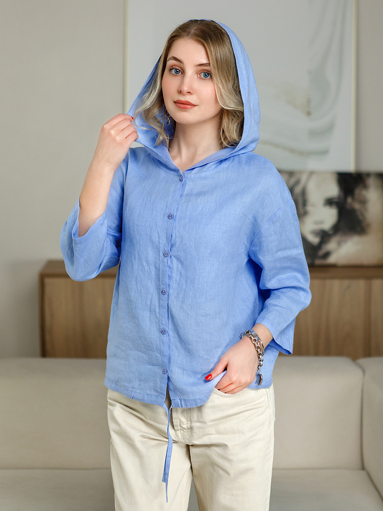 Лаконичность форм и декора демонстрирует представленная модель блузы. Простота и непринуждённость во всём. Прямой свободный крой подкупает своим комфортом. Укороченная длинна рассчитана на энергичные и смелые натуры. Она прекрасна для различных сочетаний с джинсами, брюками и юбками. «Минимализм» форм поддерживает укороченный рукав. О спортивном характере свидетельствует капюшон, наличие которого привносит в образ лёгкую непринуждённость. Модель лишена привычных застёжек – тонкий кант по краю борта фиксирует на маленькие пуговки. Согласитесь, креативное решение! Кулиса по низу изделия способна задать силуэту округлые формы. Жатая текстура натурального льна придаёт изделию неповторимые черты. Можете не тревожиться о внешнем виде изделия, если вы в поездке. Она прекрасно перенесёт любой чемодан или сумку. Представленная модель «выручит» вас в любых ситуациях.