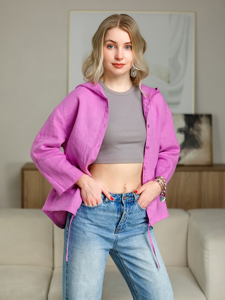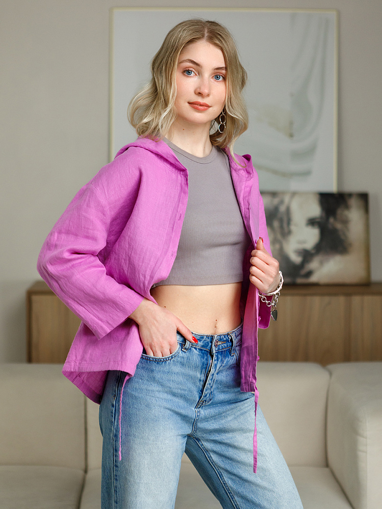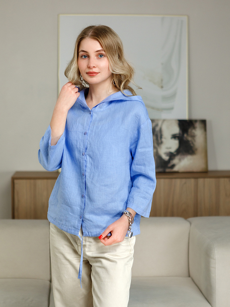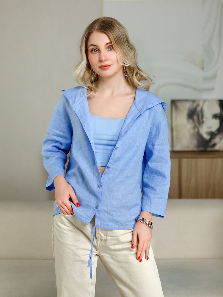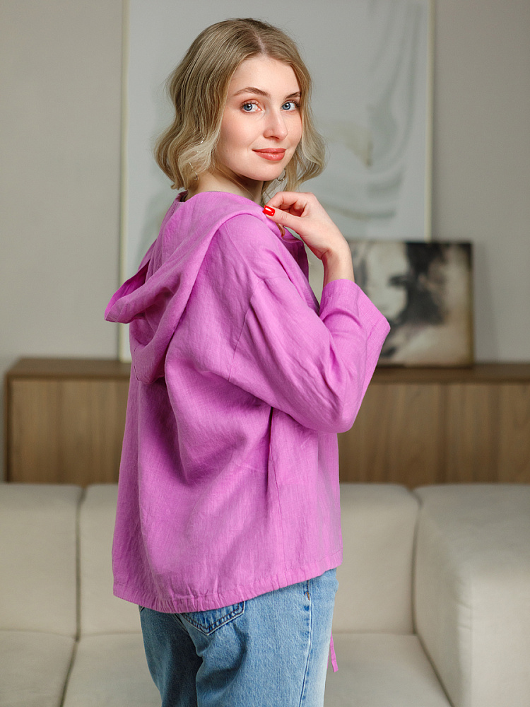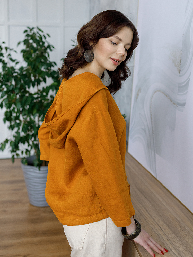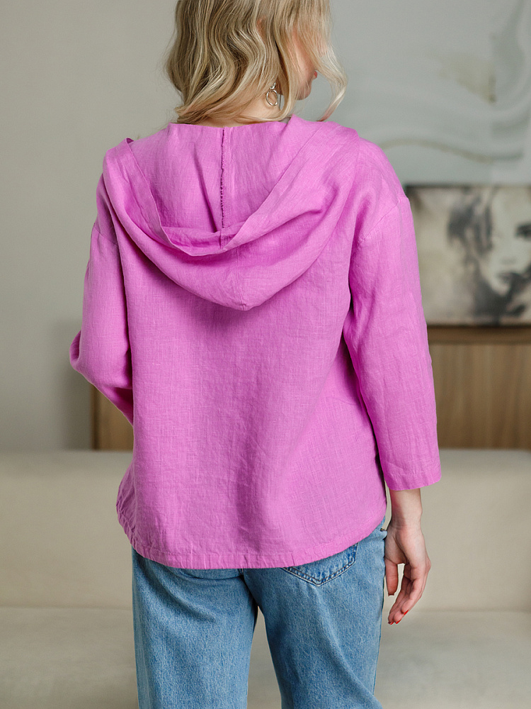 Лаконичность форм и декора демонстрирует представленная модель блузы. Простота и непринуждённость во всём. Прямой свободный крой подкупает своим комфортом. Укороченная длинна рассчитана на энергичные и смелые натуры. Она прекрасна для различных сочетаний с джинсами, брюками и юбками. «Минимализм» форм поддерживает укороченный рукав. О спортивном характере свидетельствует капюшон, наличие которого привносит в образ лёгкую непринуждённость. Модель лишена привычных застёжек – тонкий кант по краю борта фиксирует на маленькие пуговки. Согласитесь, креативное решение! Кулиса по низу изделия способна задать силуэту округлые формы. Жатая текстура натурального льна придаёт изделию неповторимые черты. Можете не тревожиться о внешнем виде изделия, если вы в поездке. Она прекрасно перенесёт любой чемодан или сумку. Представленная модель «выручит» вас в любых ситуациях.