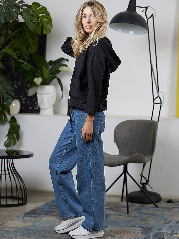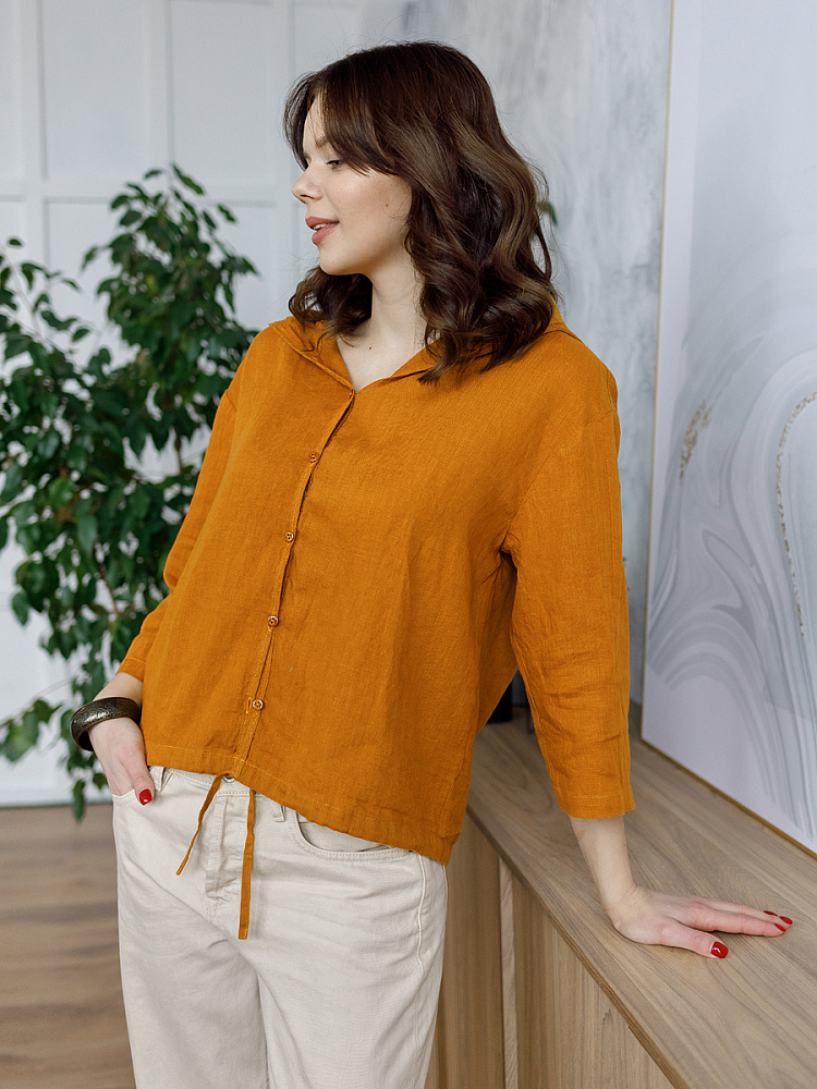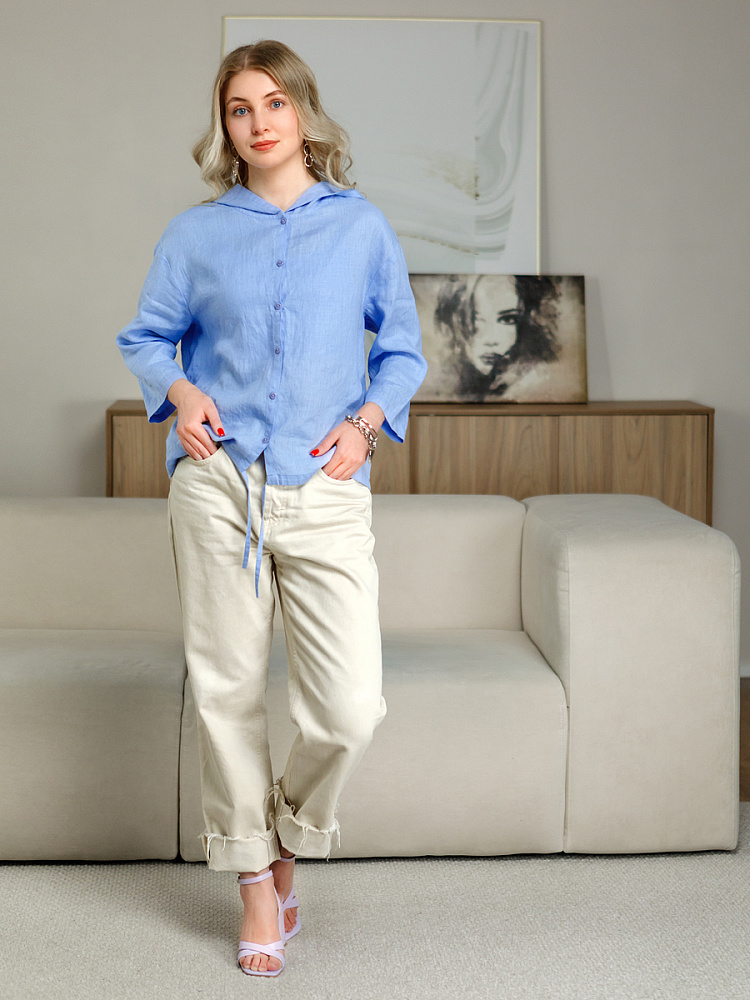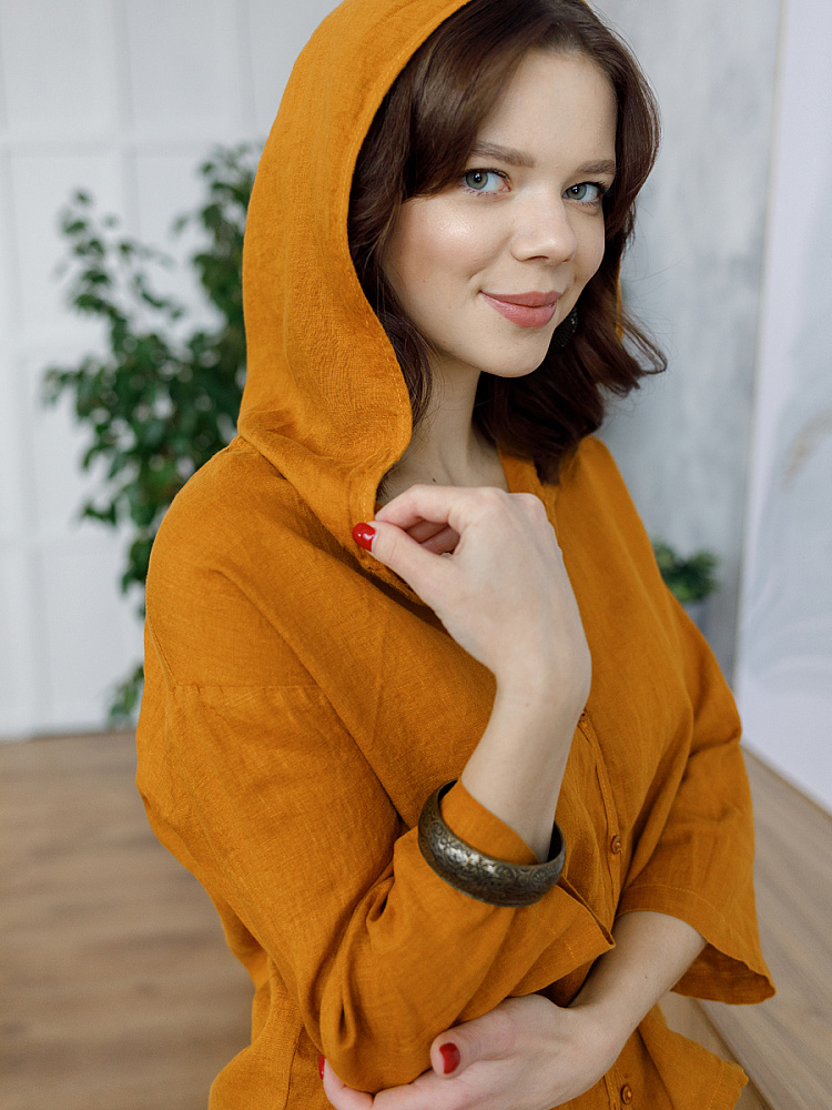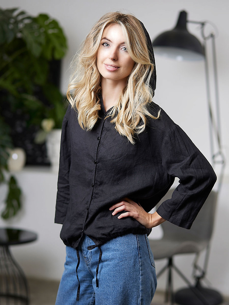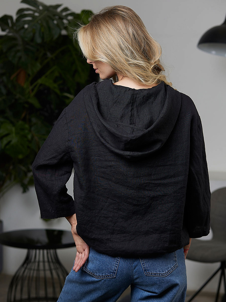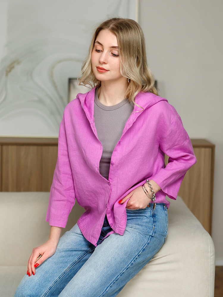 Лаконичность форм и декора демонстрирует представленная модель блузы. Простота и непринуждённость во всём. Прямой свободный крой подкупает своим комфортом. Укороченная длинна рассчитана на энергичные и смелые натуры. Она прекрасна для различных сочетаний с джинсами, брюками и юбками. «Минимализм» форм поддерживает укороченный рукав. О спортивном характере свидетельствует капюшон, наличие которого привносит в образ лёгкую непринуждённость. Модель лишена привычных застёжек – тонкий кант по краю борта фиксирует на маленькие пуговки. Согласитесь, креативное решение! Кулиса по низу изделия способна задать силуэту округлые формы. Жатая текстура натурального льна придаёт изделию неповторимые черты. Можете не тревожиться о внешнем виде изделия, если вы в поездке. Она прекрасно перенесёт любой чемодан или сумку. Представленная модель «выручит» вас в любых ситуациях.