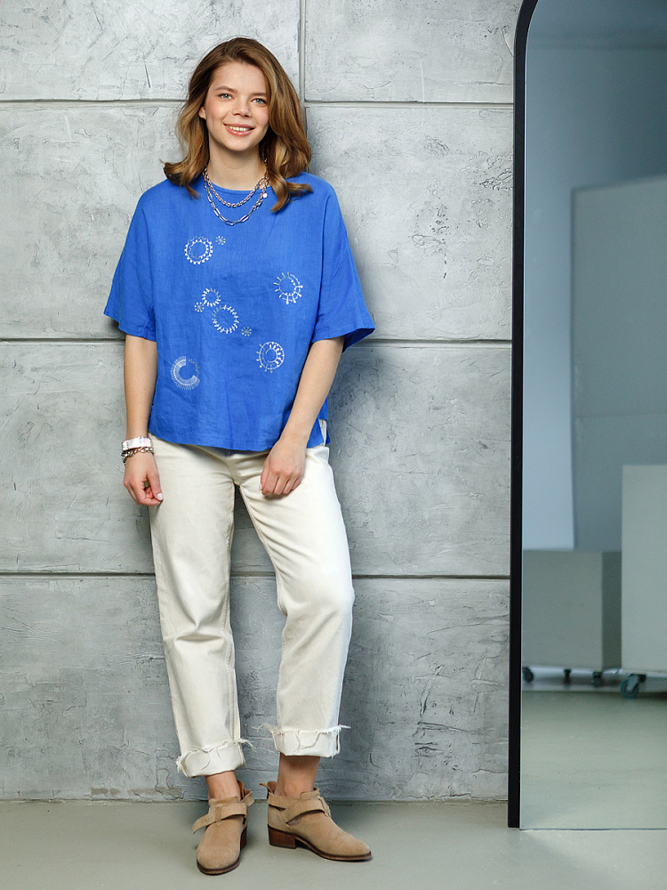 Женская блуза – это производная от мужской сорочки. В ходе истории она претерпела множество различных преобразований. В зависимости от быта и женских обязанностей менялись формы, пропорции, цвета и декор. А с развитием промышленности – и материалы. Однако чем более прогрессивней становятся варианты производства одежды, тем мы более нуждаемся в натуральных материалах и простых формах. Обратите внимание на представленную модель блузы! Это прекрасный вариант чтобы «перевести дух» от синтетики и насладиться свойствами натурального льна. Дышащий и лёгкий, он не накапливает статического электричества, не вызывает раздражений на коже, дарит только позитив и комфорт. В сочетании со свободным кроем, который не обтягивает изгибы тела, стильно маскируя несовершенства – вы можете быть уверены в своём благородном внешнем виде. Длина чуть выше линии бёдер позволяет самые разные сочетания с поясными изделиями. Цельнокроеный рукав придаёт плавные черты женскому силуэту. Это хорошо гармонирует с круглым вырезом горловины. Едва заметные вставки по боковым швам добавляют пикантности образу. Ярко и харизматично «заявляет» о себе машинная вышивка на переднем полотнище. Именно она является отличительной особенностью модели, которая выделяет её из большого разнообразия.