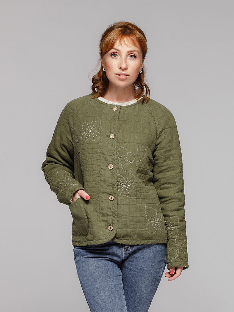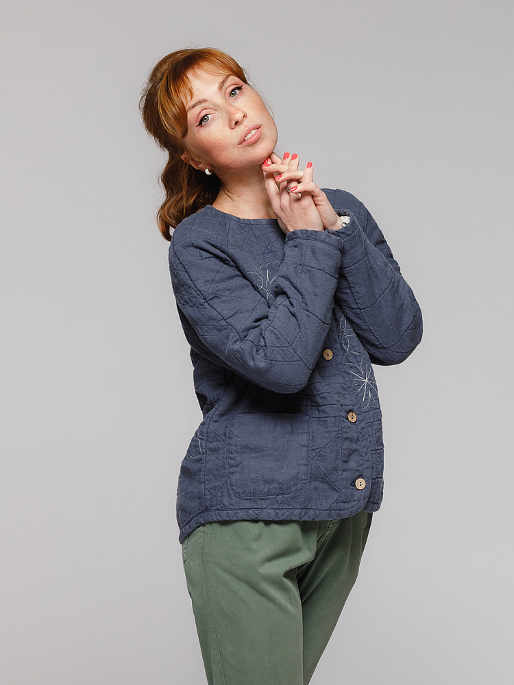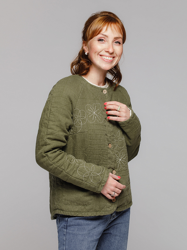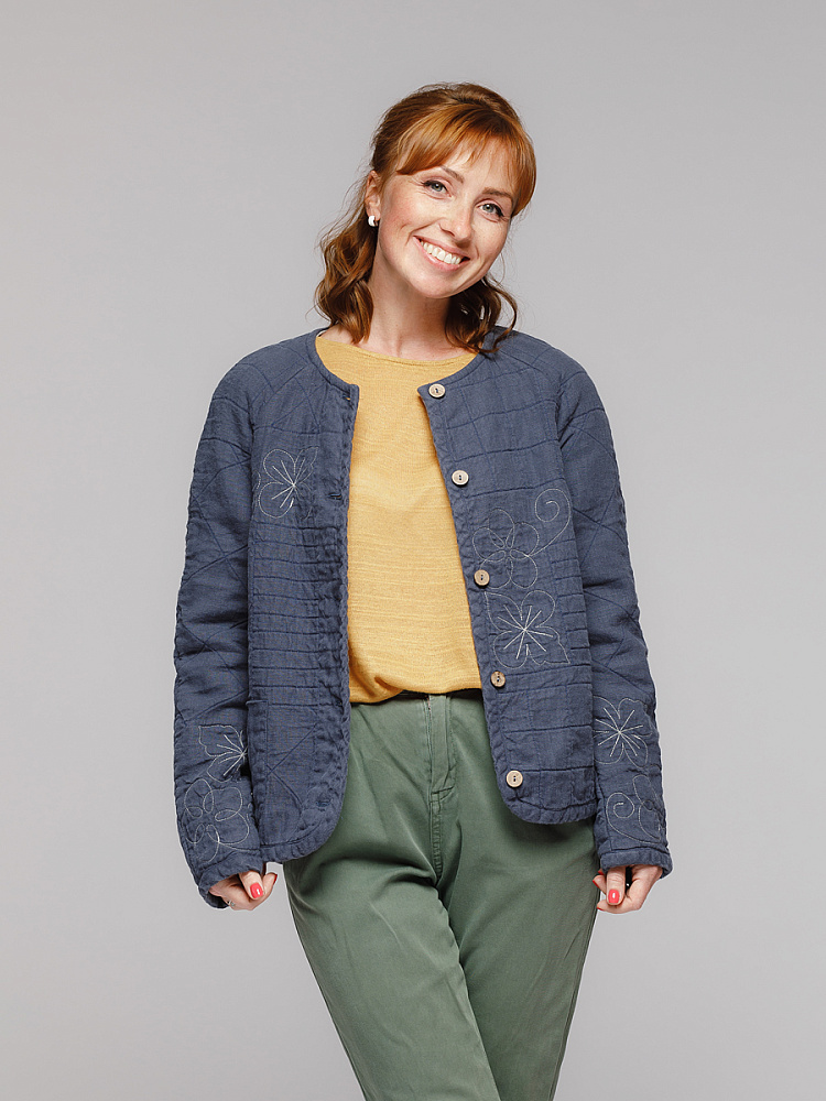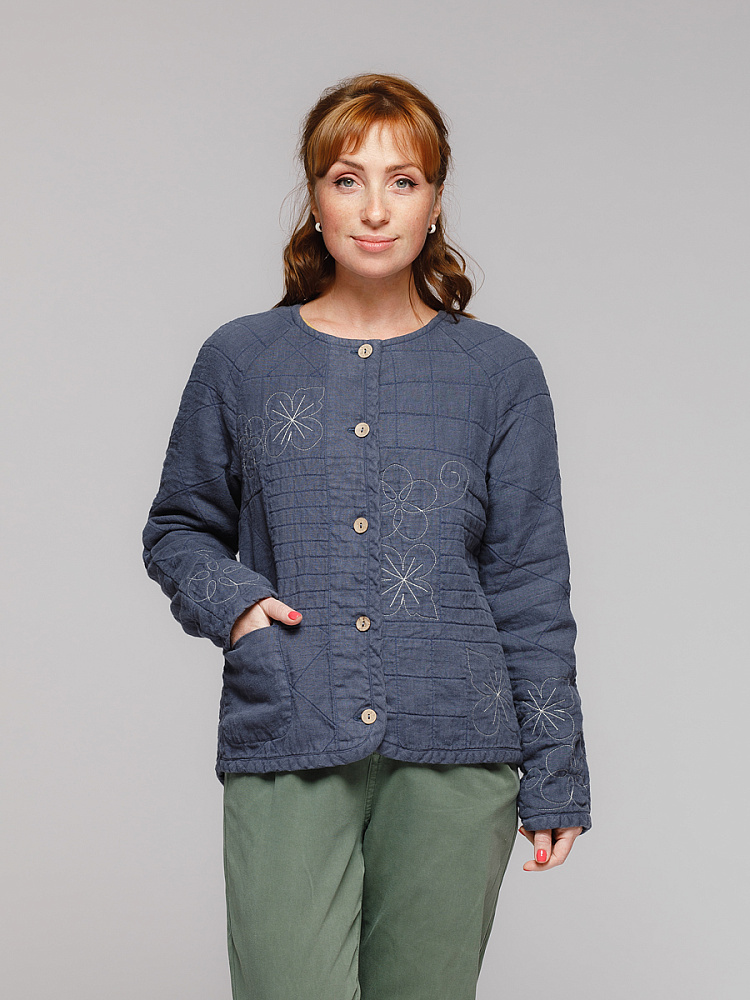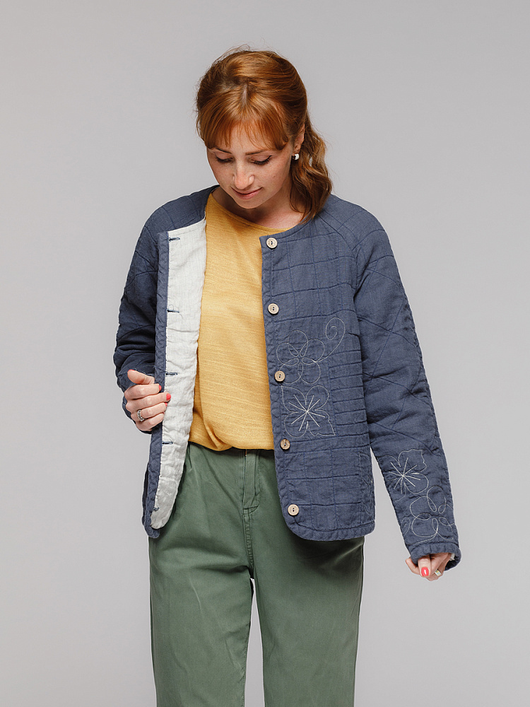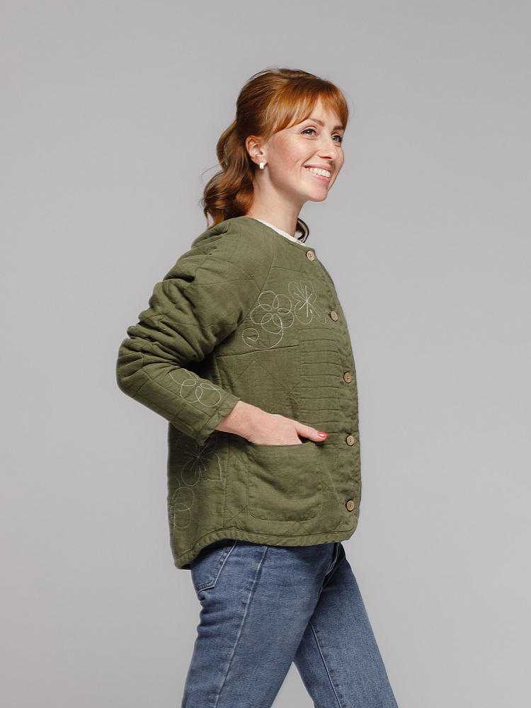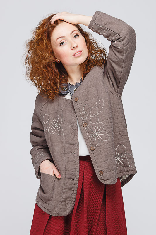 Большинство из нас слышали о таком виде одежды как фуфайка. Мы предлагаем внедрить её в свой гардероб, в современной интерпретации. Женственный округлый силуэт, мягкая линия плеча и цветочный рисунок уводят нас от устоявшегося понятия фуфайки. Придают ей шарм и элегантность. К тому же это очень функциональная вещь. Благодаря утеплителю, в ней будет комфортно до +5°. Эта модель демонстрирует, на сколько разнообразны возможности одежды из льна.