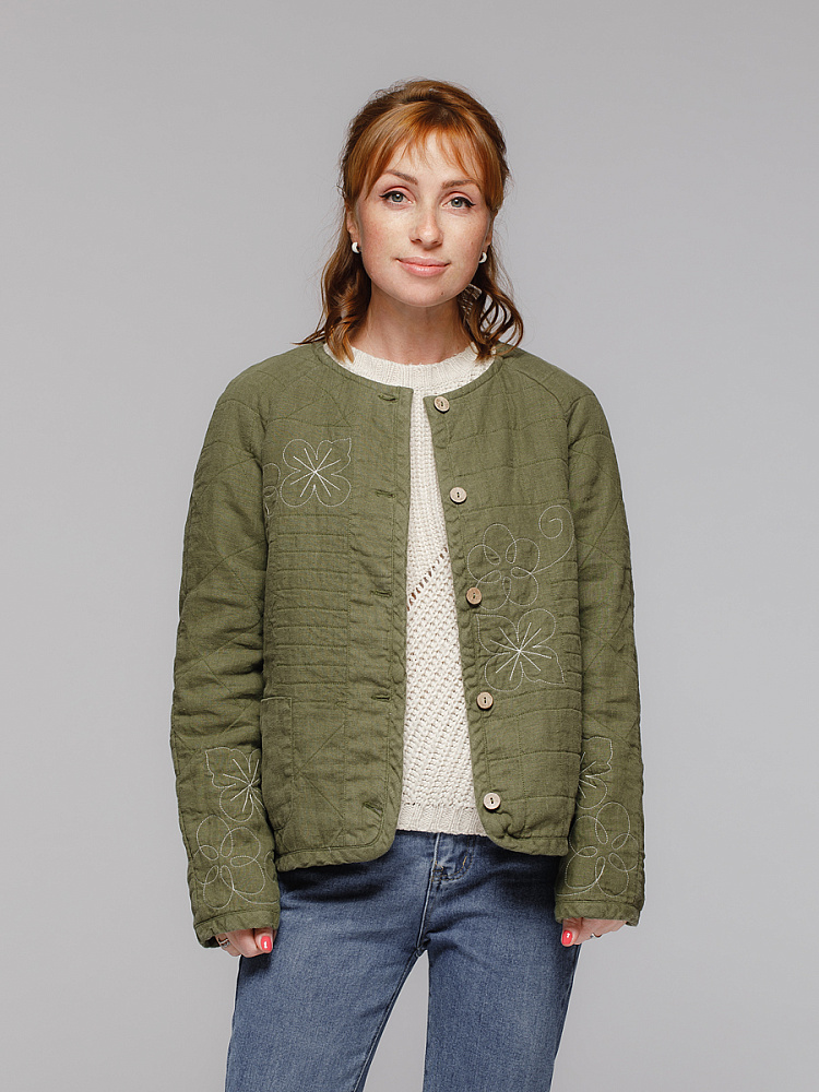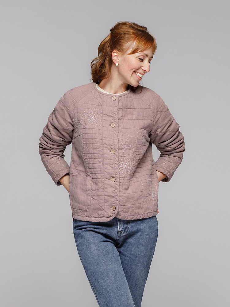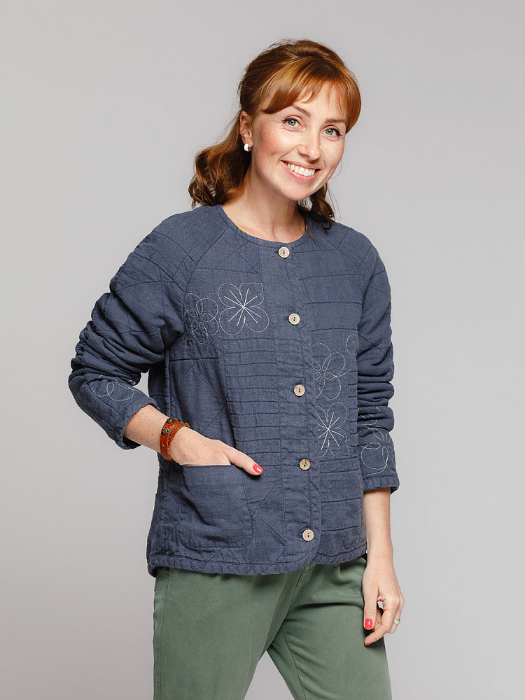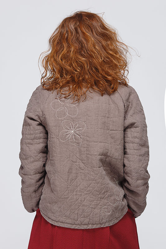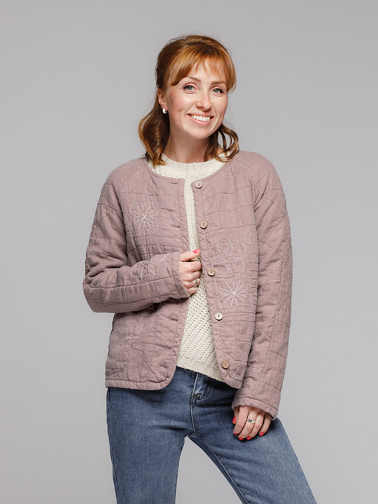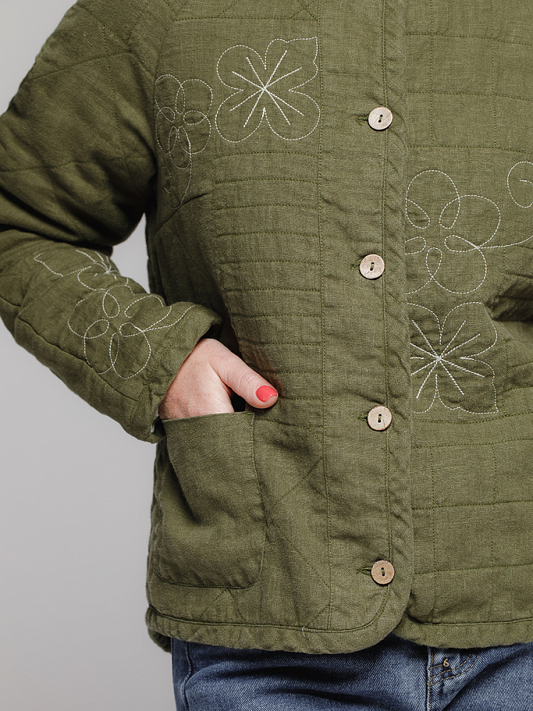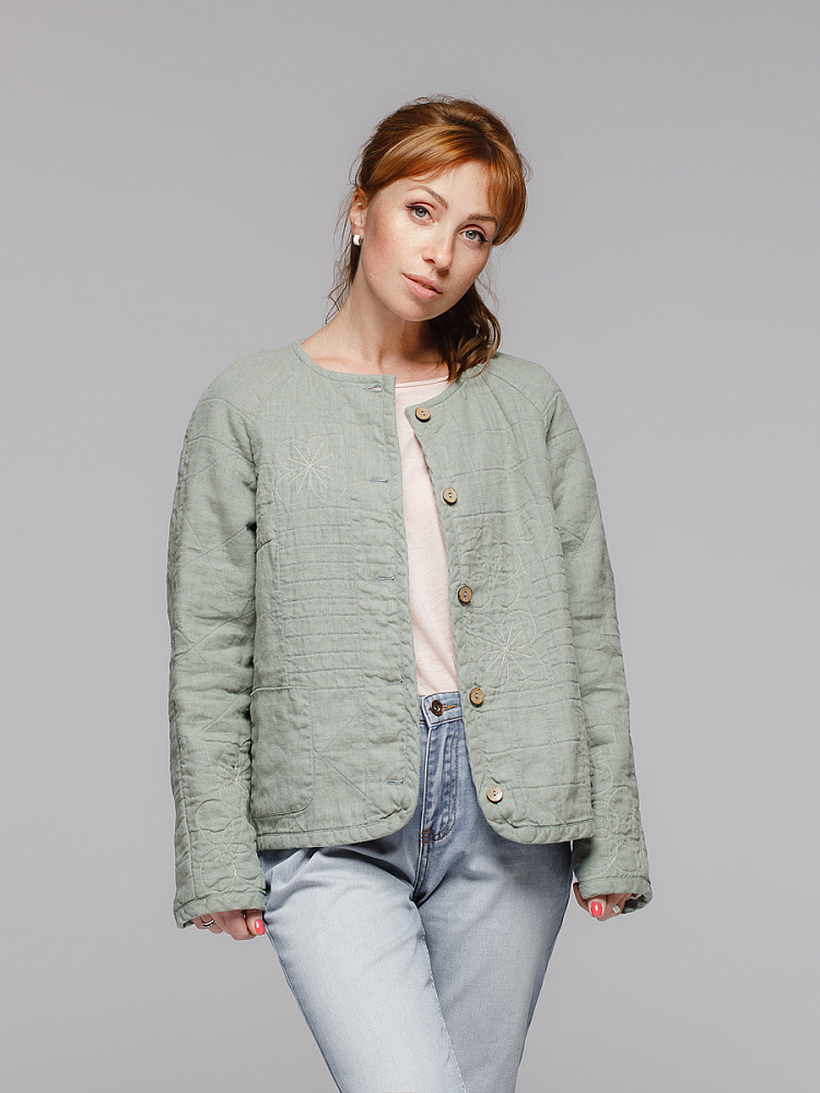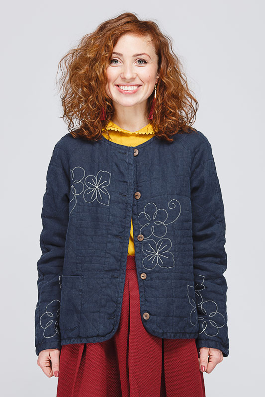 Большинство из нас слышали о таком виде одежды как фуфайка. Мы предлагаем внедрить её в свой гардероб, в современной интерпретации. Женственный округлый силуэт, мягкая линия плеча и цветочный рисунок уводят нас от устоявшегося понятия фуфайки. Придают ей шарм и элегантность. К тому же это очень функциональная вещь. Благодаря утеплителю, в ней будет комфортно до +5°. Эта модель демонстрирует, на сколько разнообразны возможности одежды из льна.