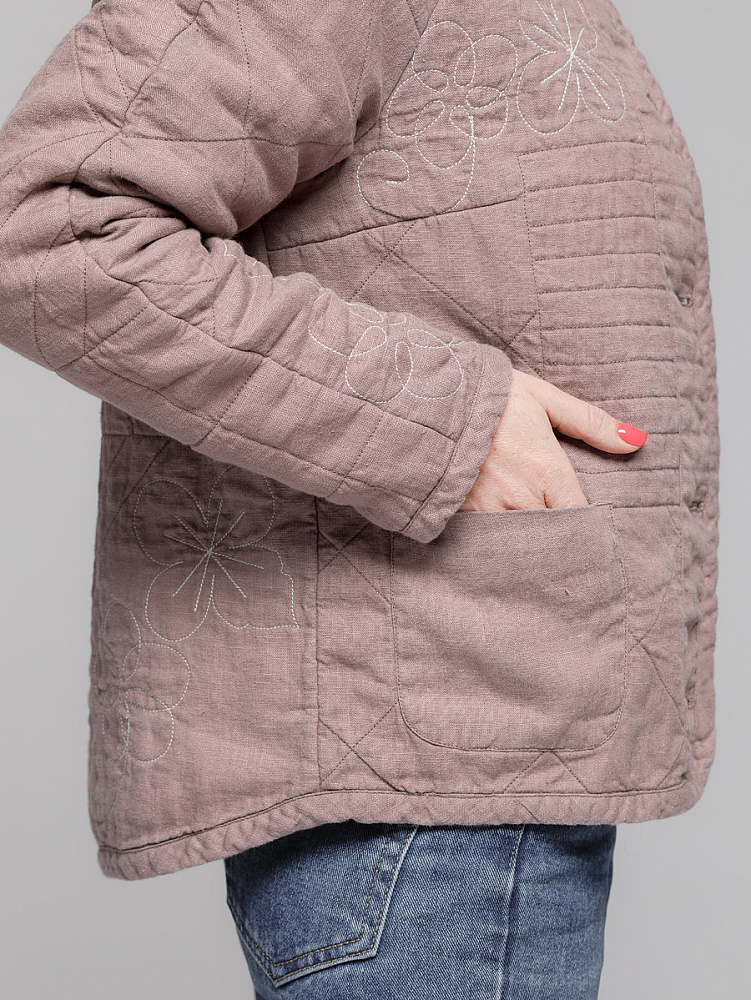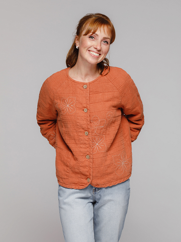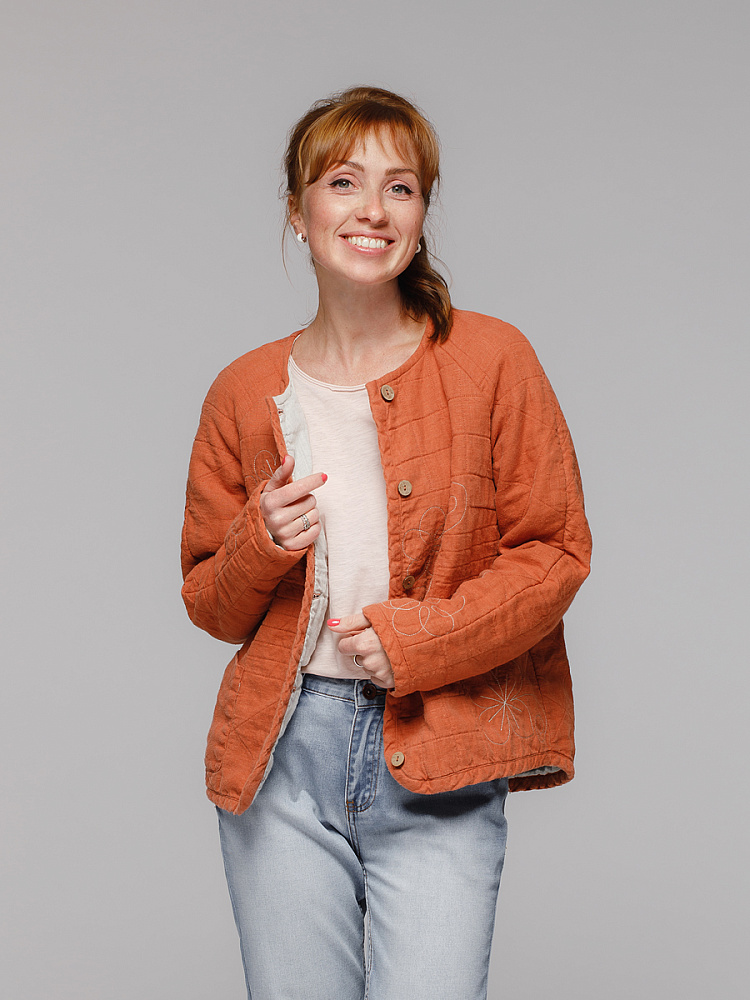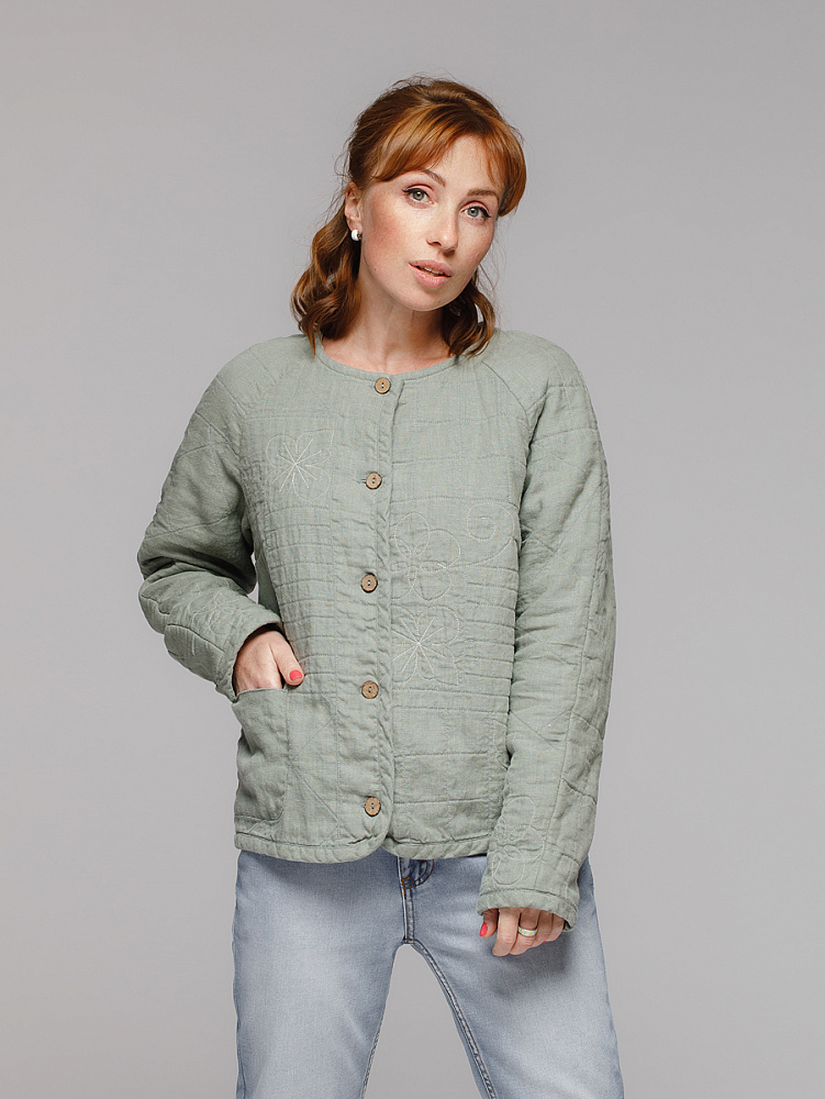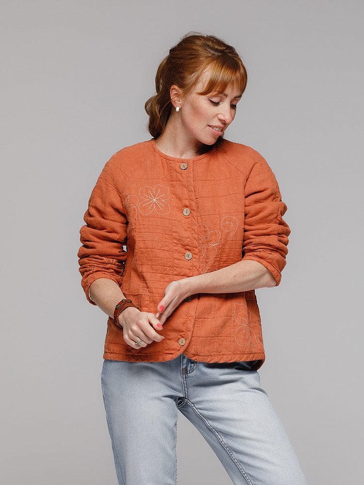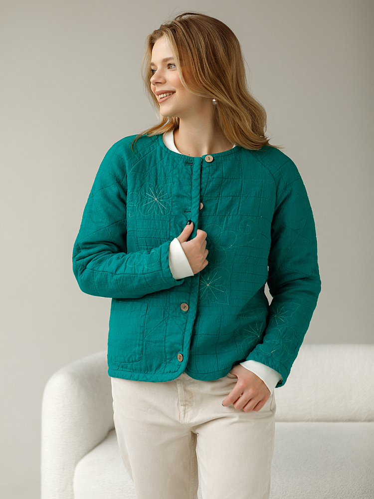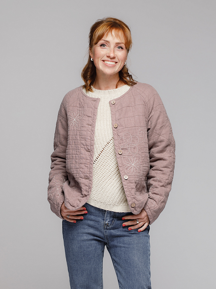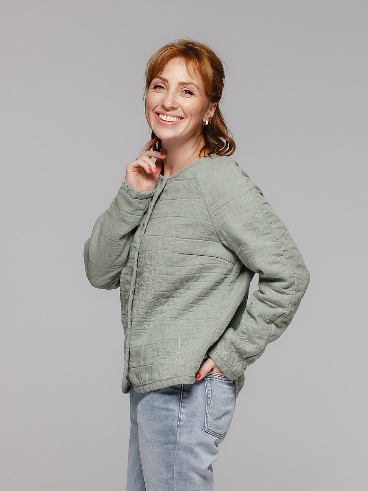 Большинство из нас слышали о таком виде одежды как фуфайка. Мы предлагаем внедрить её в свой гардероб, в современной интерпретации. Женственный округлый силуэт, мягкая линия плеча и цветочный рисунок уводят нас от устоявшегося понятия фуфайки. Придают ей шарм и элегантность. К тому же это очень функциональная вещь. Благодаря утеплителю, в ней будет комфортно до +5°. Эта модель демонстрирует, на сколько разнообразны возможности одежды из льна.