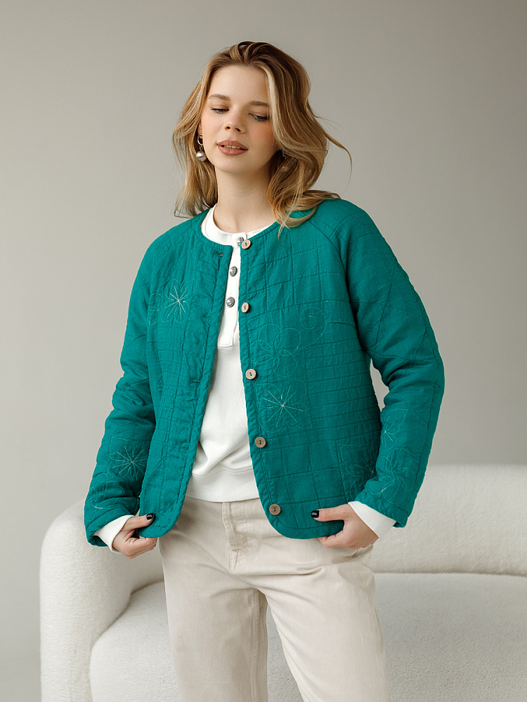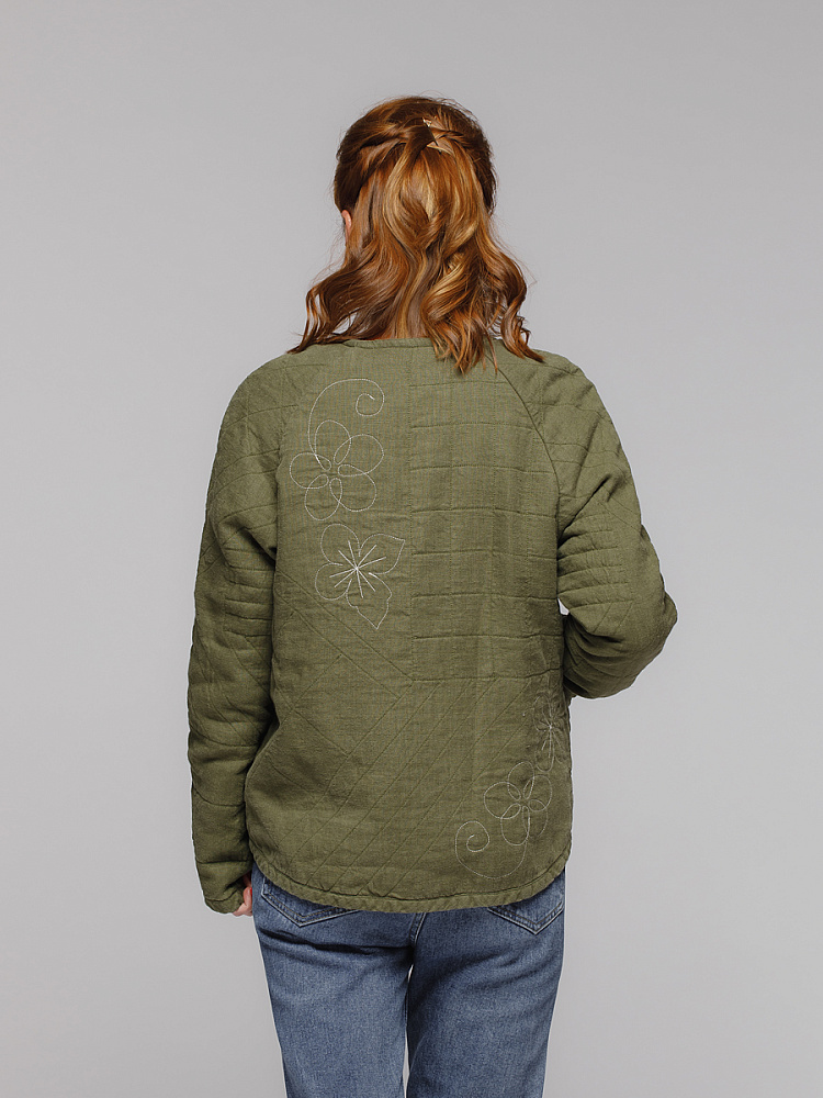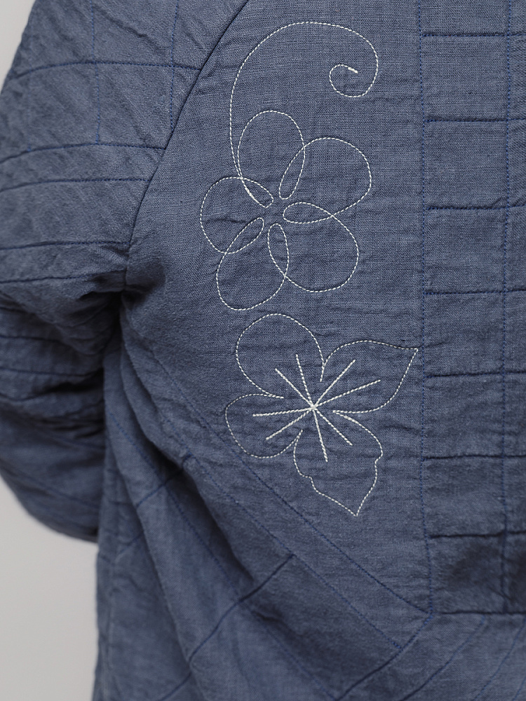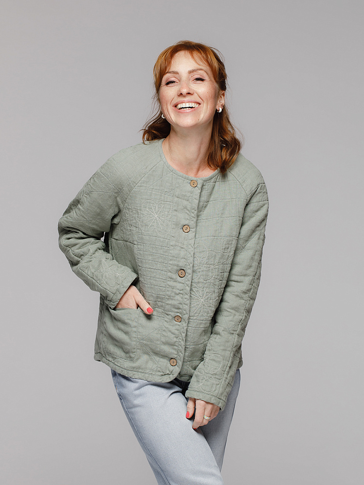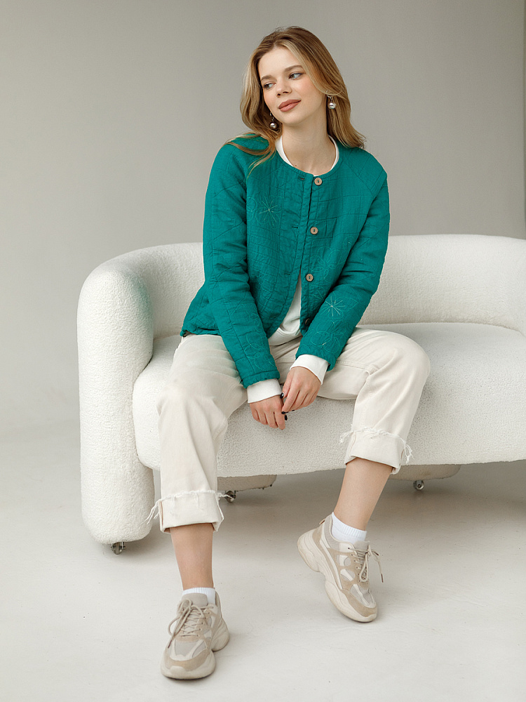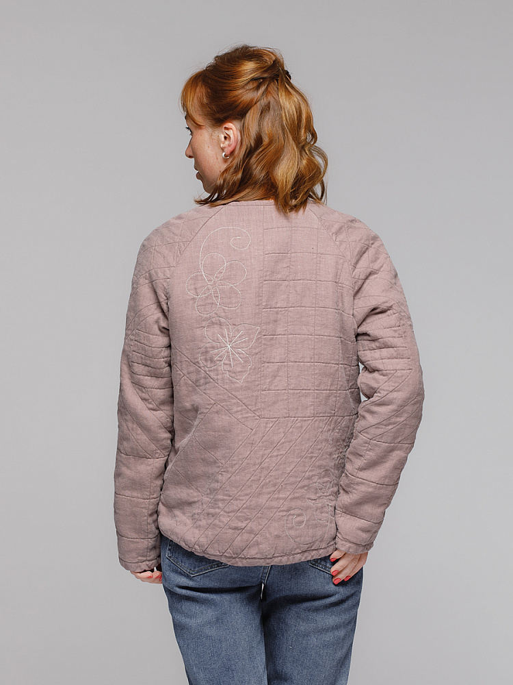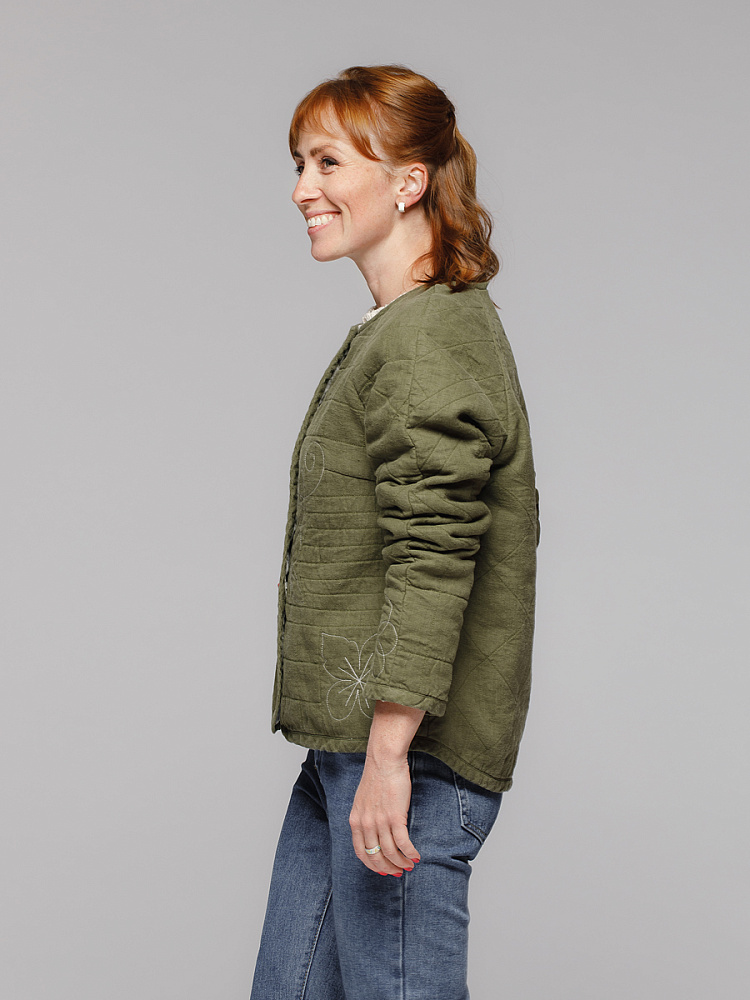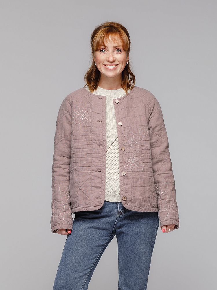 Большинство из нас слышали о таком виде одежды как фуфайка. Мы предлагаем внедрить её в свой гардероб, в современной интерпретации. Женственный округлый силуэт, мягкая линия плеча и цветочный рисунок уводят нас от устоявшегося понятия фуфайки. Придают ей шарм и элегантность. К тому же это очень функциональная вещь. Благодаря утеплителю, в ней будет комфортно до +5°. Эта модель демонстрирует, на сколько разнообразны возможности одежды из льна.
