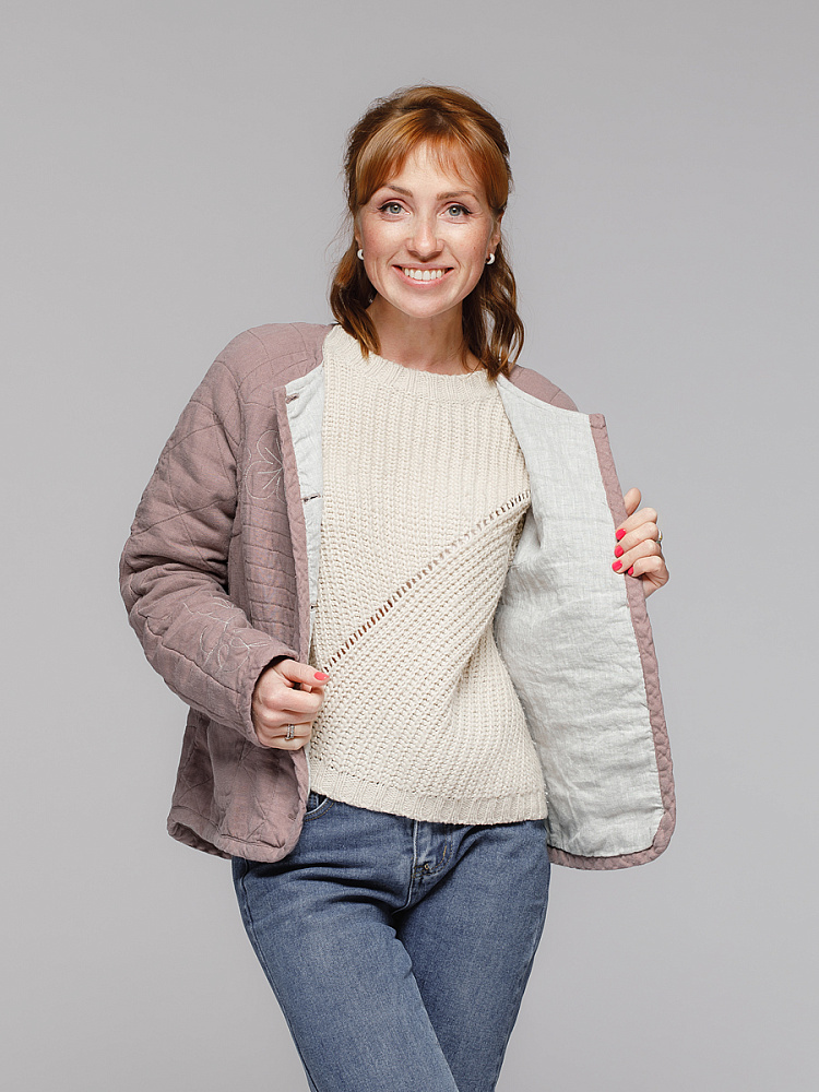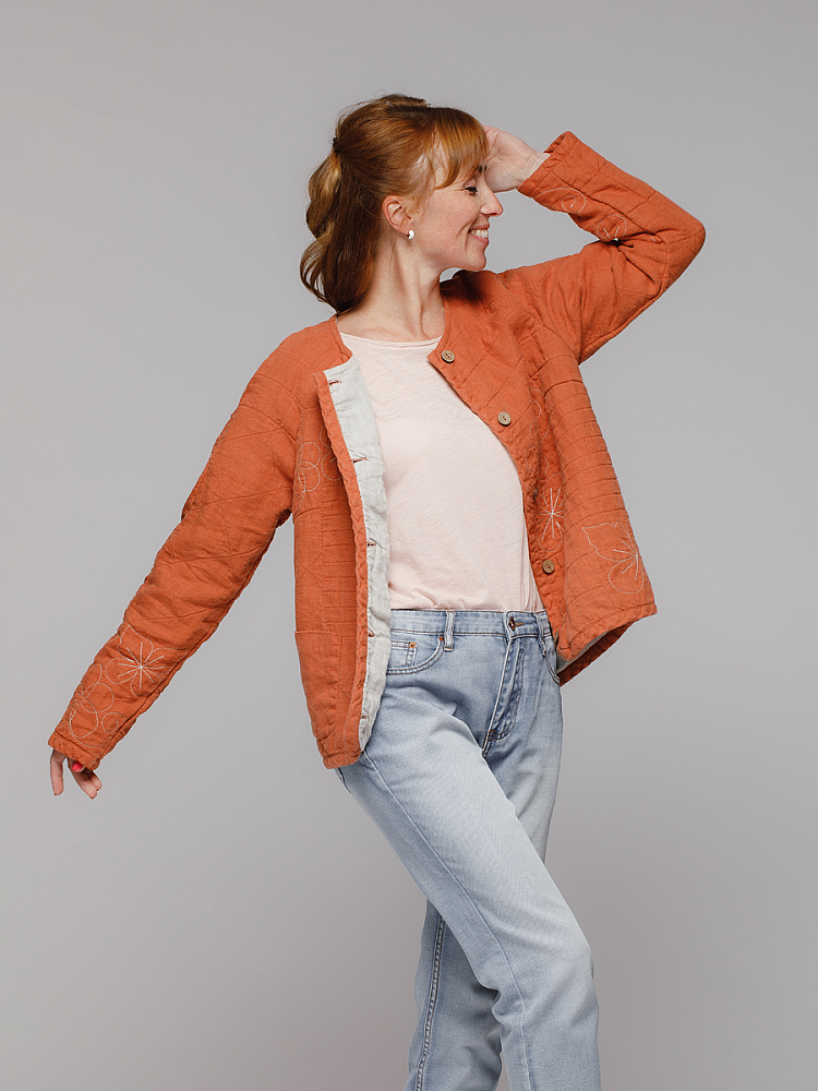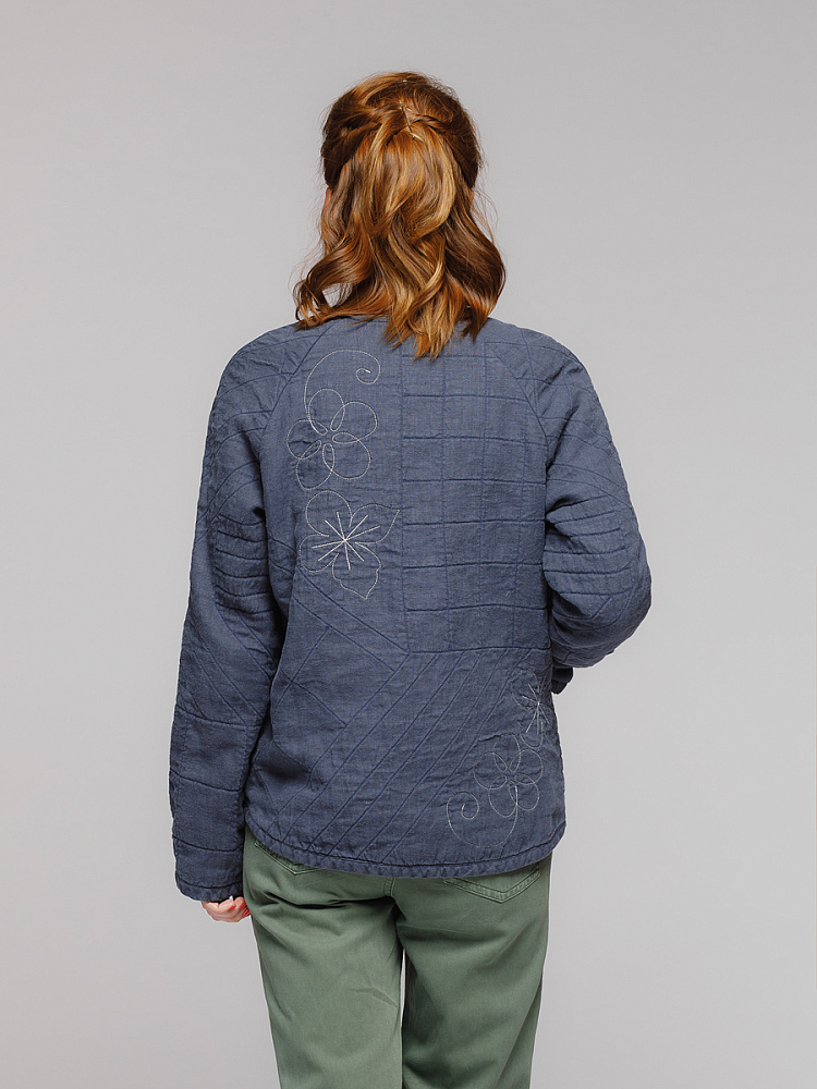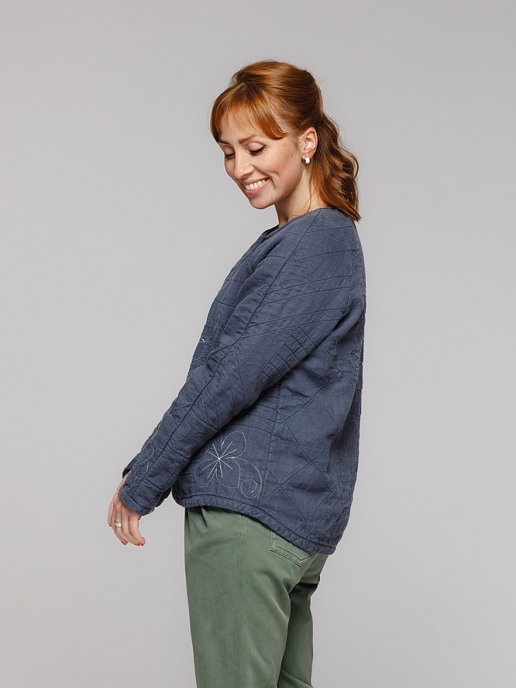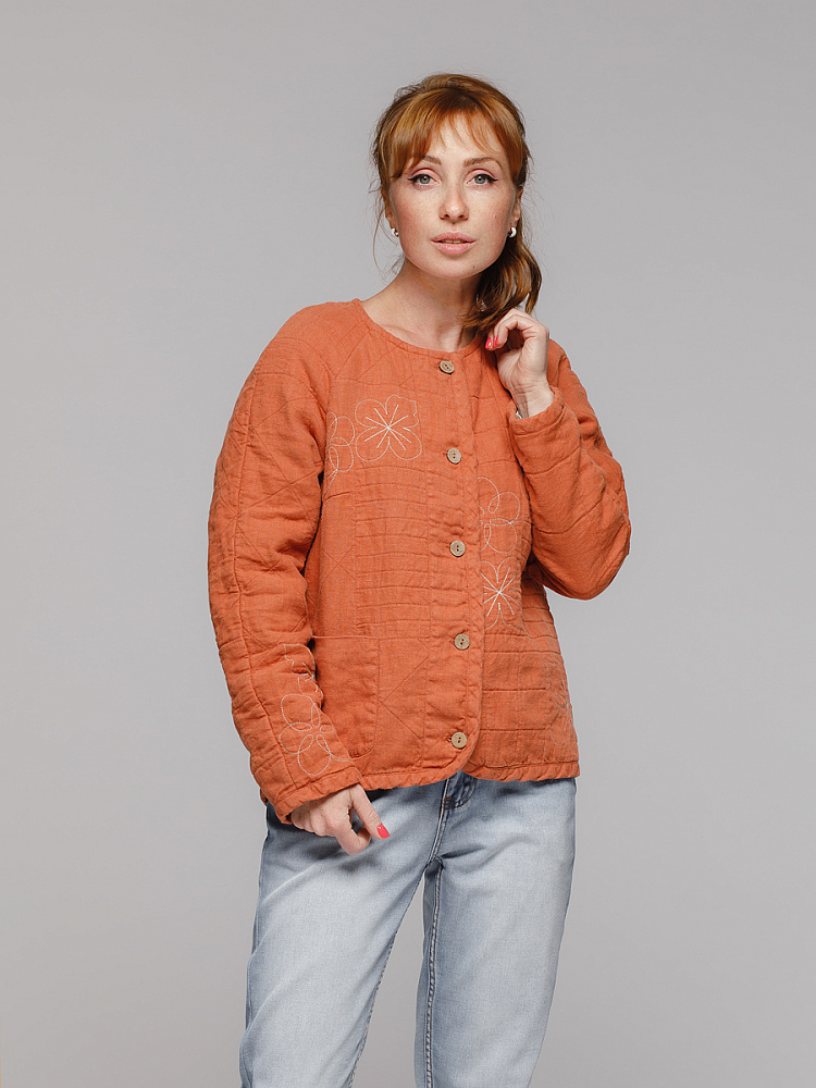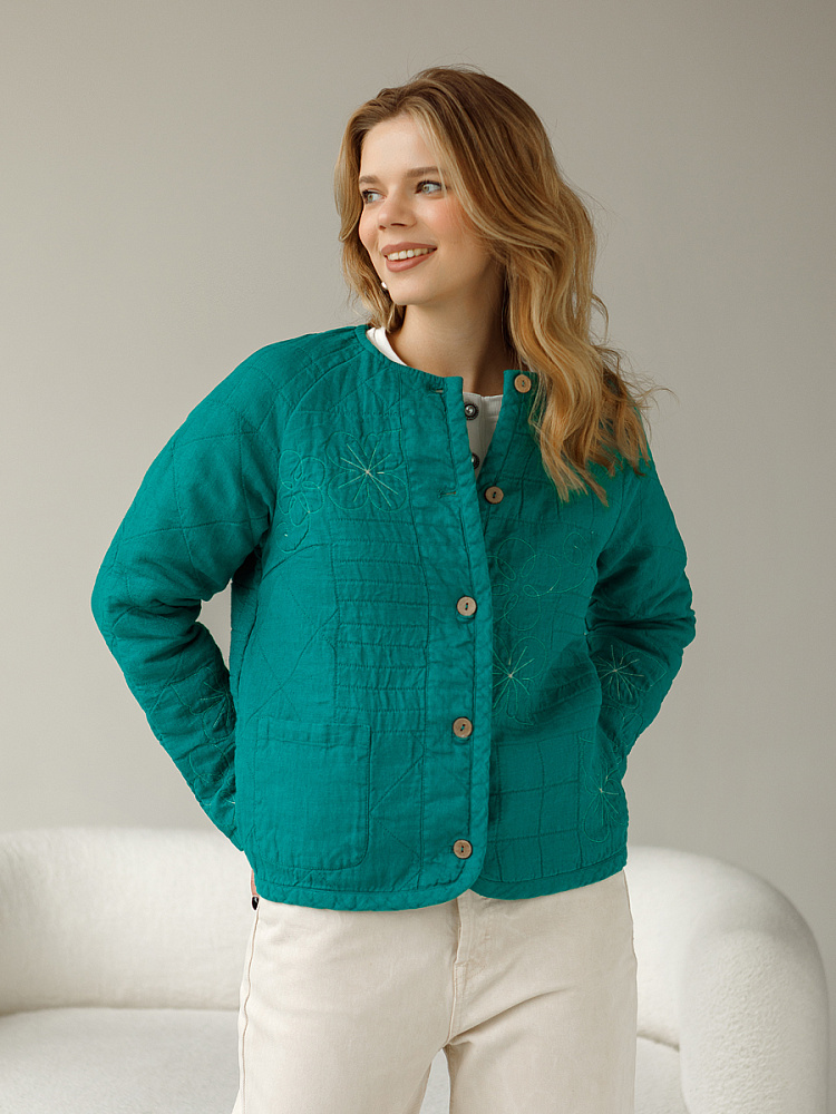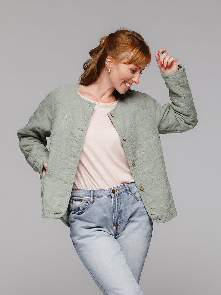 Большинство из нас слышали о таком виде одежды как фуфайка. Мы предлагаем внедрить её в свой гардероб, в современной интерпретации. Женственный округлый силуэт, мягкая линия плеча и цветочный рисунок уводят нас от устоявшегося понятия фуфайки. Придают ей шарм и элегантность. К тому же это очень функциональная вещь. Благодаря утеплителю, в ней будет комфортно до +5°. Эта модель демонстрирует, на сколько разнообразны возможности одежды из льна.