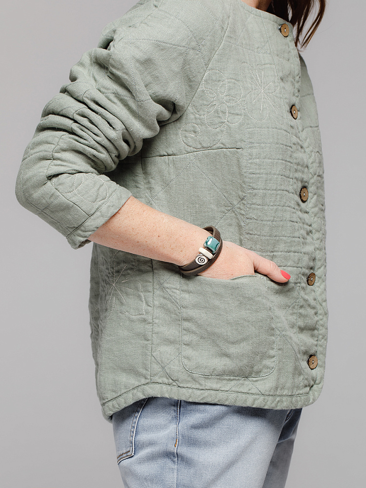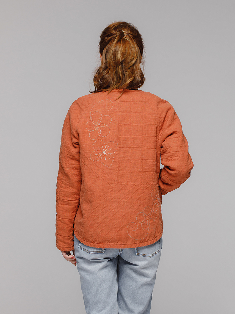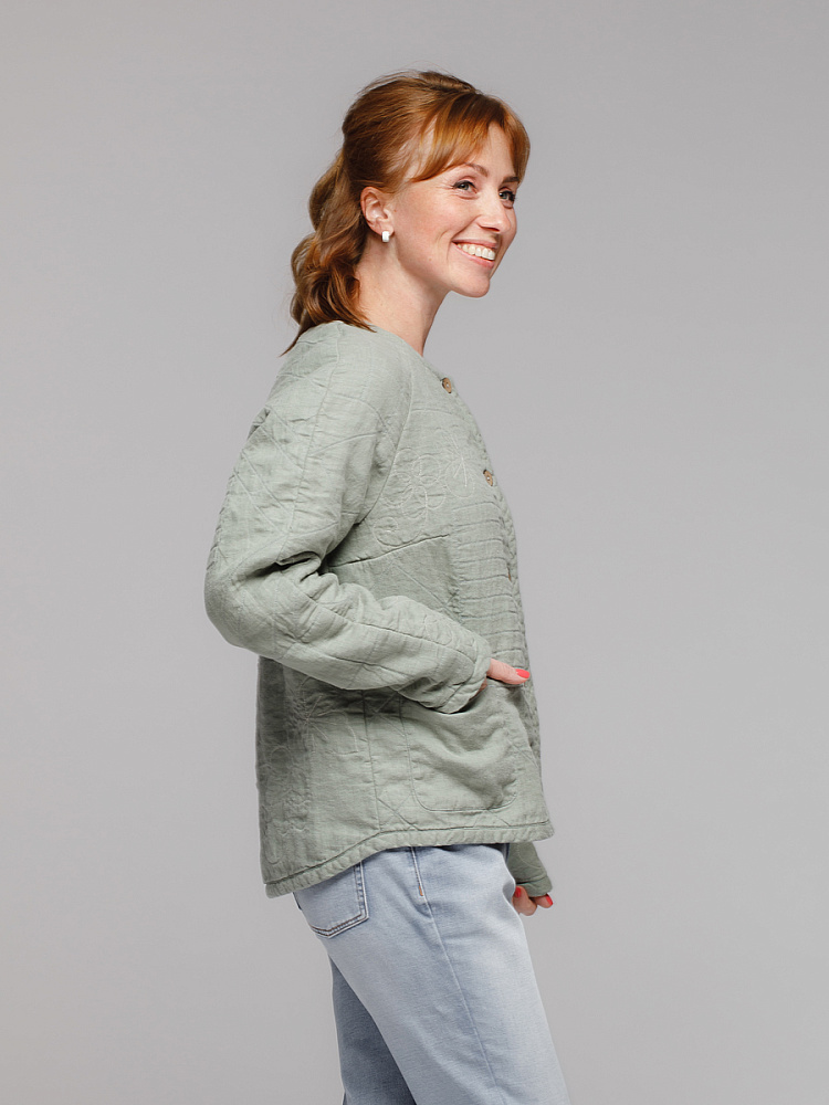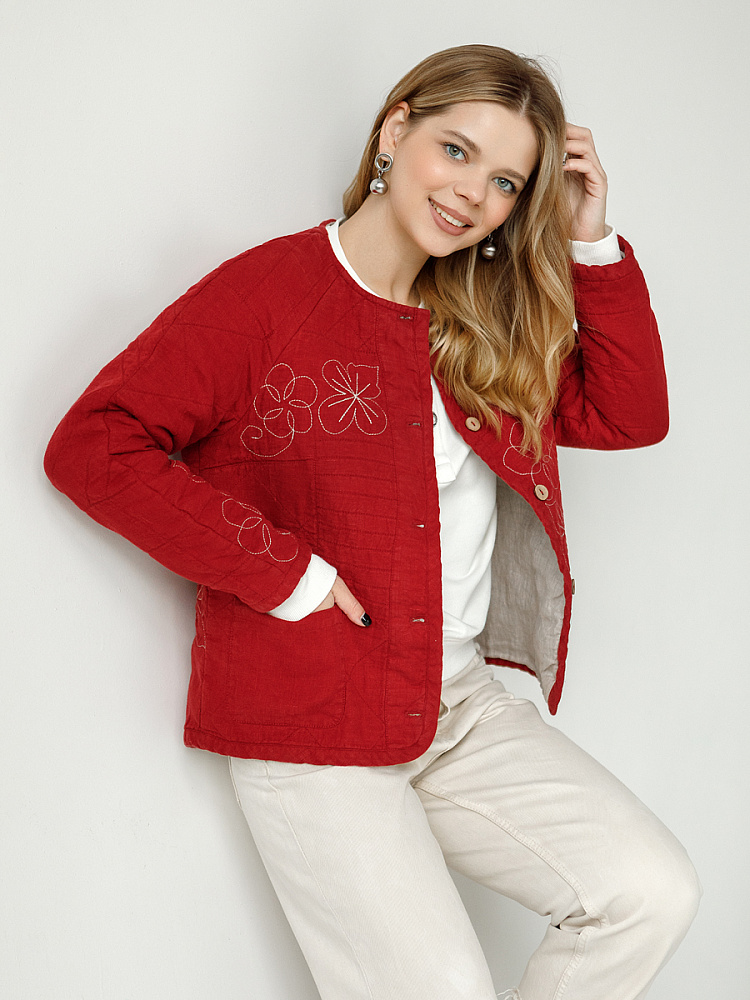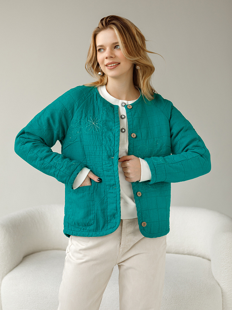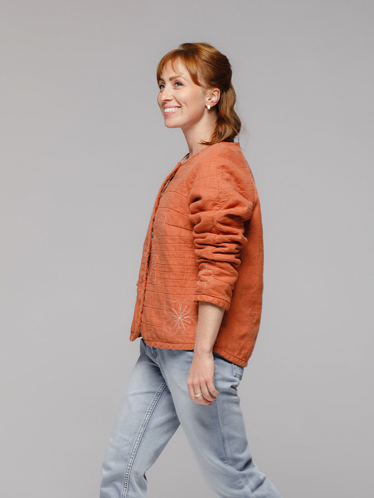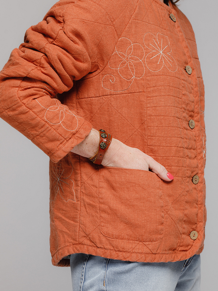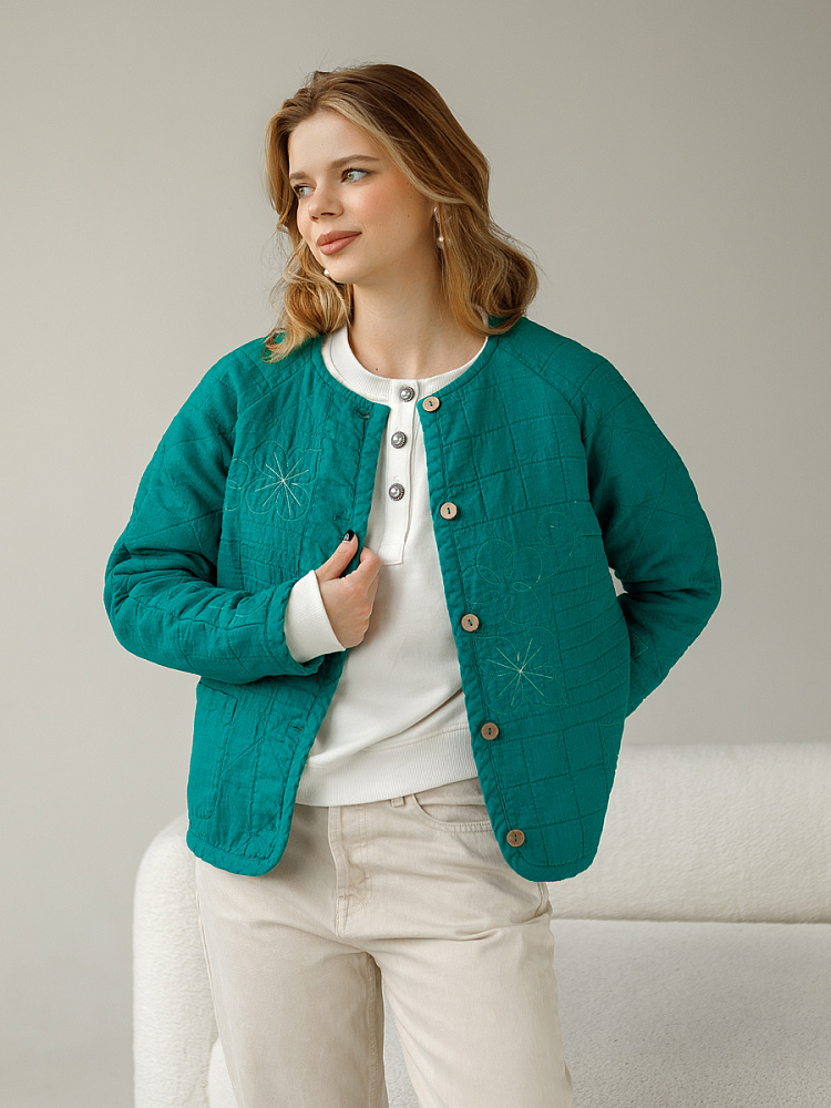 Большинство из нас слышали о таком виде одежды как фуфайка. Мы предлагаем внедрить её в свой гардероб, в современной интерпретации. Женственный округлый силуэт, мягкая линия плеча и цветочный рисунок уводят нас от устоявшегося понятия фуфайки. Придают ей шарм и элегантность. К тому же это очень функциональная вещь. Благодаря утеплителю, в ней будет комфортно до +5°. Эта модель демонстрирует, на сколько разнообразны возможности одежды из льна.