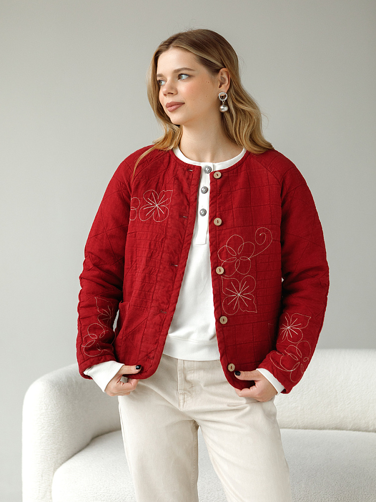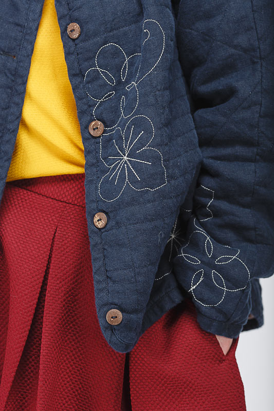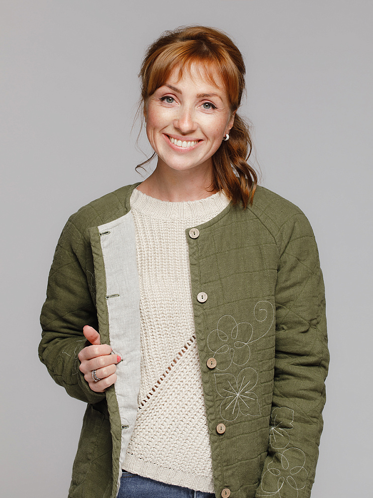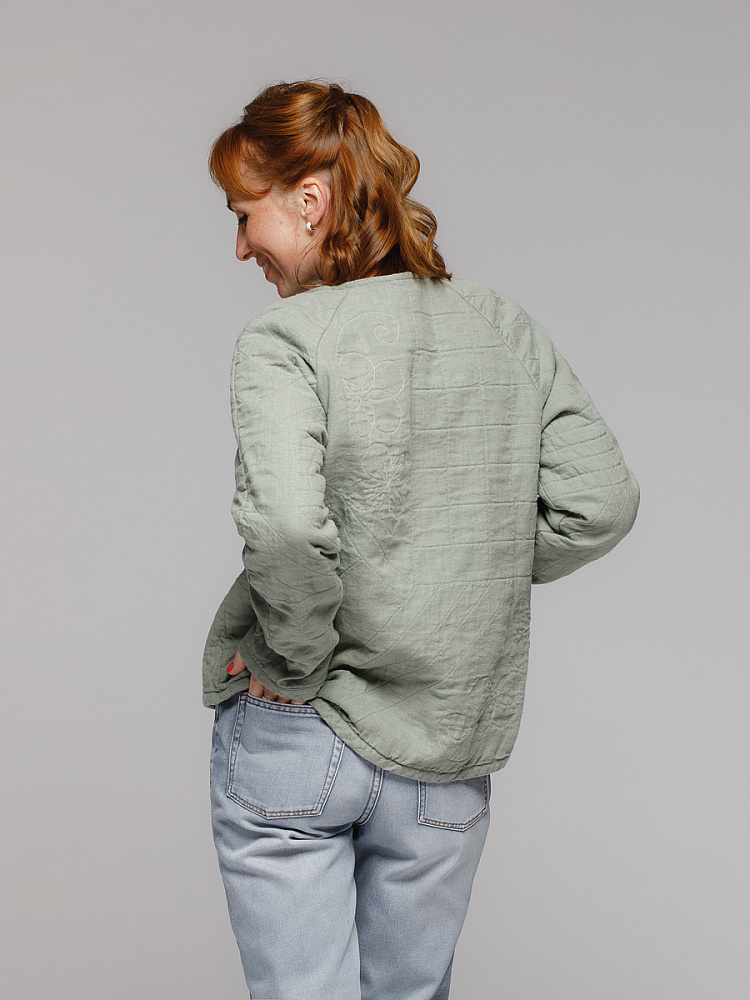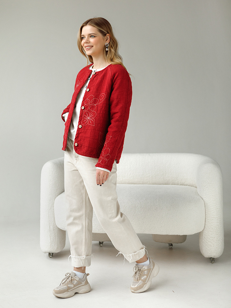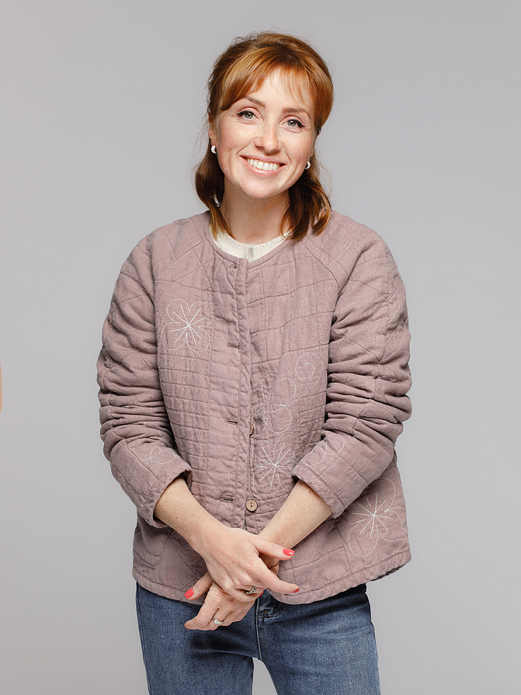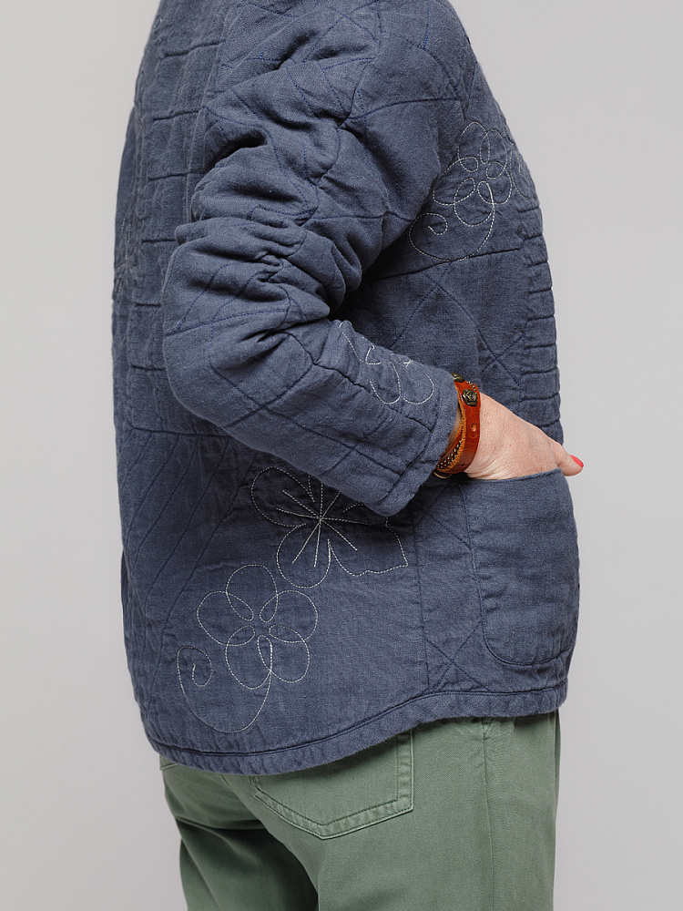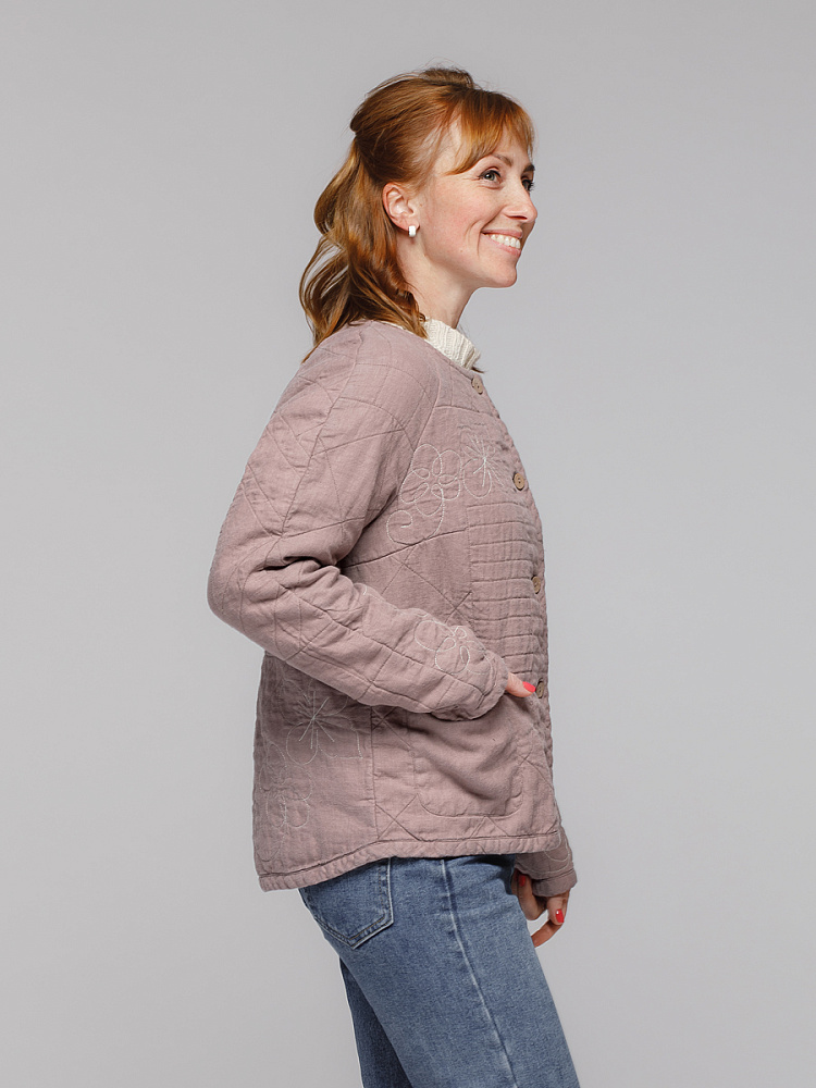 Большинство из нас слышали о таком виде одежды как фуфайка. Мы предлагаем внедрить её в свой гардероб, в современной интерпретации. Женственный округлый силуэт, мягкая линия плеча и цветочный рисунок уводят нас от устоявшегося понятия фуфайки. Придают ей шарм и элегантность. К тому же это очень функциональная вещь. Благодаря утеплителю, в ней будет комфортно до +5°. Эта модель демонстрирует, на сколько разнообразны возможности одежды из льна.