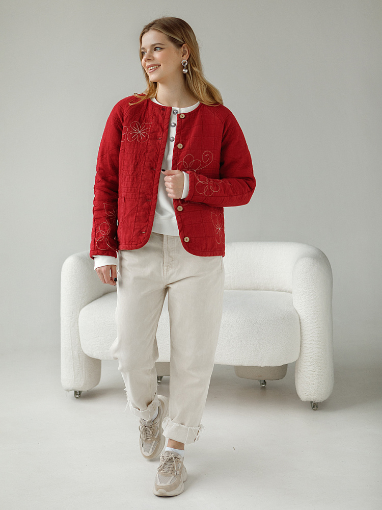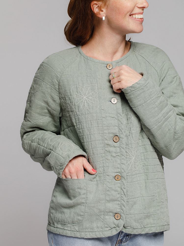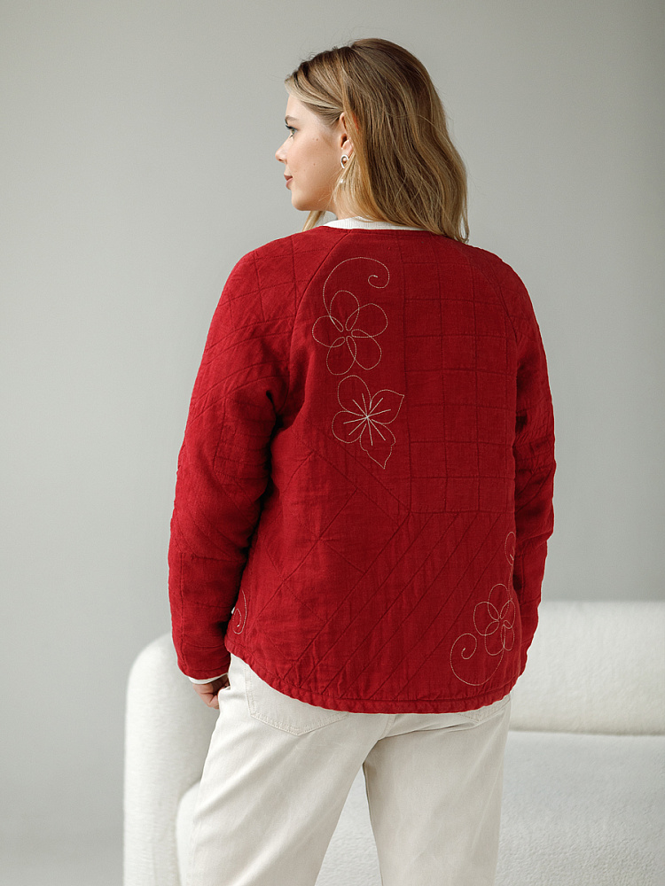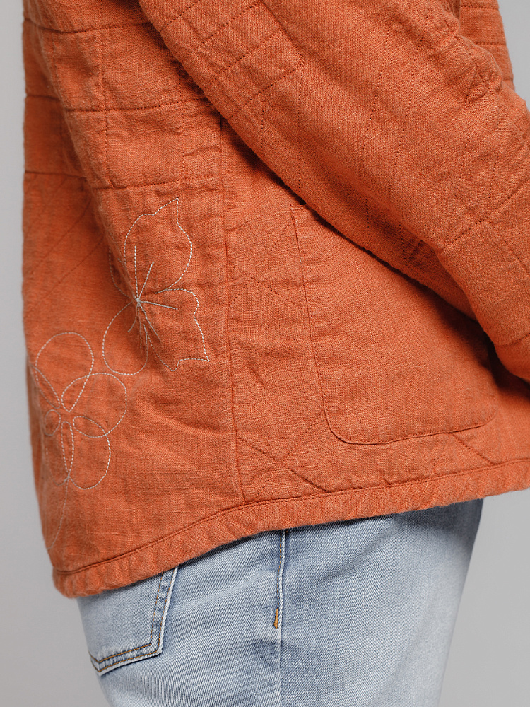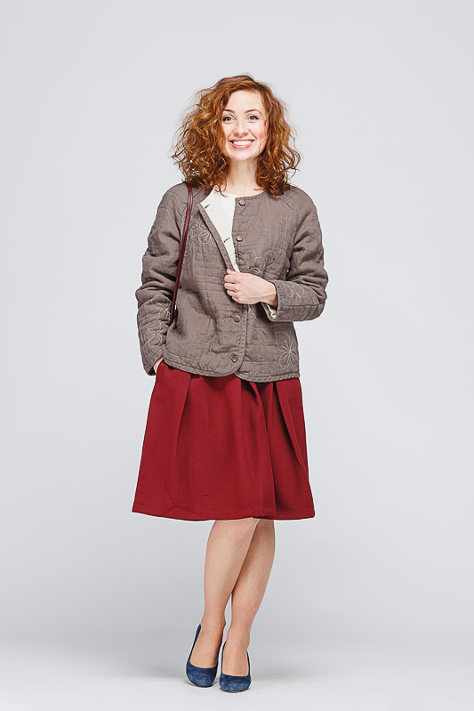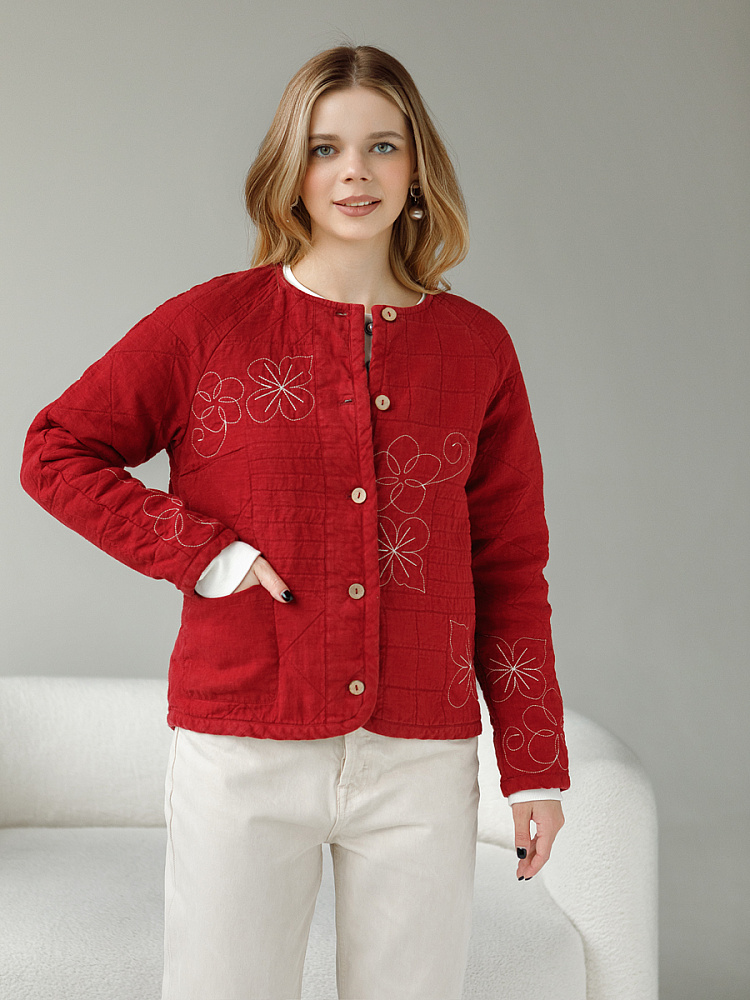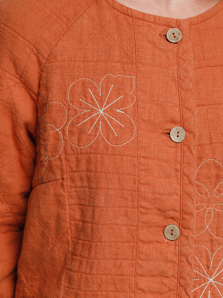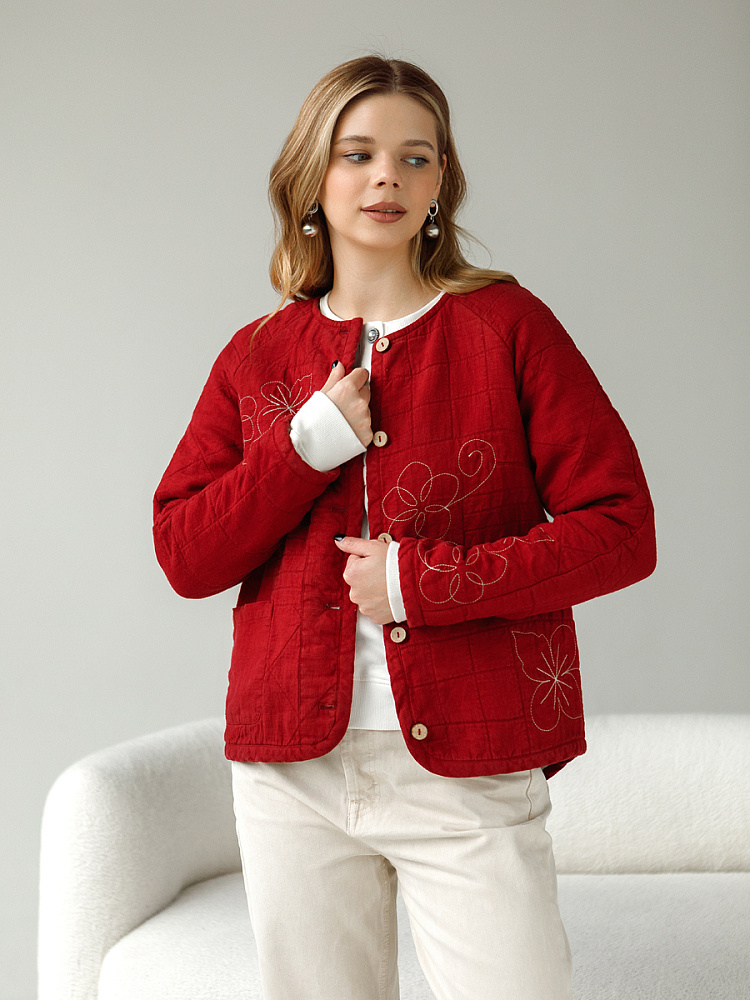 Большинство из нас слышали о таком виде одежды как фуфайка. Мы предлагаем внедрить её в свой гардероб, в современной интерпретации. Женственный округлый силуэт, мягкая линия плеча и цветочный рисунок уводят нас от устоявшегося понятия фуфайки. Придают ей шарм и элегантность. К тому же это очень функциональная вещь. Благодаря утеплителю, в ней будет комфортно до +5°. Эта модель демонстрирует, на сколько разнообразны возможности одежды из льна.