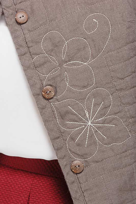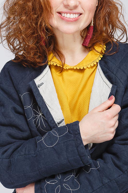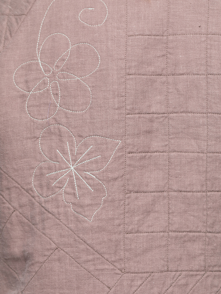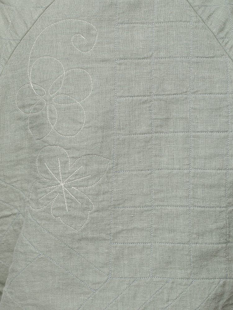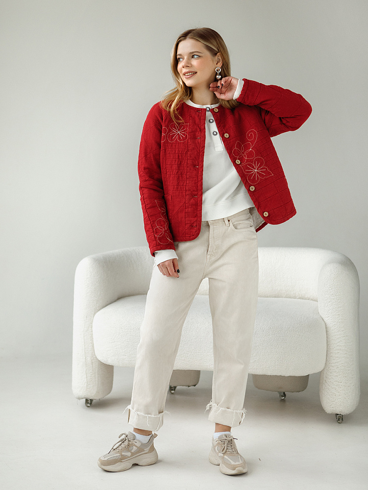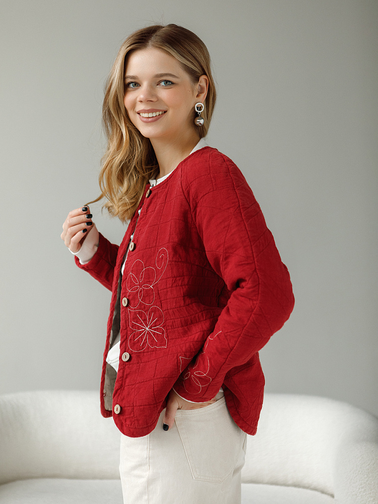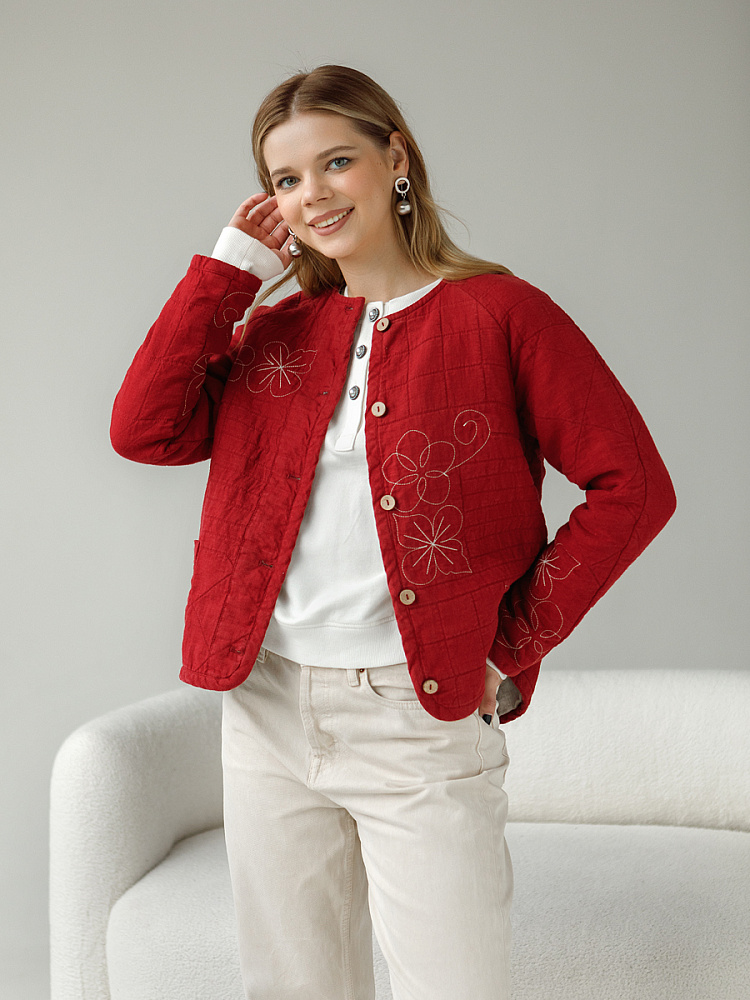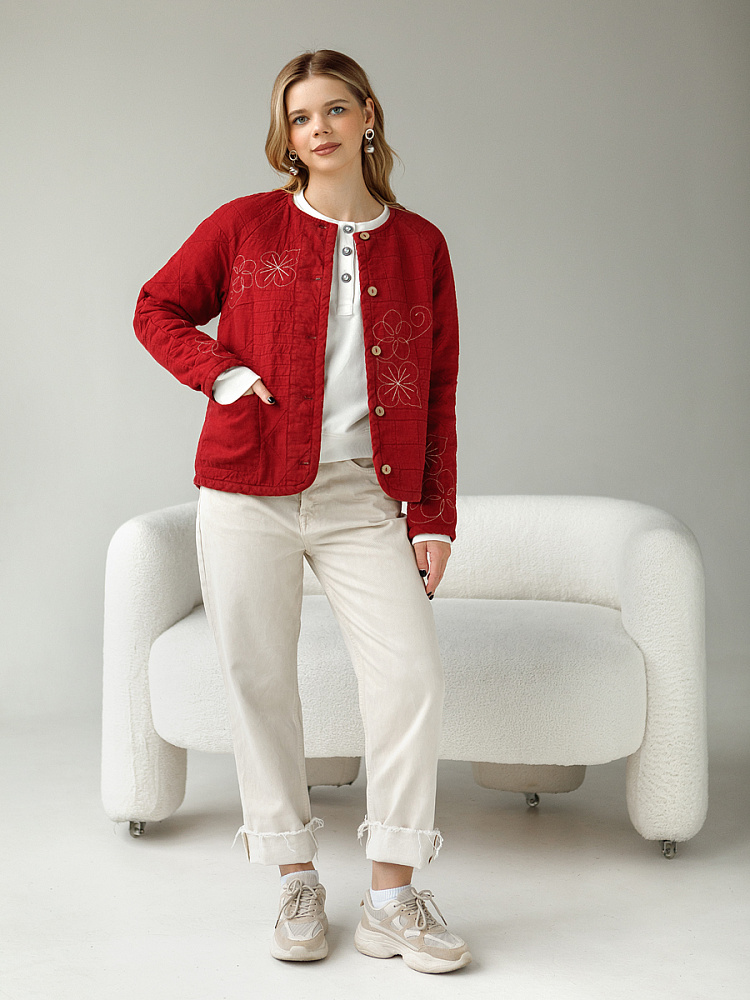 Большинство из нас слышали о таком виде одежды как фуфайка. Мы предлагаем внедрить её в свой гардероб, в современной интерпретации. Женственный округлый силуэт, мягкая линия плеча и цветочный рисунок уводят нас от устоявшегося понятия фуфайки. Придают ей шарм и элегантность. К тому же это очень функциональная вещь. Благодаря утеплителю, в ней будет комфортно до +5°. Эта модель демонстрирует, на сколько разнообразны возможности одежды из льна.