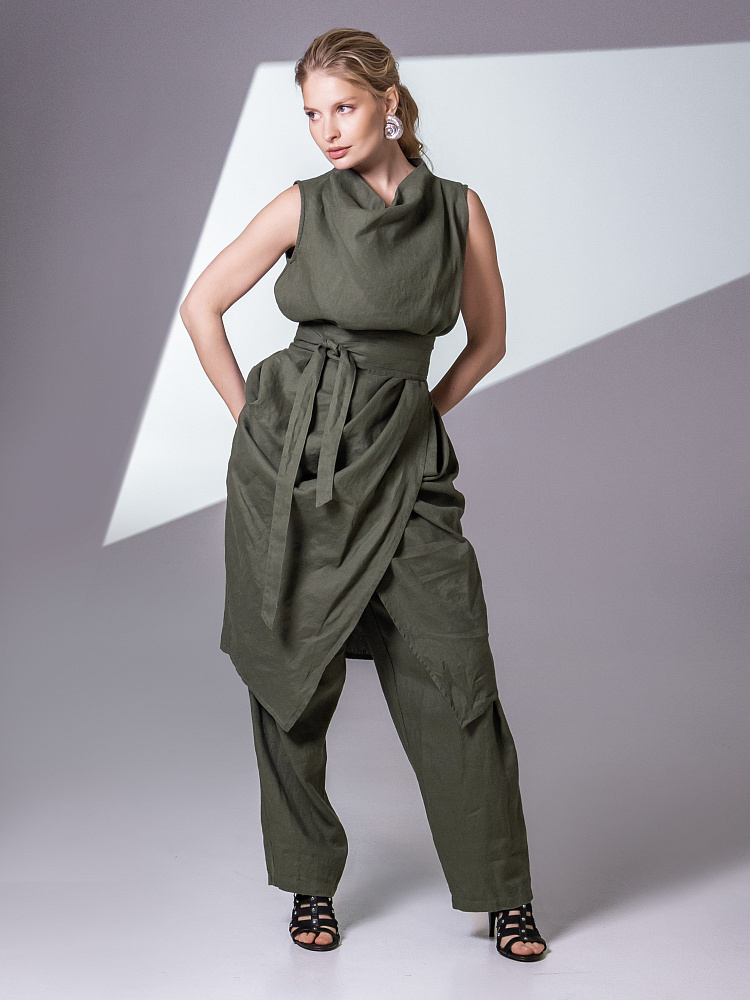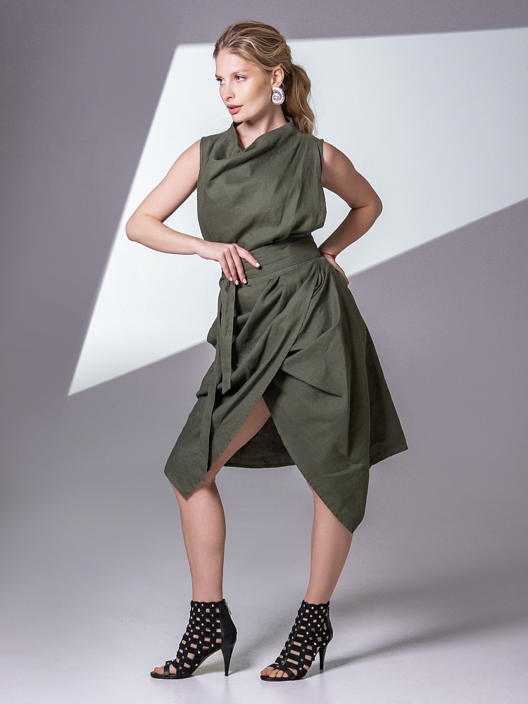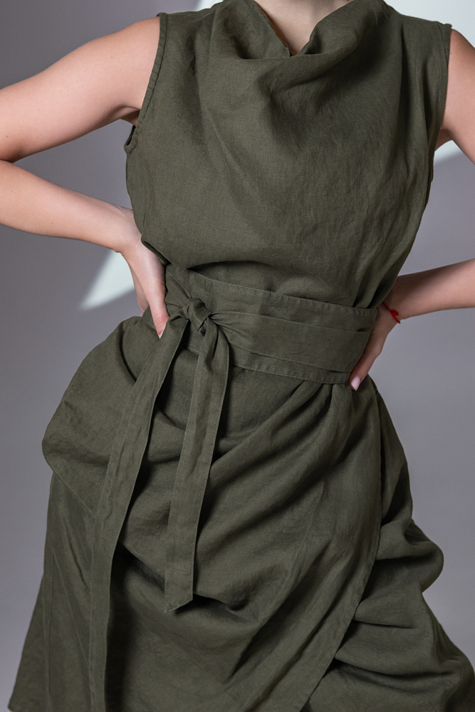 Одно платье, но множество образов. Это ли не женское счастье!? Чарующий многослойный силуэт представленной модели способен на многое. Многочисленные складки натурального льна создают игру света и тени, вычерчивают нетривиальные женские формы. Прямой силуэт платья создан по средствам двух деталей передних половинок, которые нахлестнули одну на другую. Подобный конструктивный приём избавил модель от надоедливых и статичных застёжек. Не плотное смыкание деталей образует интригующий ассиметричный разрез, позволяющий продемонстрировать красоту женских ножек. Геометрия нижнего среза вытягивает силуэт по вертикали, создавая стройные женские черты. Глубокие складки воротника – хомут подчиняются общему замыслу модели, плавно окутывая область шеи. Подчеркнуть талию и поэкспериментировать с формами можно при помощи съёмного пояса, который способен внести кардинальные изменения в ваш образ. Модель платья лишена какого – либо декора, все дизайнерские акценты смещены в сторону силуэта.