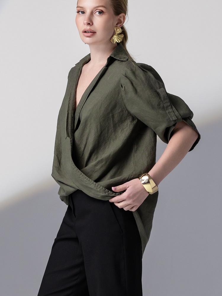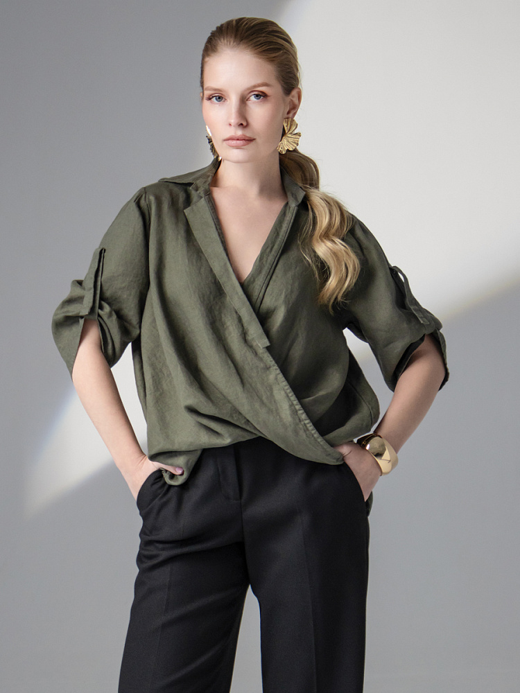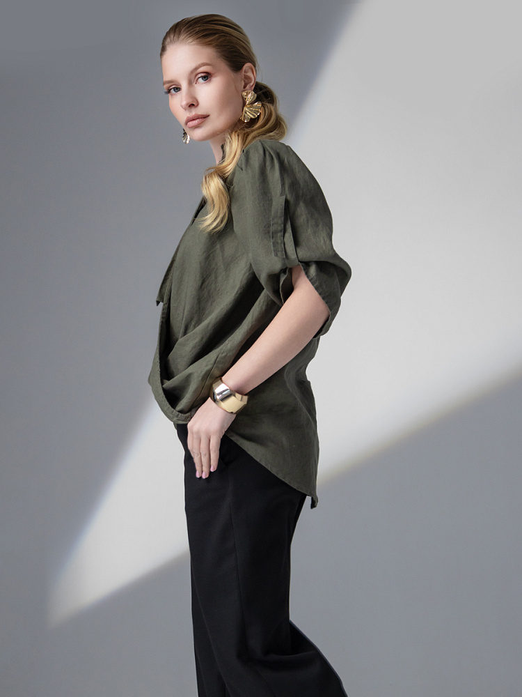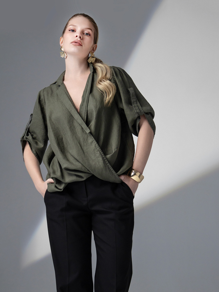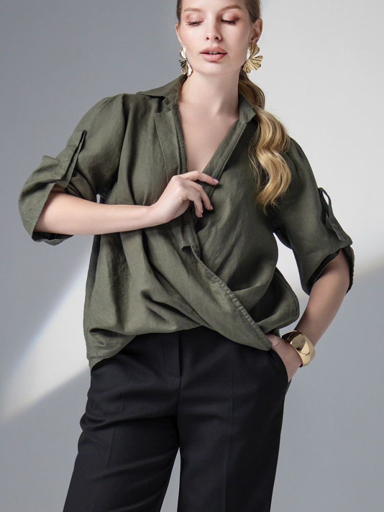Чувственные глубокие складки натурального льна не оставят никого равнодушными. Да и как можно устоять перед таким великолепием форм, которые демонстрирует представленная модель блузы. Свободный силуэт полностью подчинён захлёстнутым одна на одну деталям передних половинок. Глубокие складки, которые при этом образовались плавно и вальяжно ниспадают на бёдра. Это многослойность создаёт трендовый внешний вид. V – образный вырез горловины, который образован подобной конструкцией, деликатно подчёркивает зону декольте. А если всё это дополнить бижутерией – повседневная блуза превратится в вечерний вариант. Стояче – отложной воротник – как лаконичное продолжение силуэта. Втачной рукав имеет складки по шву втачивания, которые звучат «в унисон» с общей концепцией. Удлинённый хлястик на коротком рукаве несёт не только практическую функцию, но и ещё более стилизует модель. Такому многообразию декора сдержанная и «не многословная» спинка не возражает, демонстрируя простоту конструкции. Каждая из вас может подобрать свой вариант представленной блузы в различном цветовом исполнении.