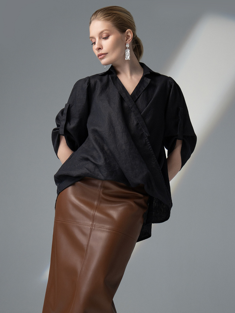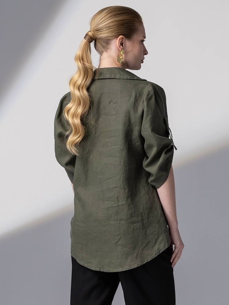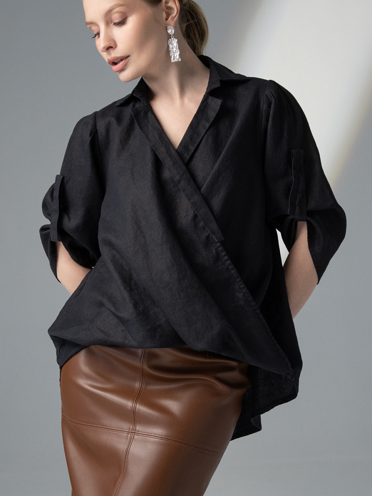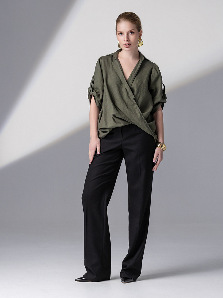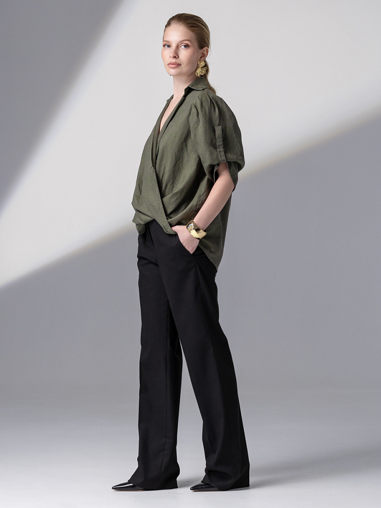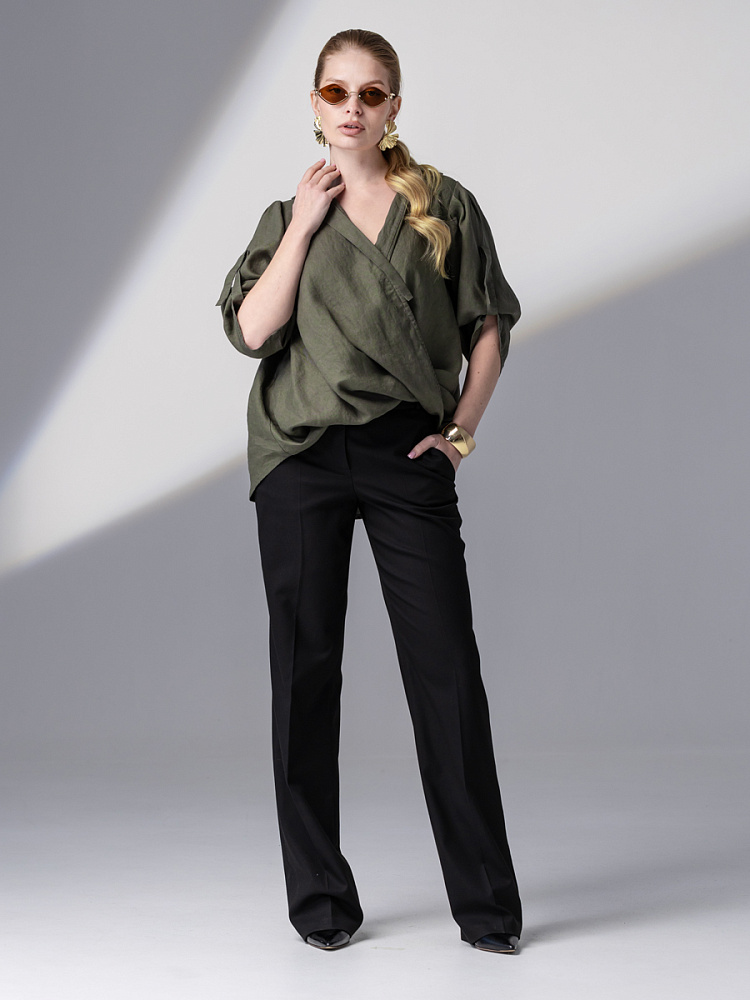 Чувственные глубокие складки натурального льна не оставят никого равнодушными. Да и как можно устоять перед таким великолепием форм, которые демонстрирует представленная модель блузы. Свободный силуэт полностью подчинён захлёстнутым одна на одну деталям передних половинок. Глубокие складки, которые при этом образовались плавно и вальяжно ниспадают на бёдра. Это многослойность создаёт трендовый внешний вид. V – образный вырез горловины, который образован подобной конструкцией, деликатно подчёркивает зону декольте. А если всё это дополнить бижутерией – повседневная блуза превратится в вечерний вариант. Стояче – отложной воротник – как лаконичное продолжение силуэта. Втачной рукав имеет складки по шву втачивания, которые звучат «в унисон» с общей концепцией. Удлинённый хлястик на коротком рукаве несёт не только практическую функцию, но и ещё более стилизует модель. Такому многообразию декора сдержанная и «не многословная» спинка не возражает, демонстрируя простоту конструкции. Каждая из вас может подобрать свой вариант представленной блузы в различном цветовом исполнении.