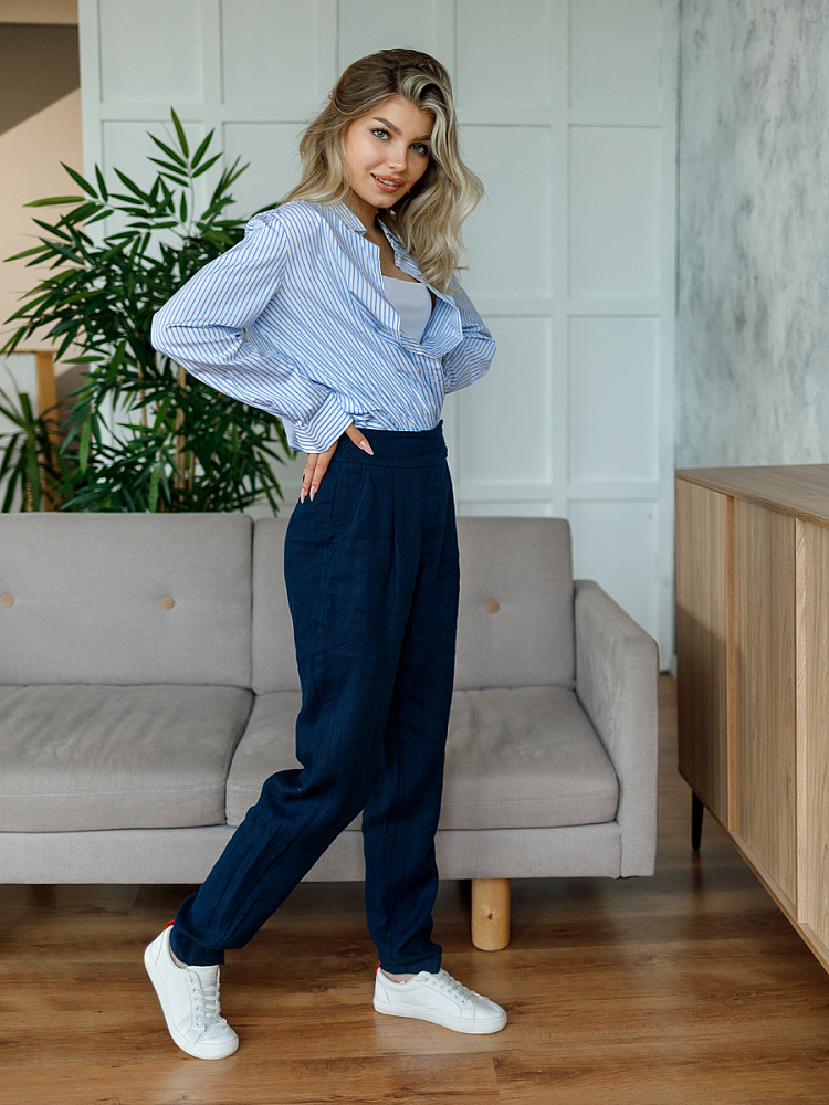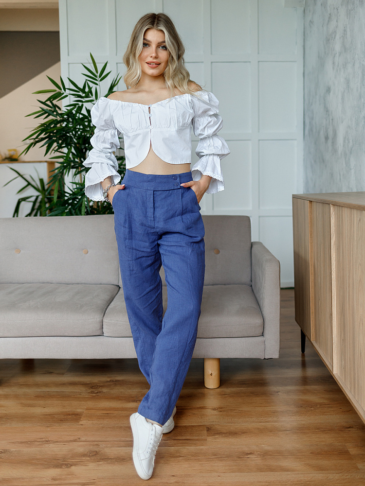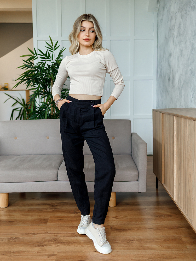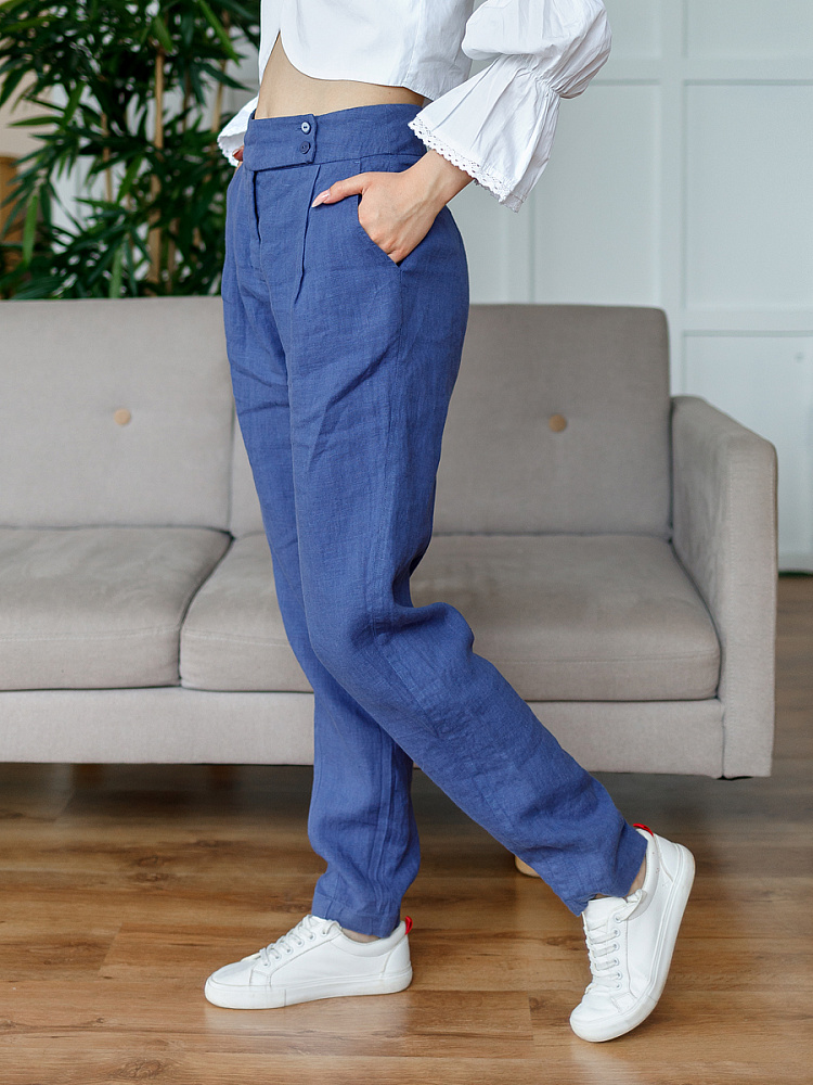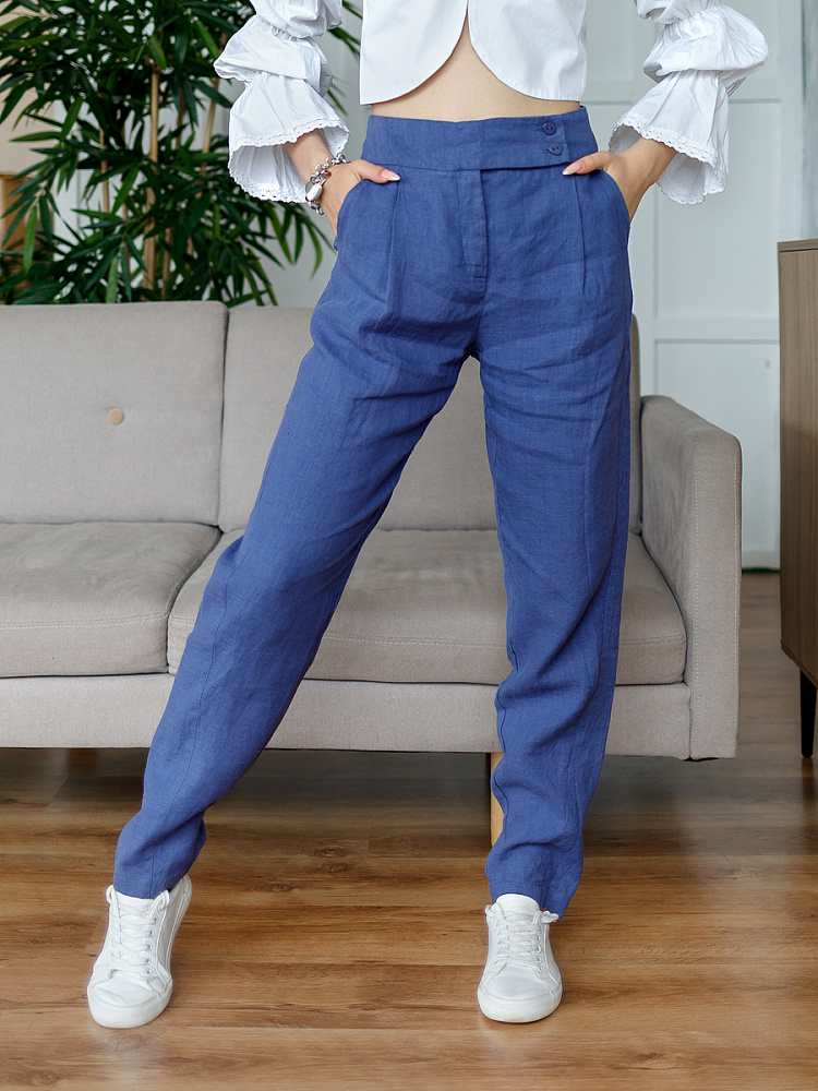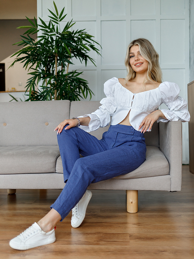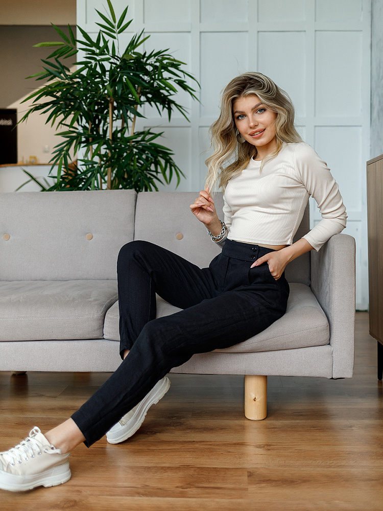 Всегда лаконично и грамотно дополнить базовый гардероб способны брюки. Однако, нужно очень внимательно подойти к подбору кроя и стилистике данной модели. Безусловно, это должен быть классический прямой крой без излишнего декора, карманов, контрастной отстрочки и приглушённой цветовой палитры. Помним, что мы комплектуем дуэты не на один сезон, их сочетания не должны вызывать сомнений. Если эти брюки будут выполнены из натуральных материалов – это добавит наибольшего благородства вашему образу, а телу подарит невероятный комфорт, особенно если речь идёт о модели летних брюк. С поставленными задачами прекрасно справится представленная модель брюк! Прямой классический крой с прекрасной посадкой на фигуре будет актуален в любое время. Широкий пояс великолепно подчёркивает талию, а глубокие складки в сочетании с боковыми карманами придают плавность женским формам. Благородный натуральный лён, из которого выполнены брюки, окутают свою обладательницу невероятным комфортом.