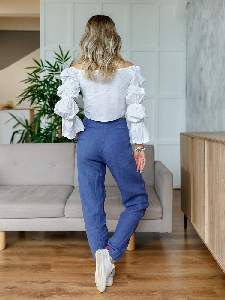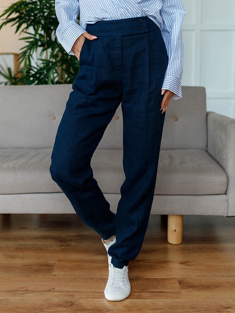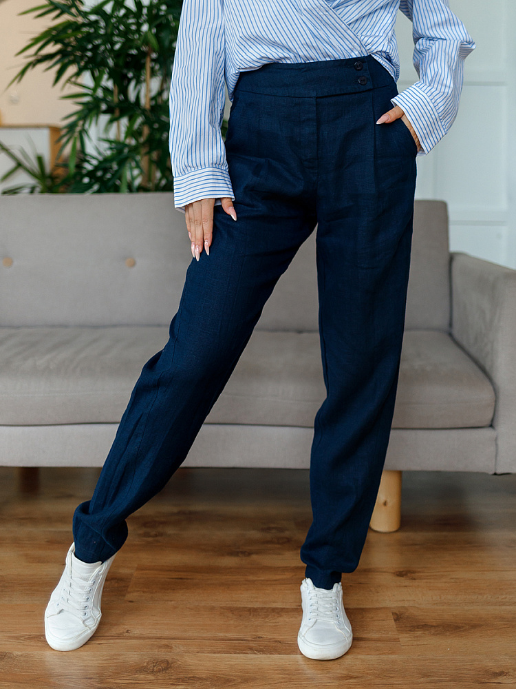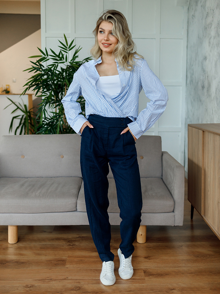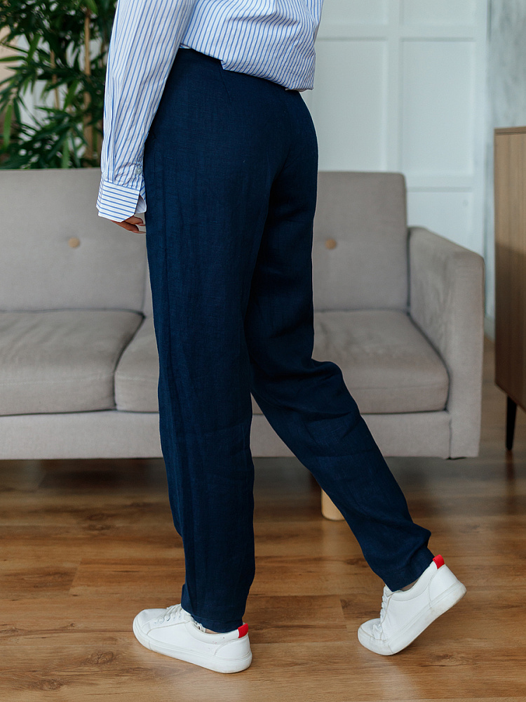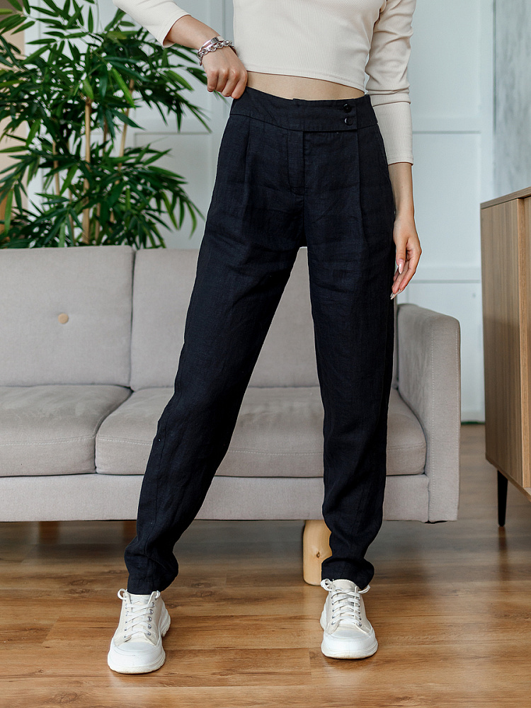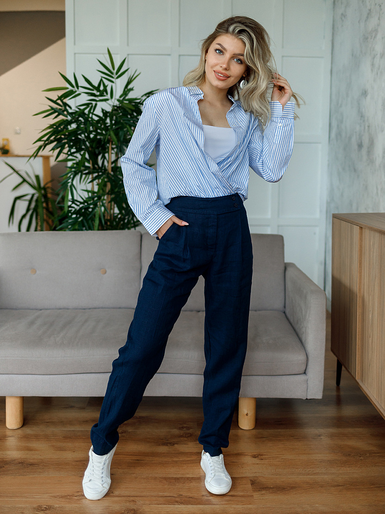 Всегда лаконично и грамотно дополнить базовый гардероб способны брюки. Однако, нужно очень внимательно подойти к подбору кроя и стилистике данной модели. Безусловно, это должен быть классический прямой крой без излишнего декора, карманов, контрастной отстрочки и приглушённой цветовой палитры. Помним, что мы комплектуем дуэты не на один сезон, их сочетания не должны вызывать сомнений. Если эти брюки будут выполнены из натуральных материалов – это добавит наибольшего благородства вашему образу, а телу подарит невероятный комфорт, особенно если речь идёт о модели летних брюк. С поставленными задачами прекрасно справится представленная модель брюк! Прямой классический крой с прекрасной посадкой на фигуре будет актуален в любое время. Широкий пояс великолепно подчёркивает талию, а глубокие складки в сочетании с боковыми карманами придают плавность женским формам. Благородный натуральный лён, из которого выполнены брюки, окутают свою обладательницу невероятным комфортом.