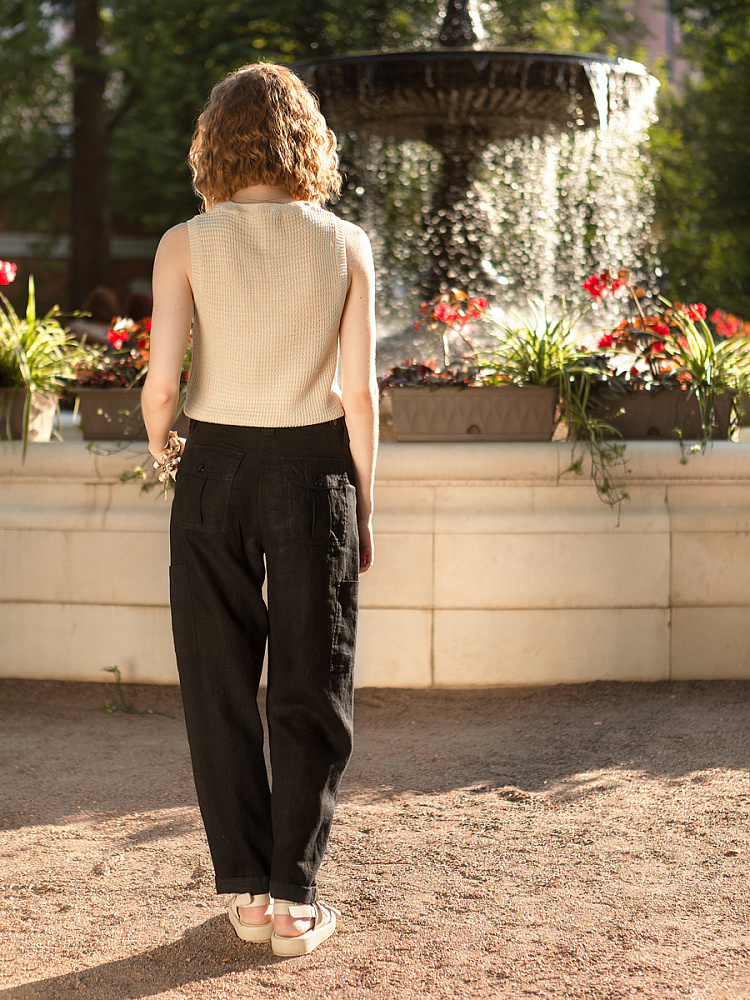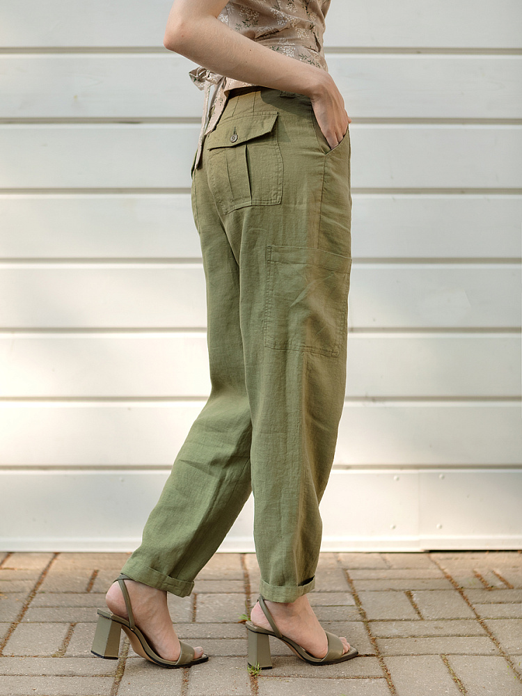 Лето – лучшая пора для хулиганства, в хорошем смысле этого слова. А когда ещё можно позволит себе смелые и чуть небрежные «наряды», объёмные формы и расслабленный декор. Именно летние вещи не обременены верхней одеждой, что позволяет демонстрировать их «во всей красе». Обратите внимание н представленную модель брюк из натурального льна, который снискал всеобщую любовь и популярность. Прямой силуэт, чуть зауженный к низу, прекрасно сочетается с самой разнообразной обувью, будь то каблук или сандалии на плоском ходу. В зависимости от вашего роста и стилистических пристрастий брюки можно подвернуть снизу, создавая элемент лёгкой небрежности. На это намекают и вертикальные швы, усиленные декоративной строчкой и большие накладные карманы на задней и боковой части брюк. Карманы на передней части «отвечают» за практичность модели. Линию талии подчёркивает пояс с декоративными хлястиками и широкими шлёвками, которые могу фиксировать красивый ремень дополняющий образ.