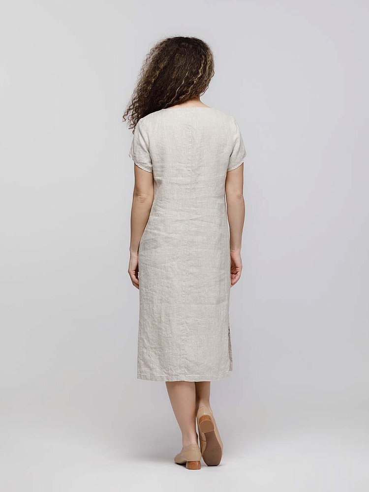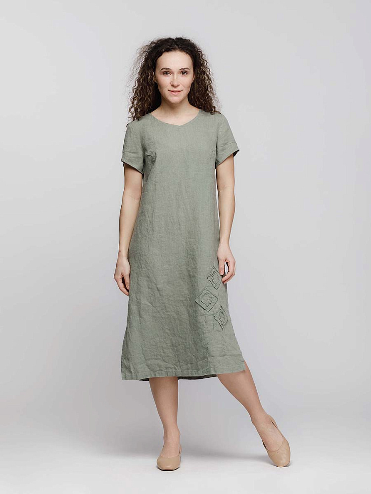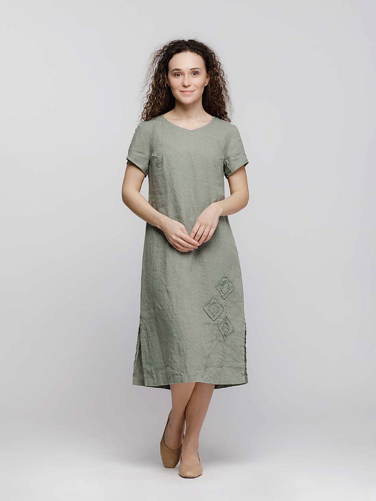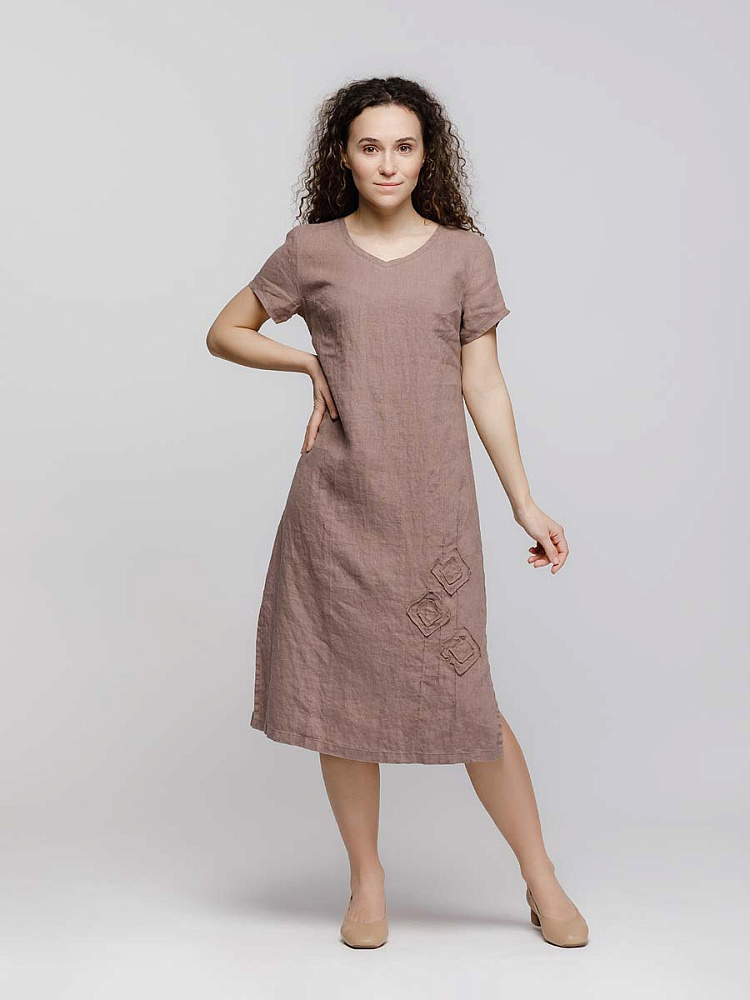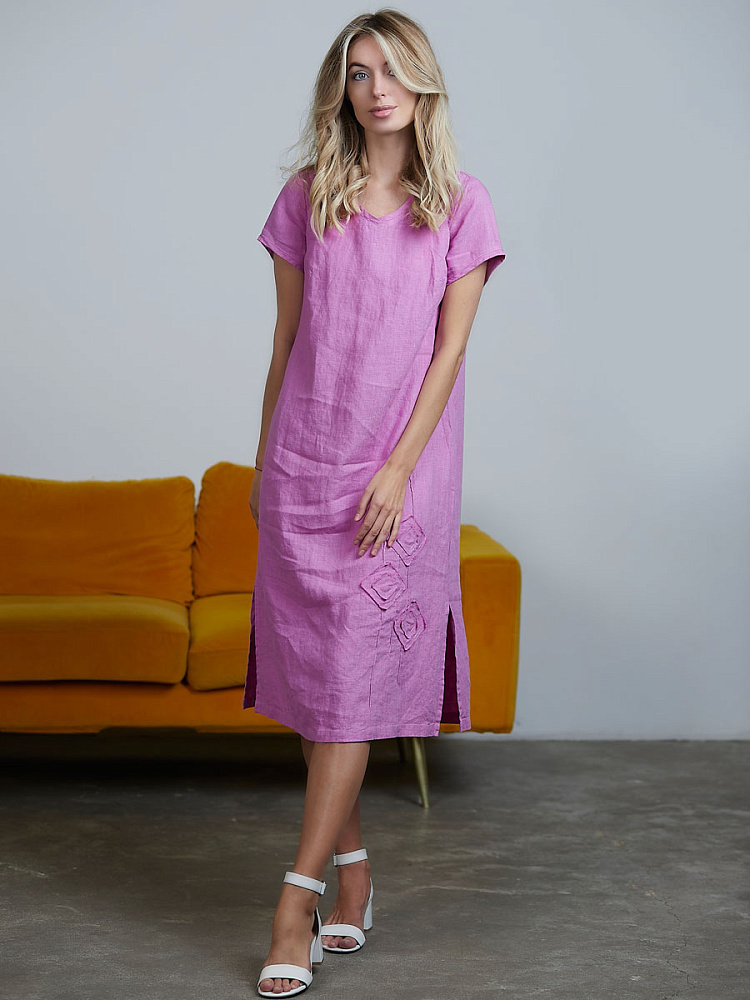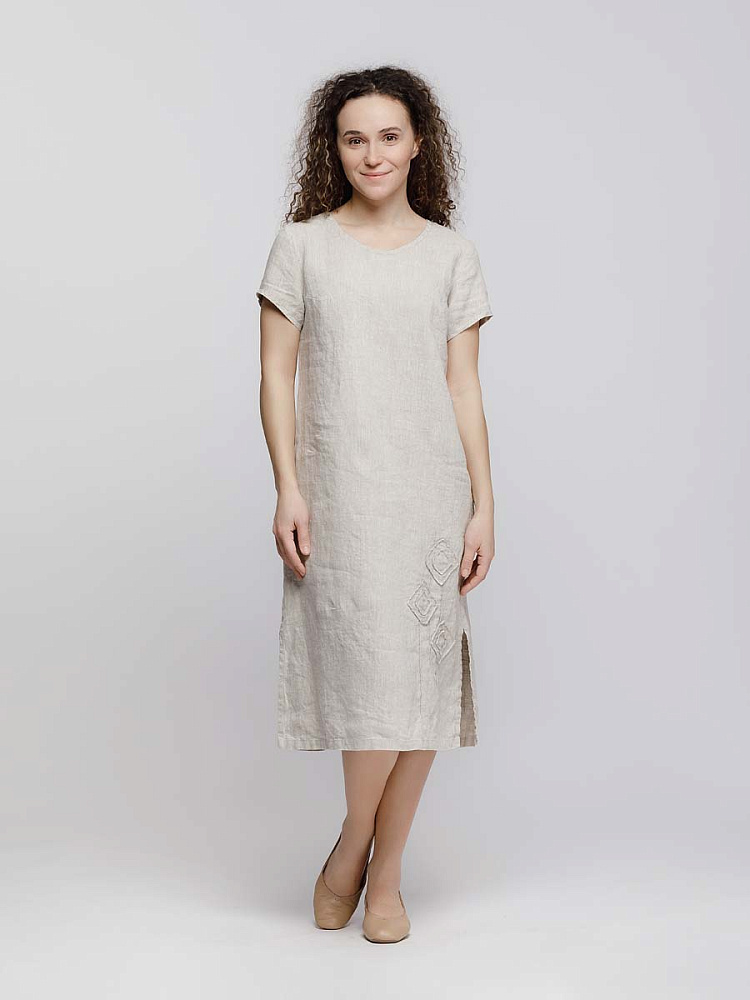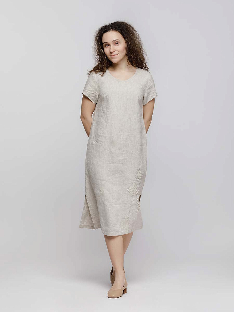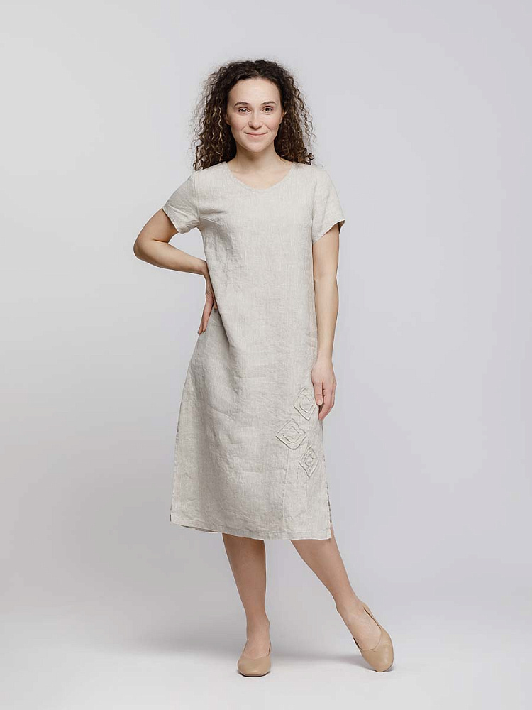 Геометрия линий, представленного платья, наверняка понравиться взвешенным и целеустремлённым натурам. Полуприлегающий силуэт лаконично подчёркивает длину миди и разрезы в боковых швах. Короткий рукав в сочетании с V – образным вырезом горловины продолжают привносить в образ строгость прямых линий. В декоре ничего лишнего. Единственный стилистический акцент модели это фактурный орнамент в нижней части полочки. Объёмные ромбы с необработанными срезами выглядят самобытно на жатой текстуре льна. А вертикальные полосы служат основой замысла дизайнера. Цветовые решения платья, весьма, скромны и наброски. И это может служить большим плюсом модели при его использовании. Оно позволяет любые цветовые сочетания обуви, бижутерии и аксессуаров. Вам не понадобиться много времени, чтобы найти идеальный дуэт к этому летнему платью.