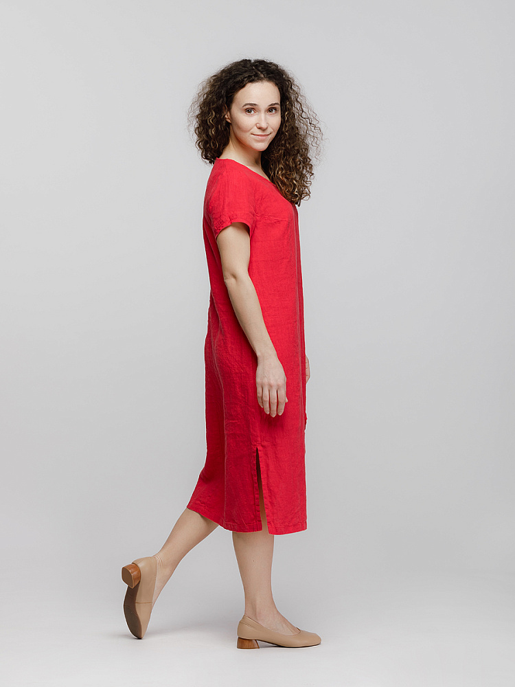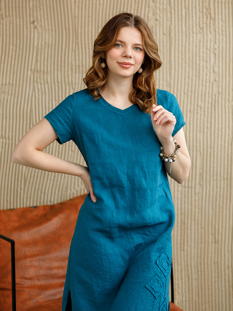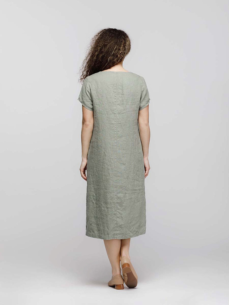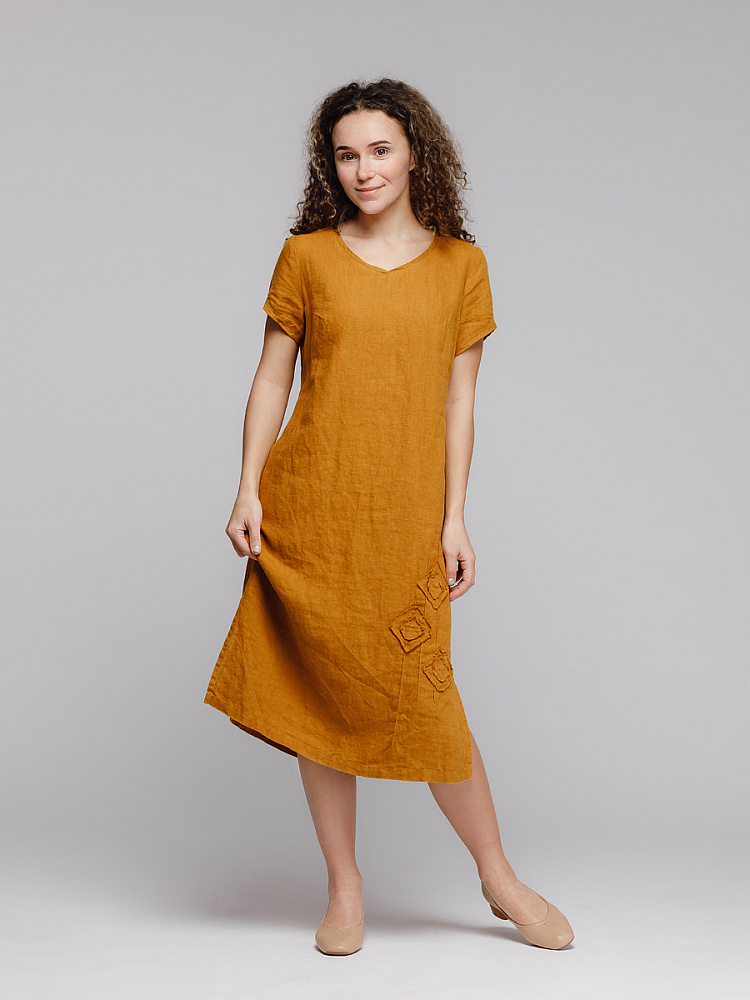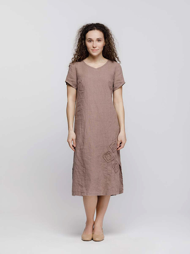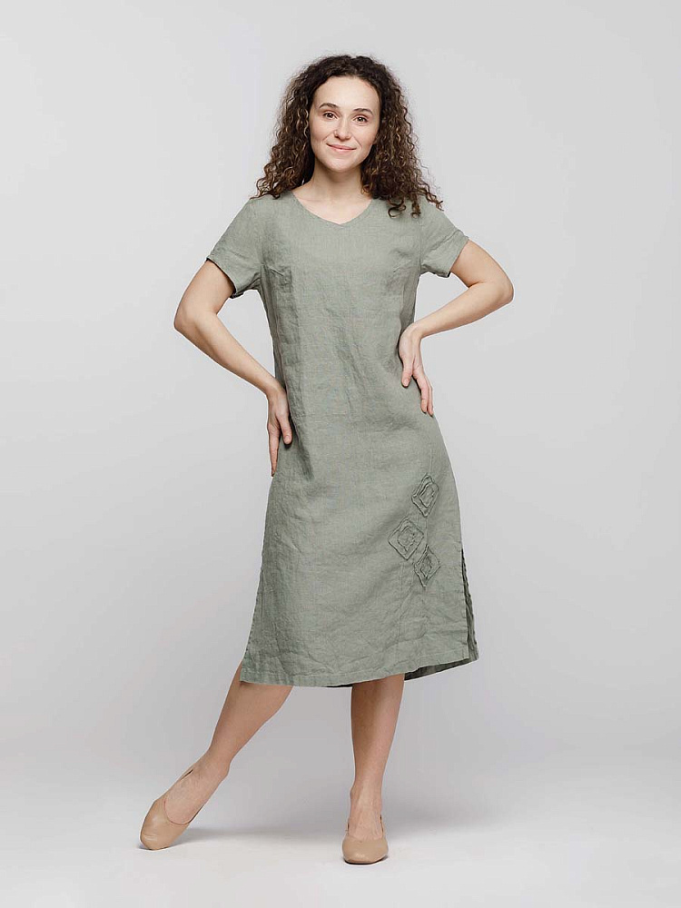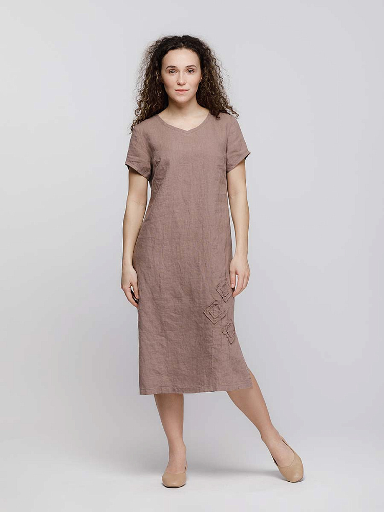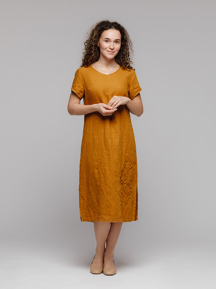 Геометрия линий, представленного платья, наверняка понравиться взвешенным и целеустремлённым натурам. Полуприлегающий силуэт лаконично подчёркивает длину миди и разрезы в боковых швах. Короткий рукав в сочетании с V – образным вырезом горловины продолжают привносить в образ строгость прямых линий. В декоре ничего лишнего. Единственный стилистический акцент модели это фактурный орнамент в нижней части полочки. Объёмные ромбы с необработанными срезами выглядят самобытно на жатой текстуре льна. А вертикальные полосы служат основой замысла дизайнера. Цветовые решения платья, весьма, скромны и наброски. И это может служить большим плюсом модели при его использовании. Оно позволяет любые цветовые сочетания обуви, бижутерии и аксессуаров. Вам не понадобиться много времени, чтобы найти идеальный дуэт к этому летнему платью.