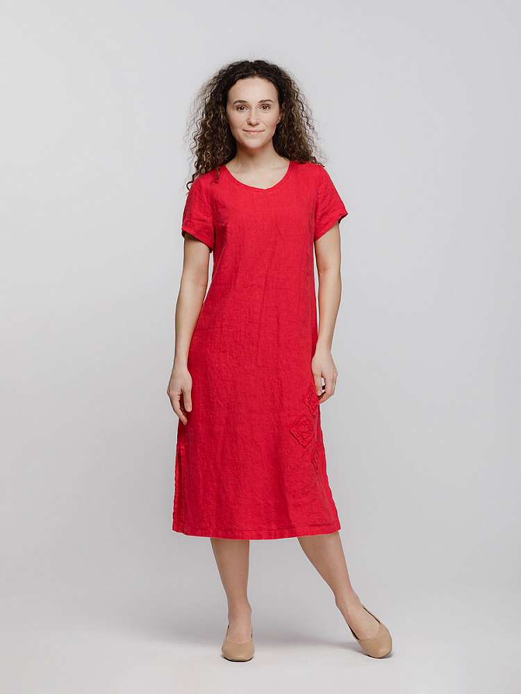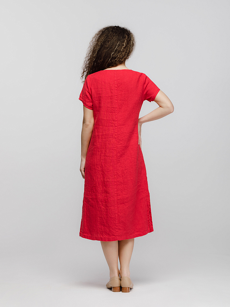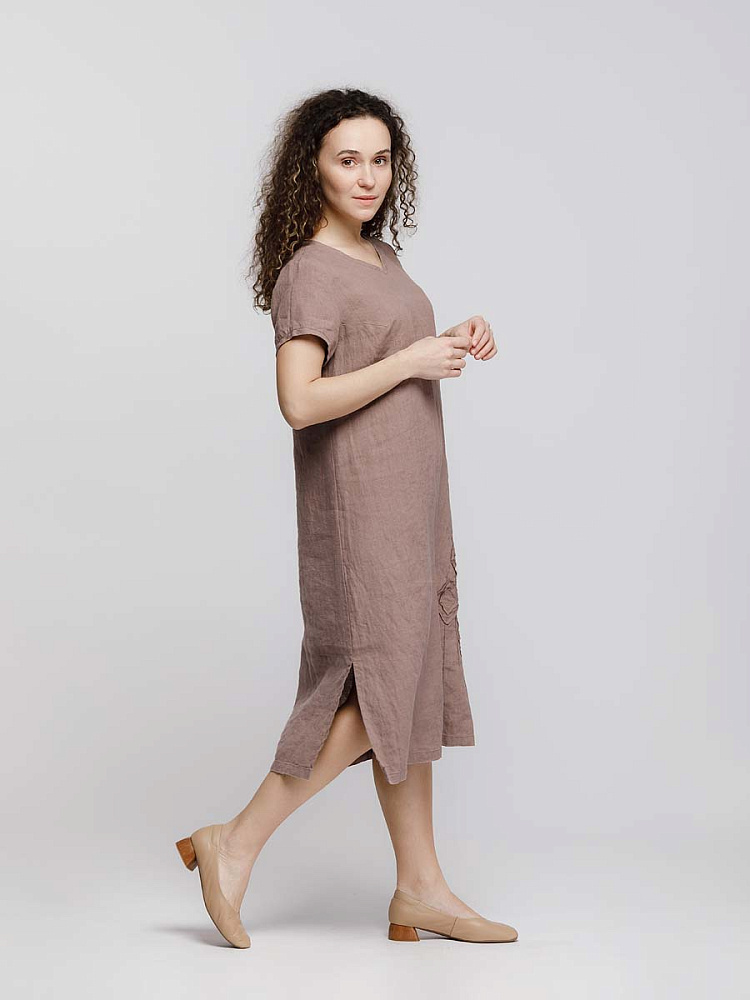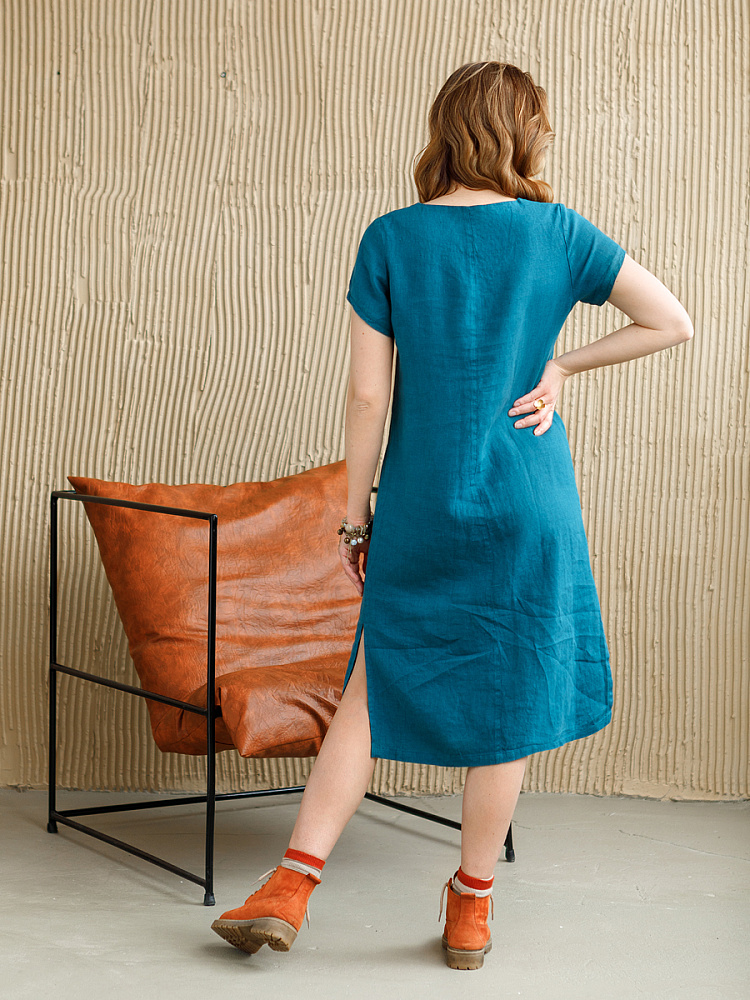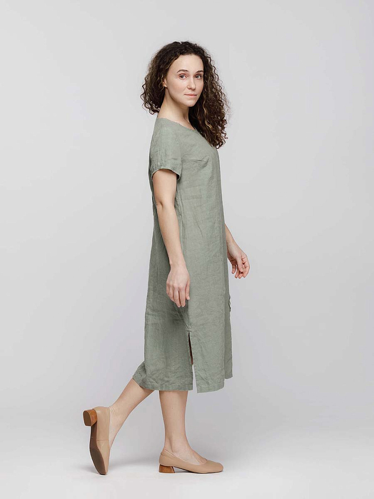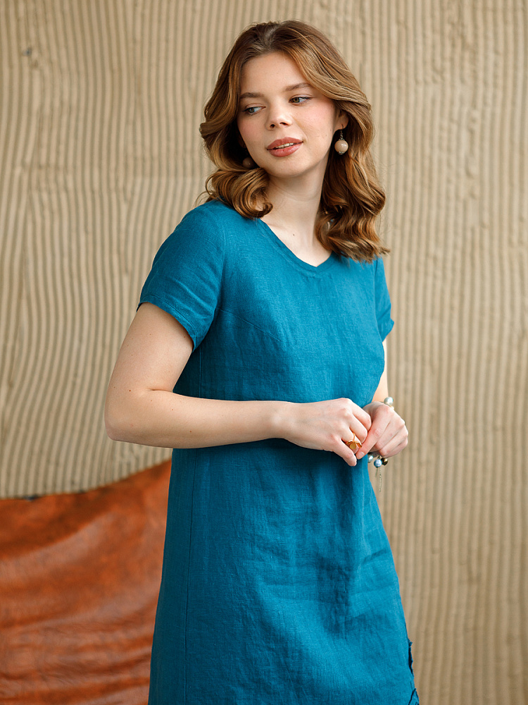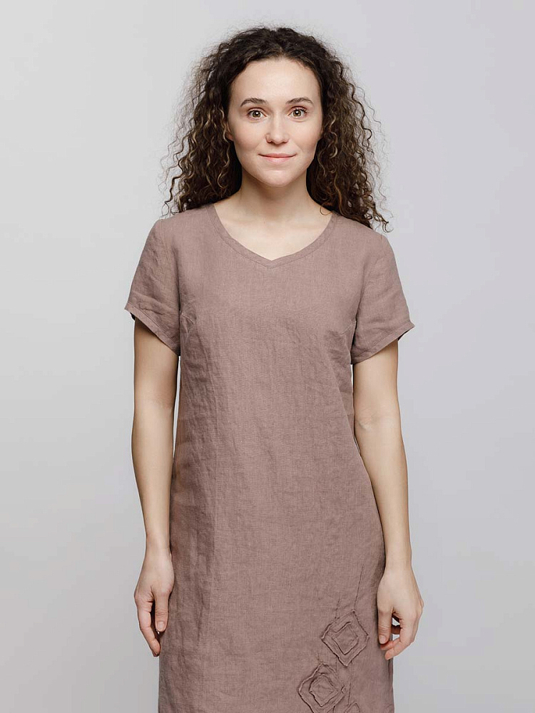 Геометрия линий, представленного платья, наверняка понравиться взвешенным и целеустремлённым натурам. Полуприлегающий силуэт лаконично подчёркивает длину миди и разрезы в боковых швах. Короткий рукав в сочетании с V – образным вырезом горловины продолжают привносить в образ строгость прямых линий. В декоре ничего лишнего. Единственный стилистический акцент модели это фактурный орнамент в нижней части полочки. Объёмные ромбы с необработанными срезами выглядят самобытно на жатой текстуре льна. А вертикальные полосы служат основой замысла дизайнера. Цветовые решения платья, весьма, скромны и наброски. И это может служить большим плюсом модели при его использовании. Оно позволяет любые цветовые сочетания обуви, бижутерии и аксессуаров. Вам не понадобиться много времени, чтобы найти идеальный дуэт к этому летнему платью.