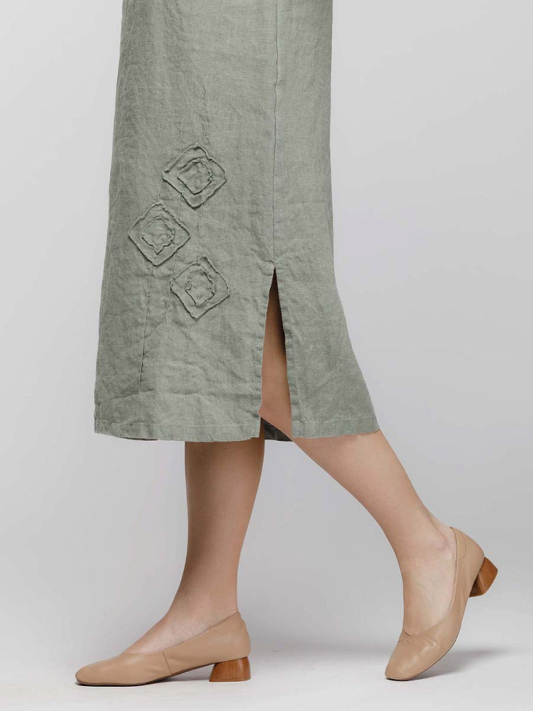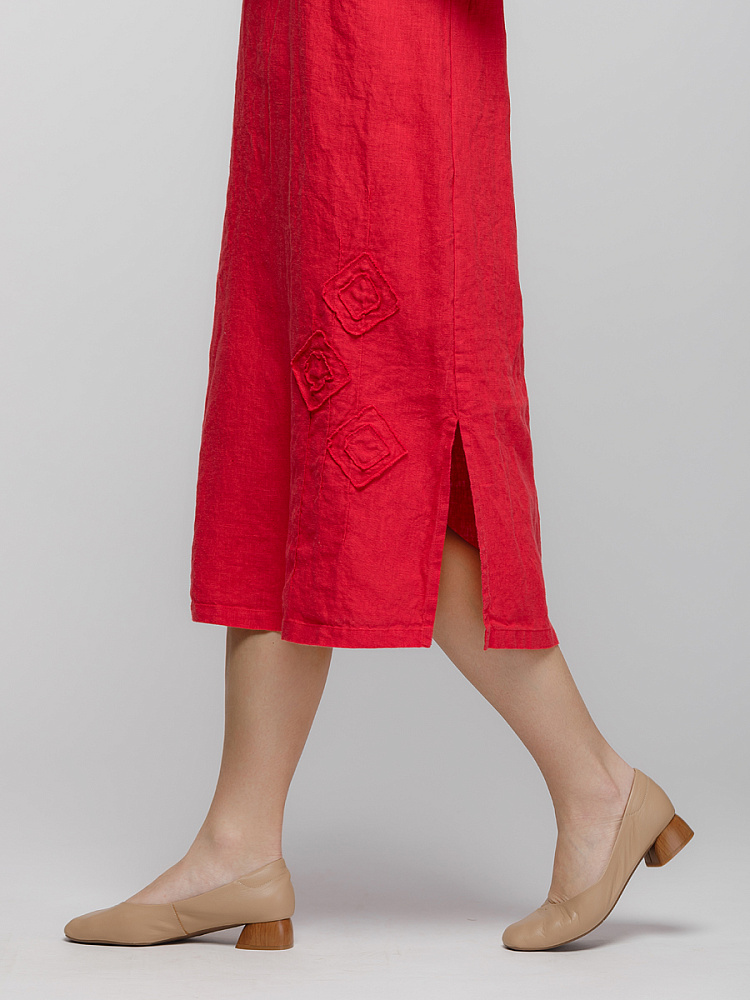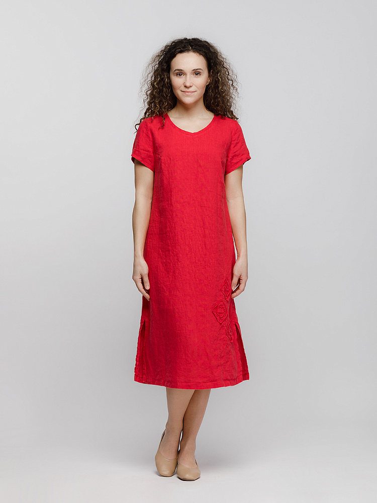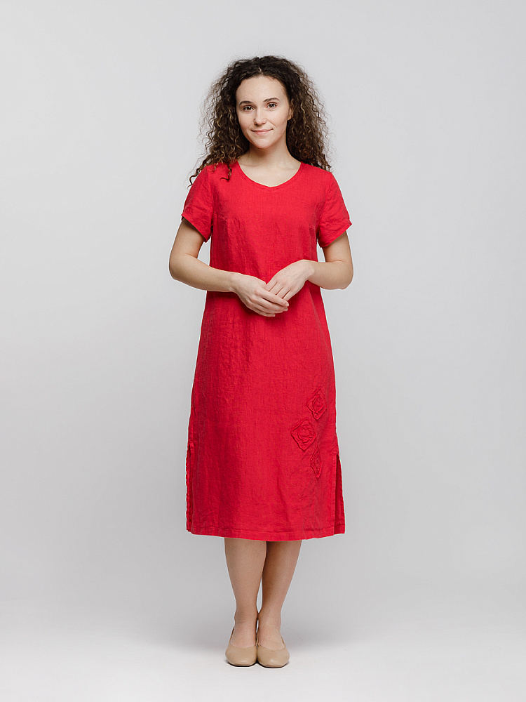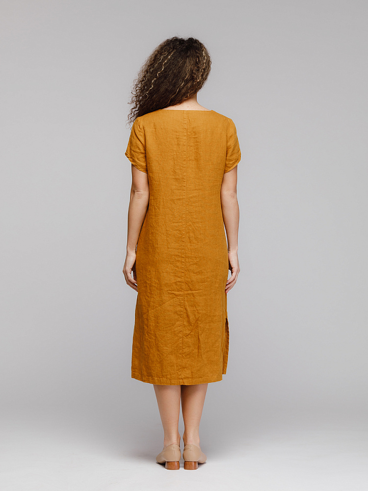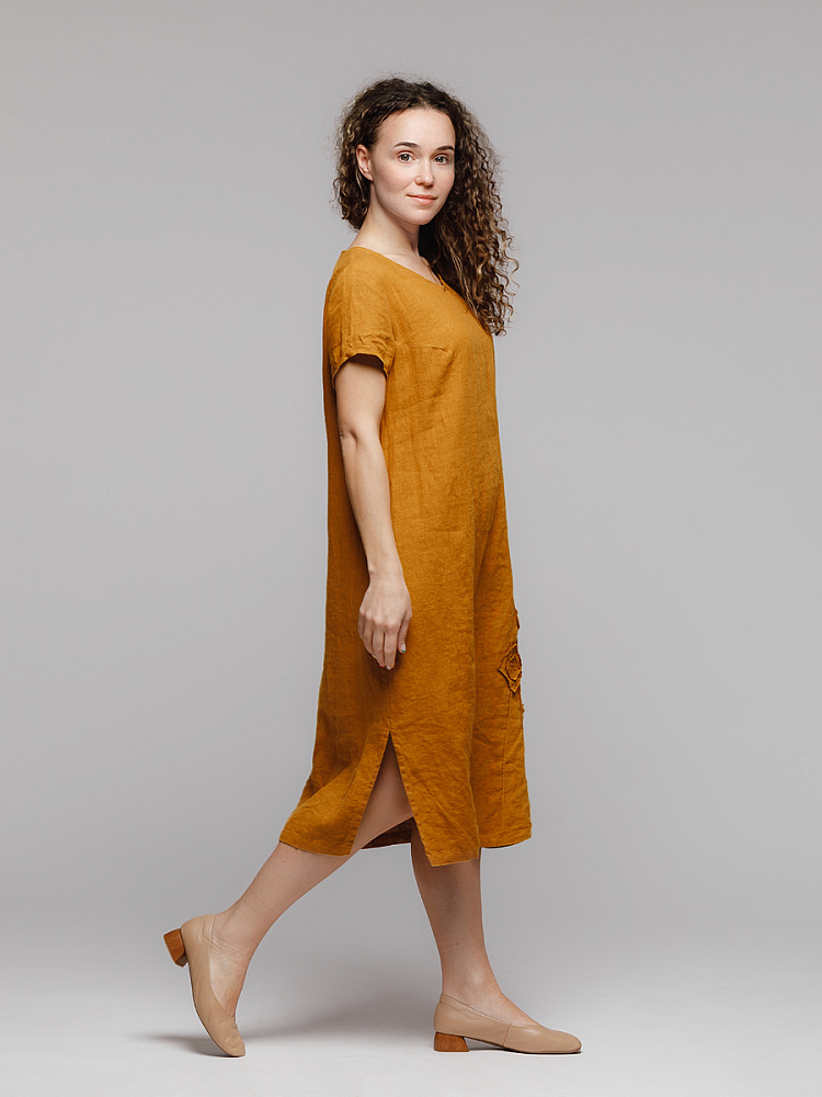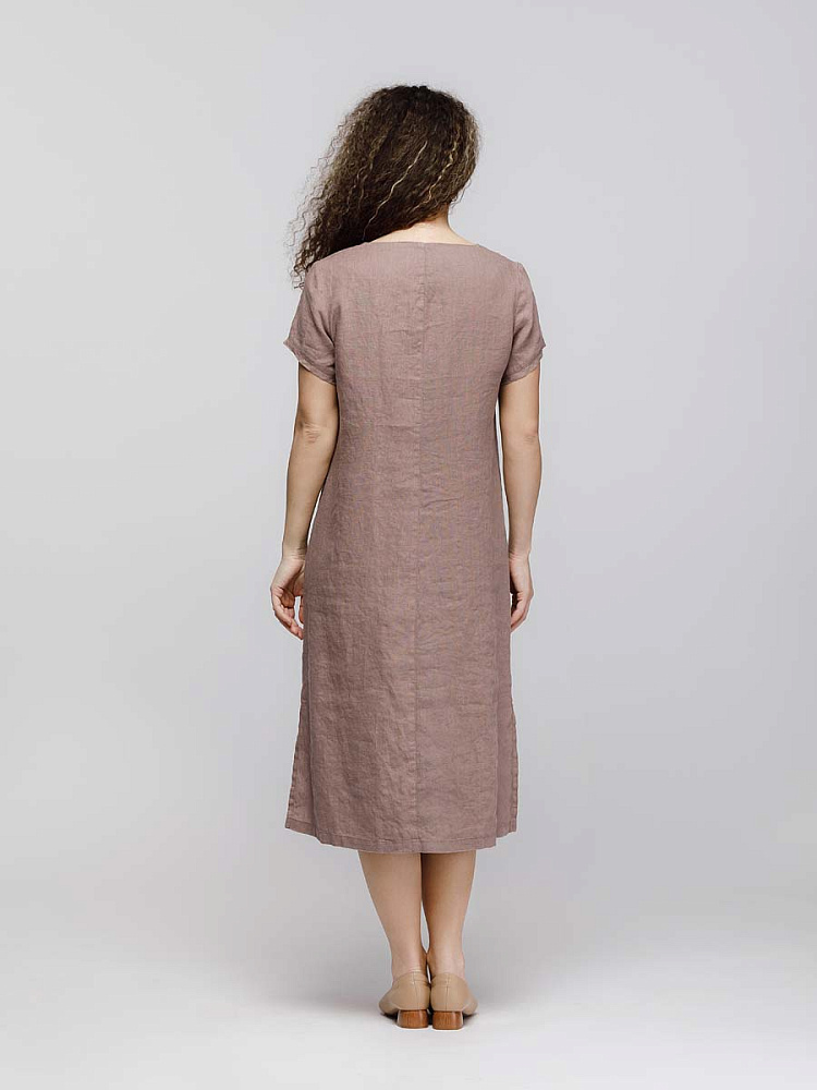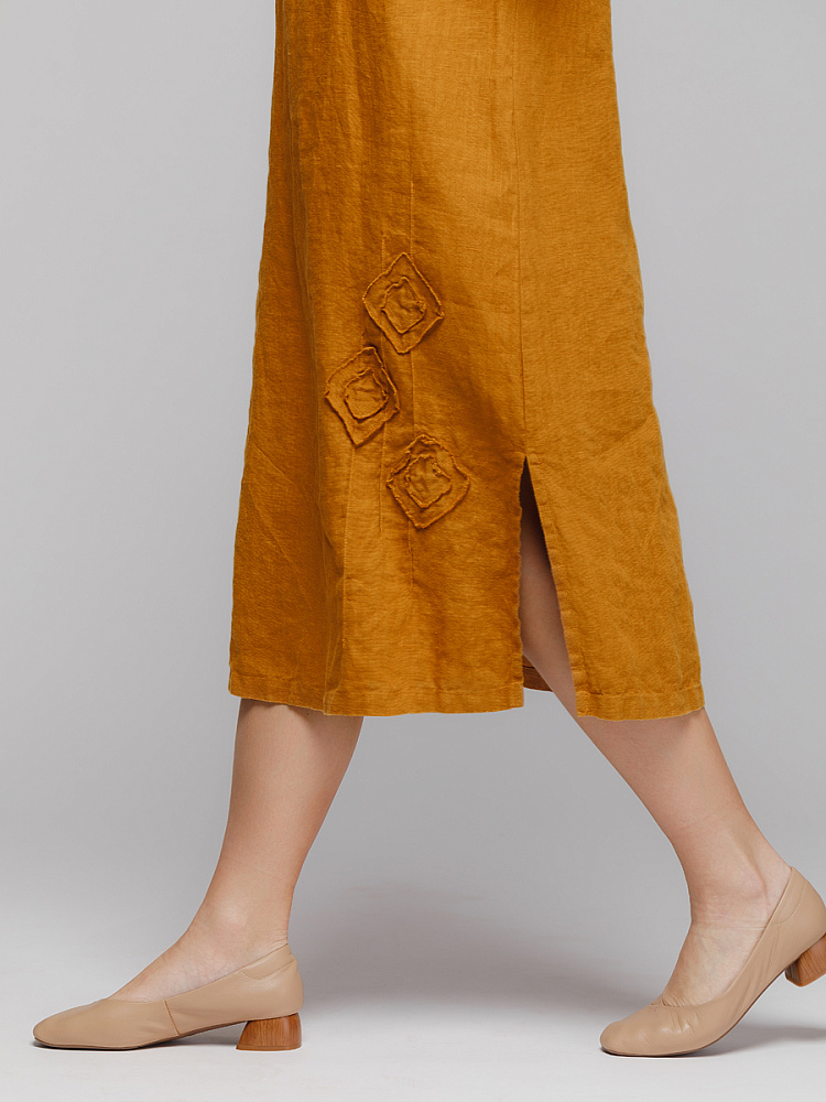 Геометрия линий, представленного платья, наверняка понравиться взвешенным и целеустремлённым натурам. Полуприлегающий силуэт лаконично подчёркивает длину миди и разрезы в боковых швах. Короткий рукав в сочетании с V – образным вырезом горловины продолжают привносить в образ строгость прямых линий. В декоре ничего лишнего. Единственный стилистический акцент модели это фактурный орнамент в нижней части полочки. Объёмные ромбы с необработанными срезами выглядят самобытно на жатой текстуре льна. А вертикальные полосы служат основой замысла дизайнера. Цветовые решения платья, весьма, скромны и наброски. И это может служить большим плюсом модели при его использовании. Оно позволяет любые цветовые сочетания обуви, бижутерии и аксессуаров. Вам не понадобиться много времени, чтобы найти идеальный дуэт к этому летнему платью.