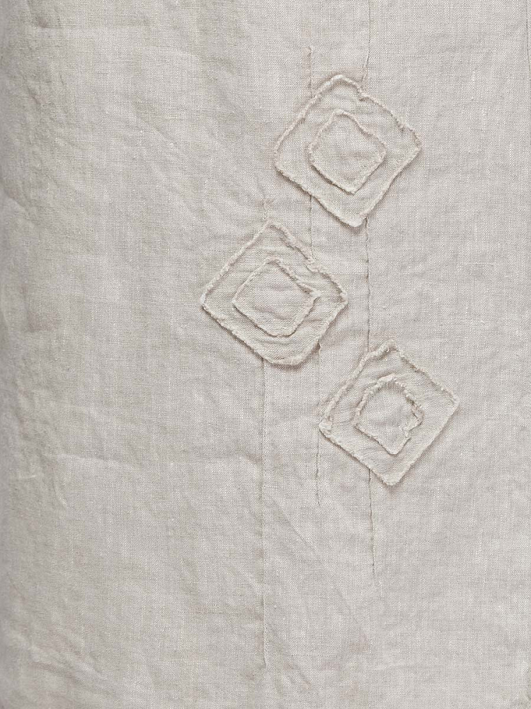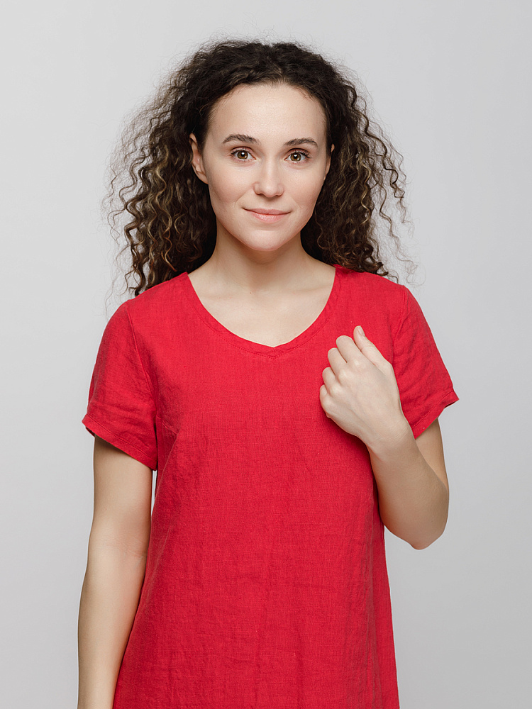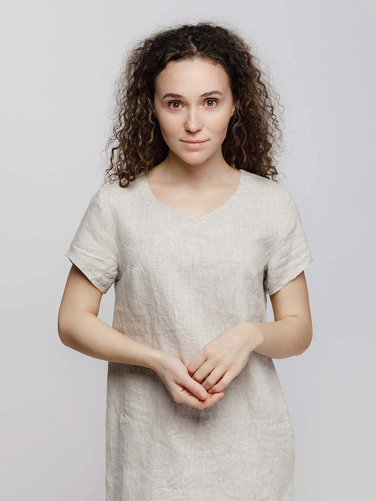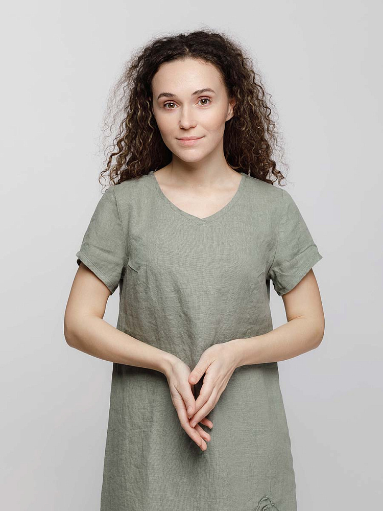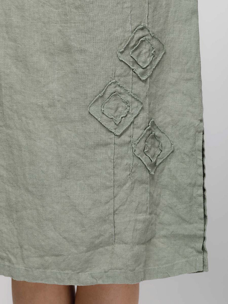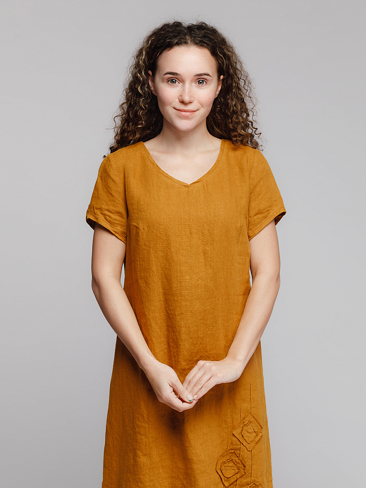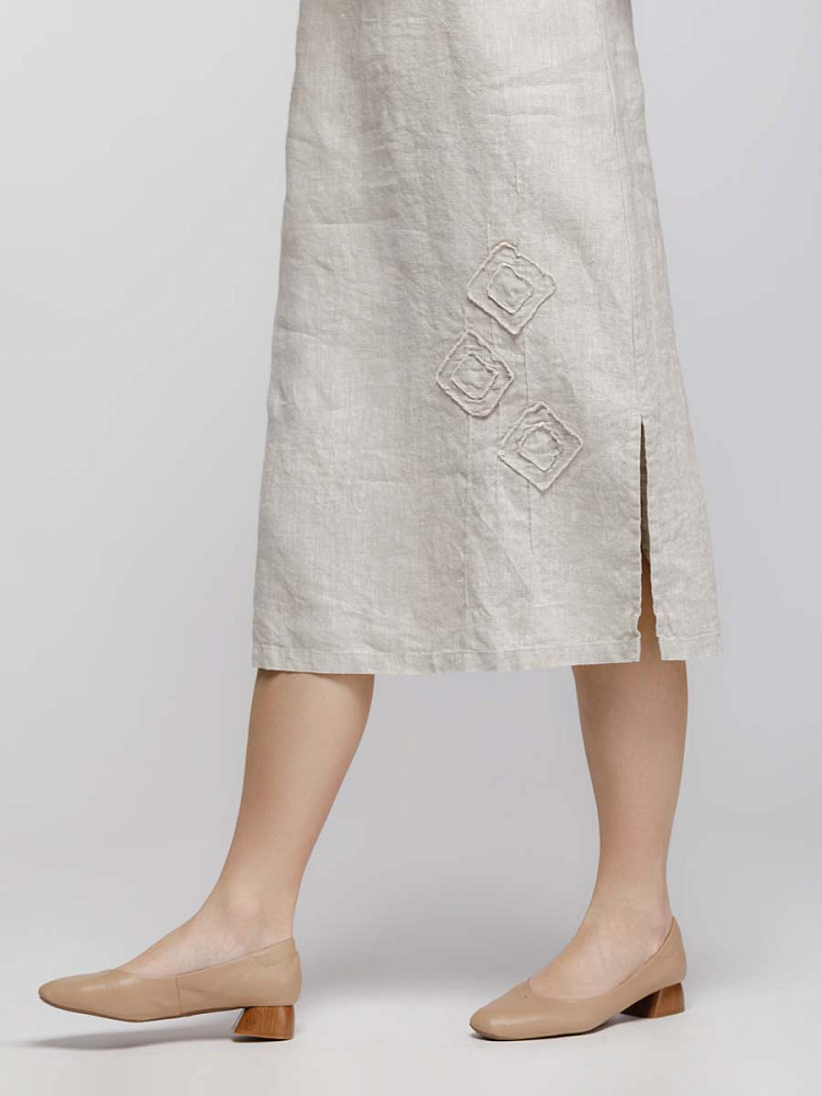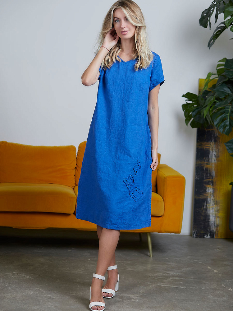 Геометрия линий, представленного платья, наверняка понравиться взвешенным и целеустремлённым натурам. Полуприлегающий силуэт лаконично подчёркивает длину миди и разрезы в боковых швах. Короткий рукав в сочетании с V – образным вырезом горловины продолжают привносить в образ строгость прямых линий. В декоре ничего лишнего. Единственный стилистический акцент модели это фактурный орнамент в нижней части полочки. Объёмные ромбы с необработанными срезами выглядят самобытно на жатой текстуре льна. А вертикальные полосы служат основой замысла дизайнера. Цветовые решения платья, весьма, скромны и наброски. И это может служить большим плюсом модели при его использовании. Оно позволяет любые цветовые сочетания обуви, бижутерии и аксессуаров. Вам не понадобиться много времени, чтобы найти идеальный дуэт к этому летнему платью.