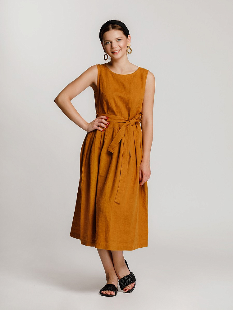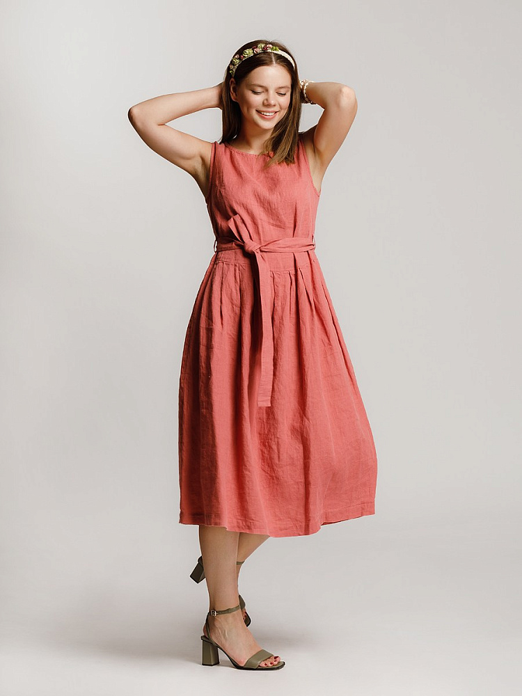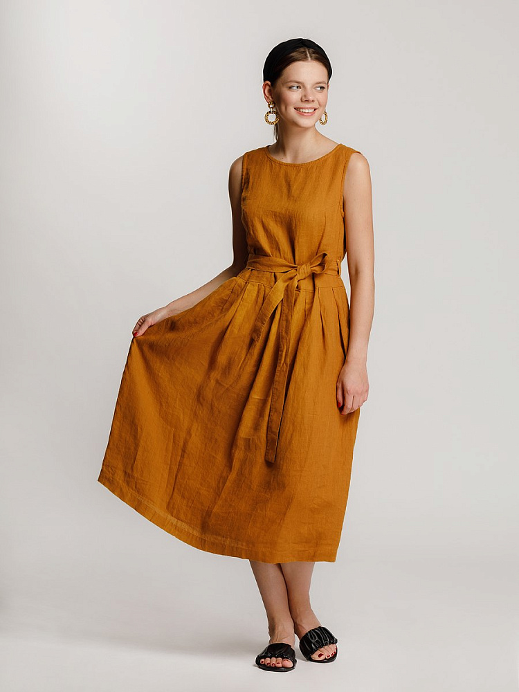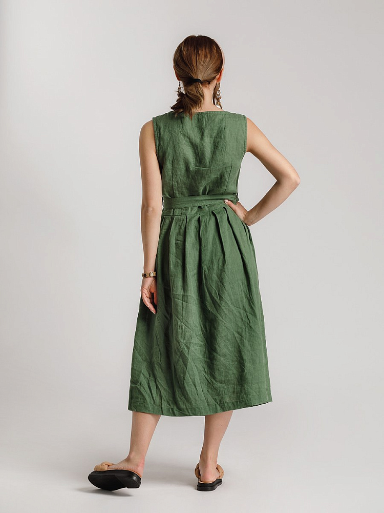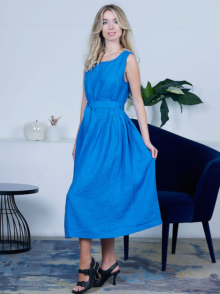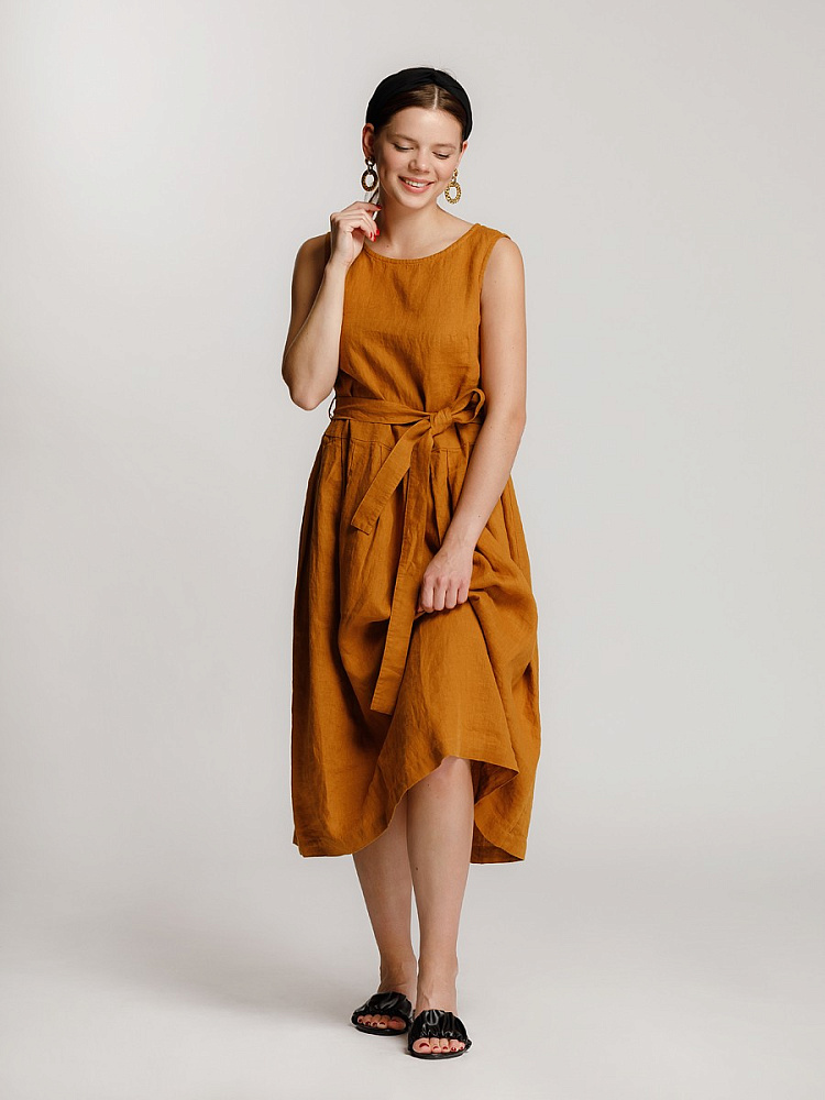 О представленной модели сарафана можно сказать – « не прост как кажется»! Его минималистические черты скрывают в себе роскошь натурального льна и самобытность форм. Несмотря на полуприлегающий силуэт, который не подразумевает акцент на талии, в данной модели она ярко подчёркнута поясом – кушаком и глубокими складками на юбке. Длинна миди, которой обладает сарафан – универсальна и подходит большинству девушек и женщин. Эта длина способна скорректировать пропорции фигуры практически до идеальных. Дух минимализма демонстрирует лиф. Его простой крой и лаконичный дизайн подчёркивает естественную красоту женщины. Плавная линия плеча и изгибы шеи великолепны на фоне жатой текстуры льна. Данный сарафан можно сочетать с любыми видами обуви, сумок и аксессуарами, которые можно подобрать в зависимости от ваших вкусовых предпочтений и функциональной направленности изделия.