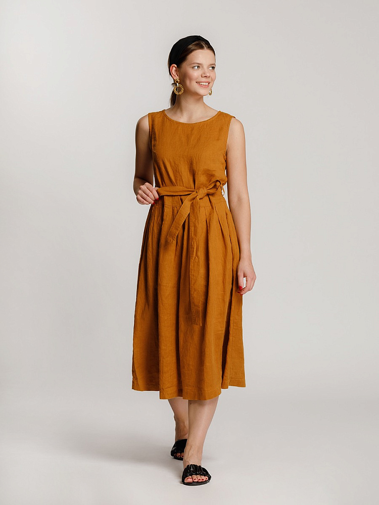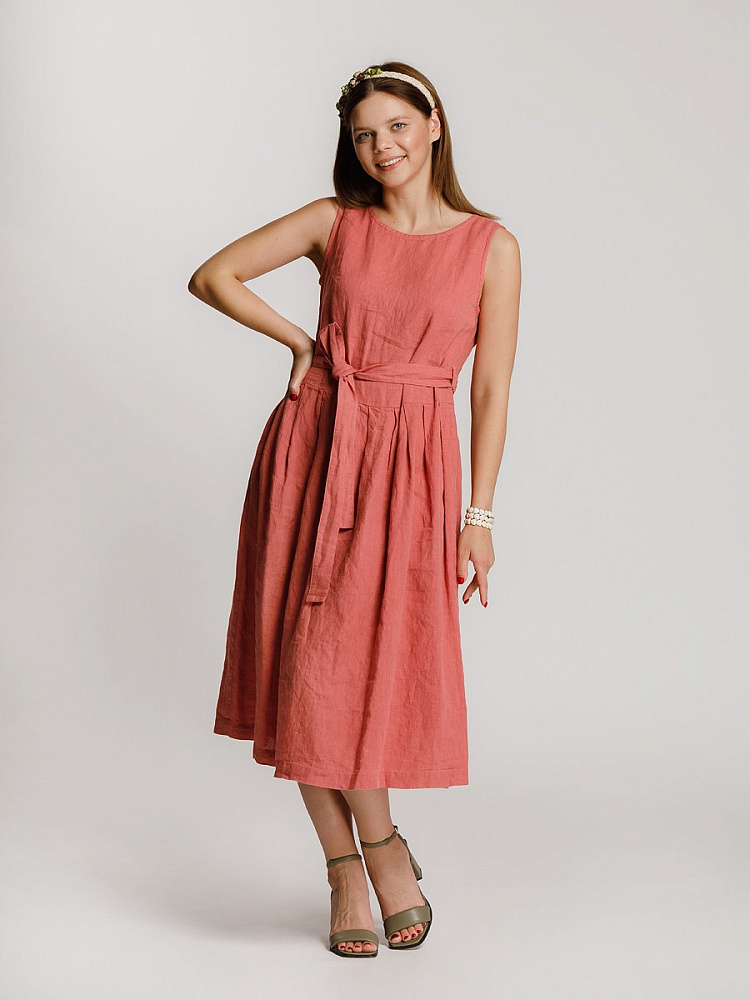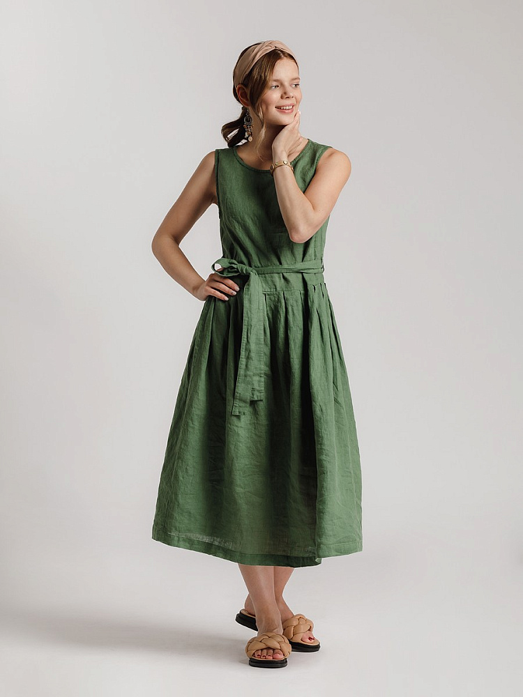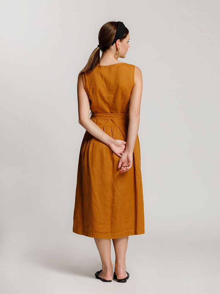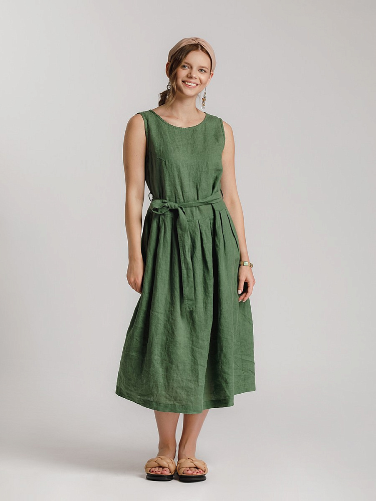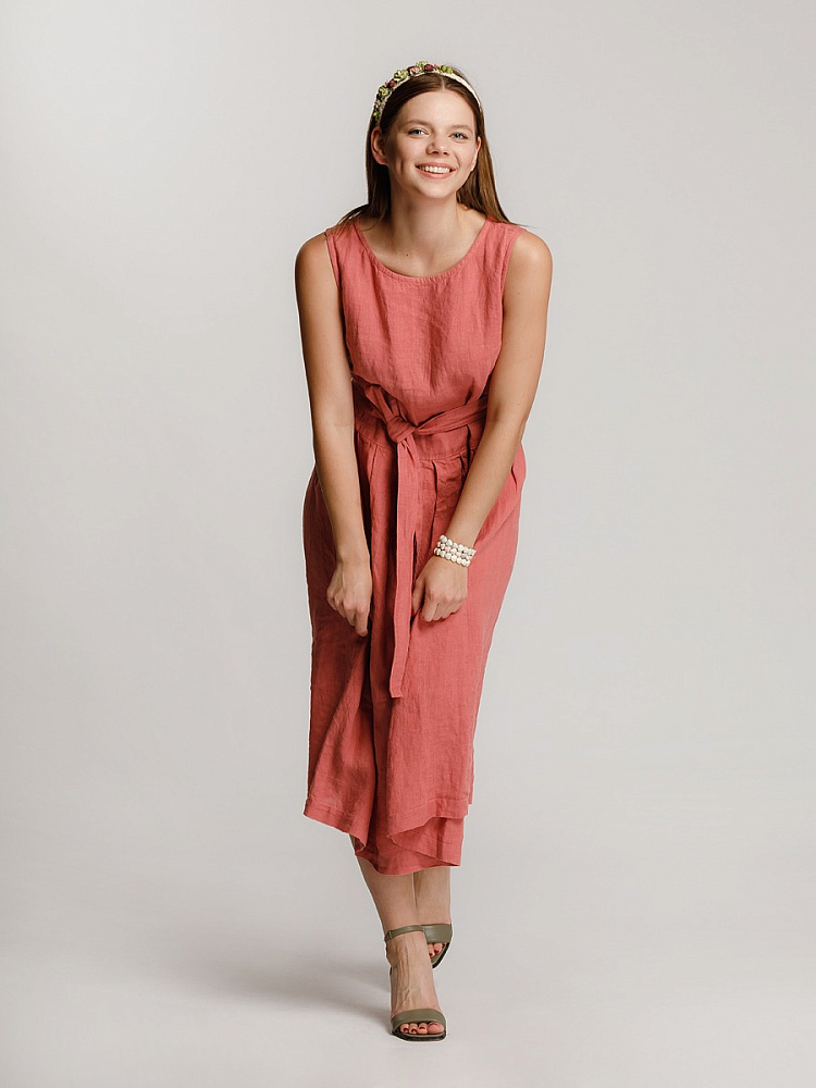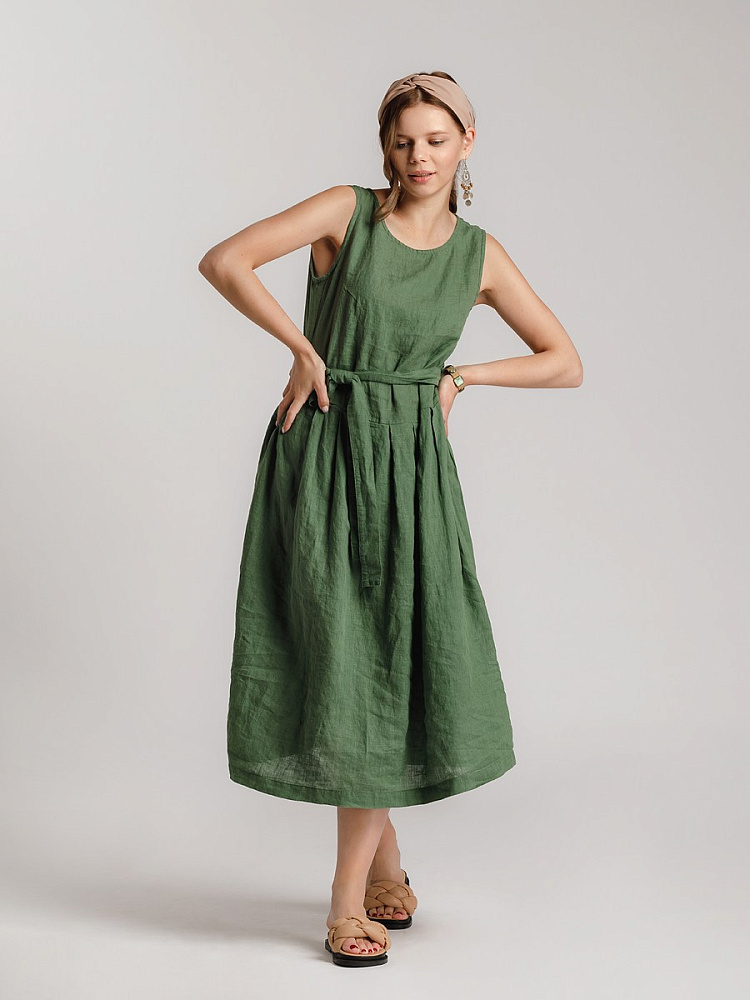 О представленной модели сарафана можно сказать – « не прост как кажется»! Его минималистические черты скрывают в себе роскошь натурального льна и самобытность форм. Несмотря на полуприлегающий силуэт, который не подразумевает акцент на талии, в данной модели она ярко подчёркнута поясом – кушаком и глубокими складками на юбке. Длинна миди, которой обладает сарафан – универсальна и подходит большинству девушек и женщин. Эта длина способна скорректировать пропорции фигуры практически до идеальных. Дух минимализма демонстрирует лиф. Его простой крой и лаконичный дизайн подчёркивает естественную красоту женщины. Плавная линия плеча и изгибы шеи великолепны на фоне жатой текстуры льна. Данный сарафан можно сочетать с любыми видами обуви, сумок и аксессуарами, которые можно подобрать в зависимости от ваших вкусовых предпочтений и функциональной направленности изделия.