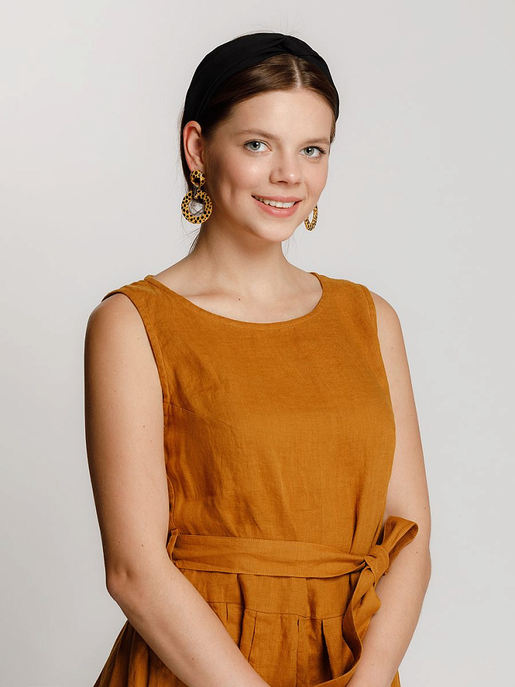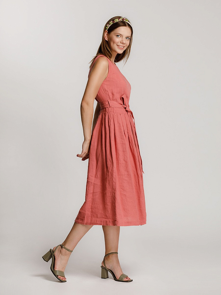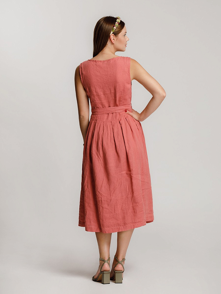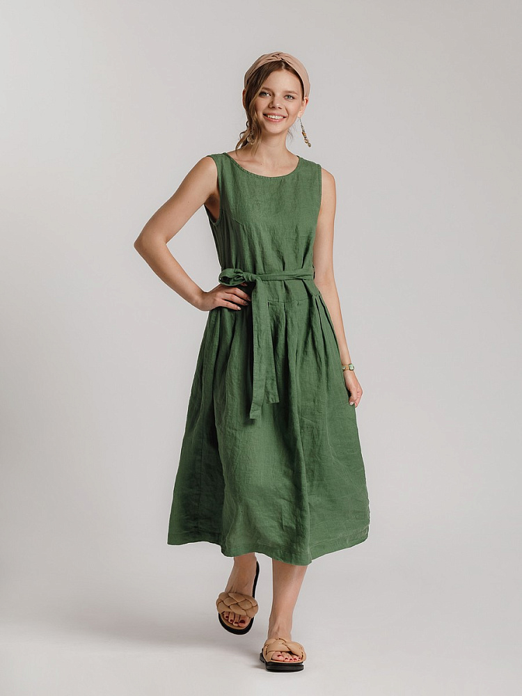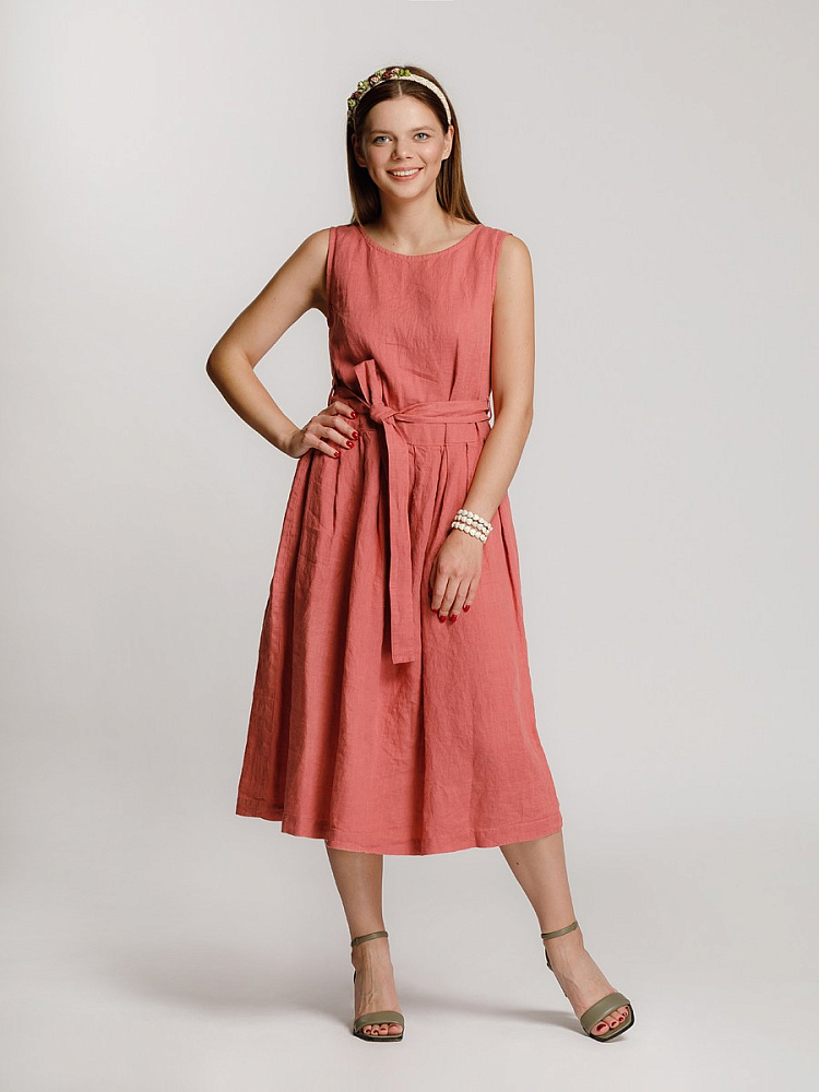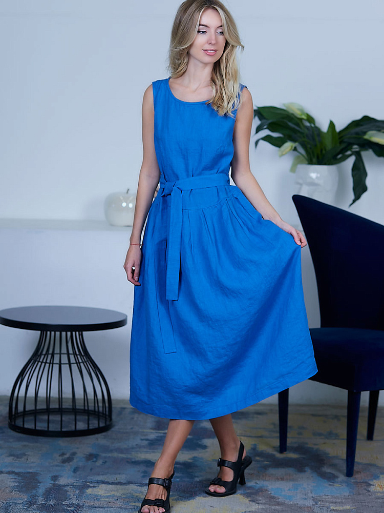 О представленной модели сарафана можно сказать – « не прост как кажется»! Его минималистические черты скрывают в себе роскошь натурального льна и самобытность форм. Несмотря на полуприлегающий силуэт, который не подразумевает акцент на талии, в данной модели она ярко подчёркнута поясом – кушаком и глубокими складками на юбке. Длинна миди, которой обладает сарафан – универсальна и подходит большинству девушек и женщин. Эта длина способна скорректировать пропорции фигуры практически до идеальных. Дух минимализма демонстрирует лиф. Его простой крой и лаконичный дизайн подчёркивает естественную красоту женщины. Плавная линия плеча и изгибы шеи великолепны на фоне жатой текстуры льна. Данный сарафан можно сочетать с любыми видами обуви, сумок и аксессуарами, которые можно подобрать в зависимости от ваших вкусовых предпочтений и функциональной направленности изделия.
