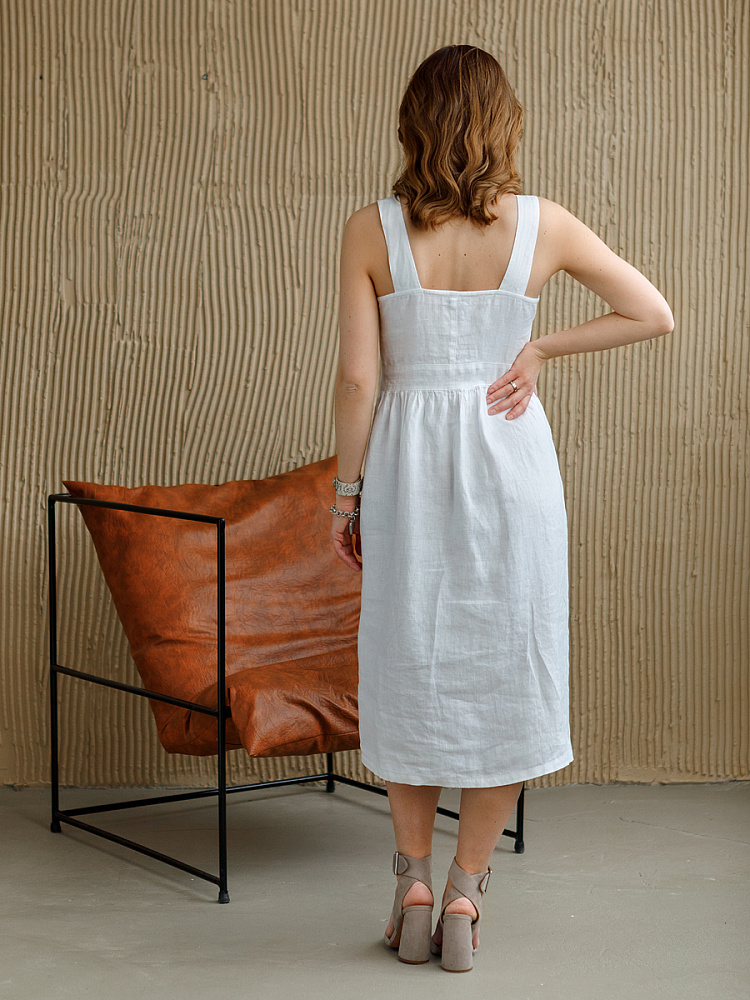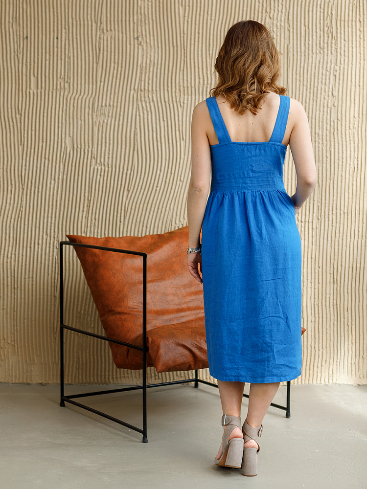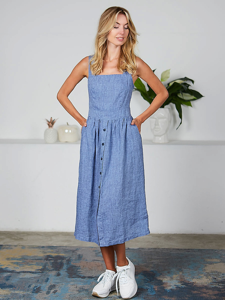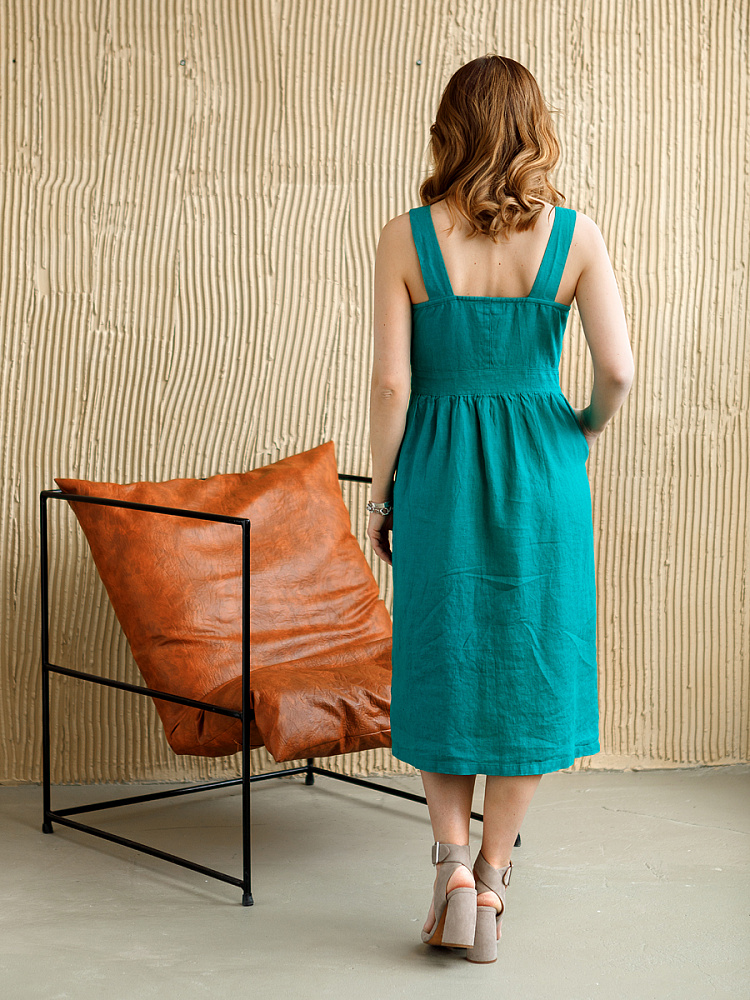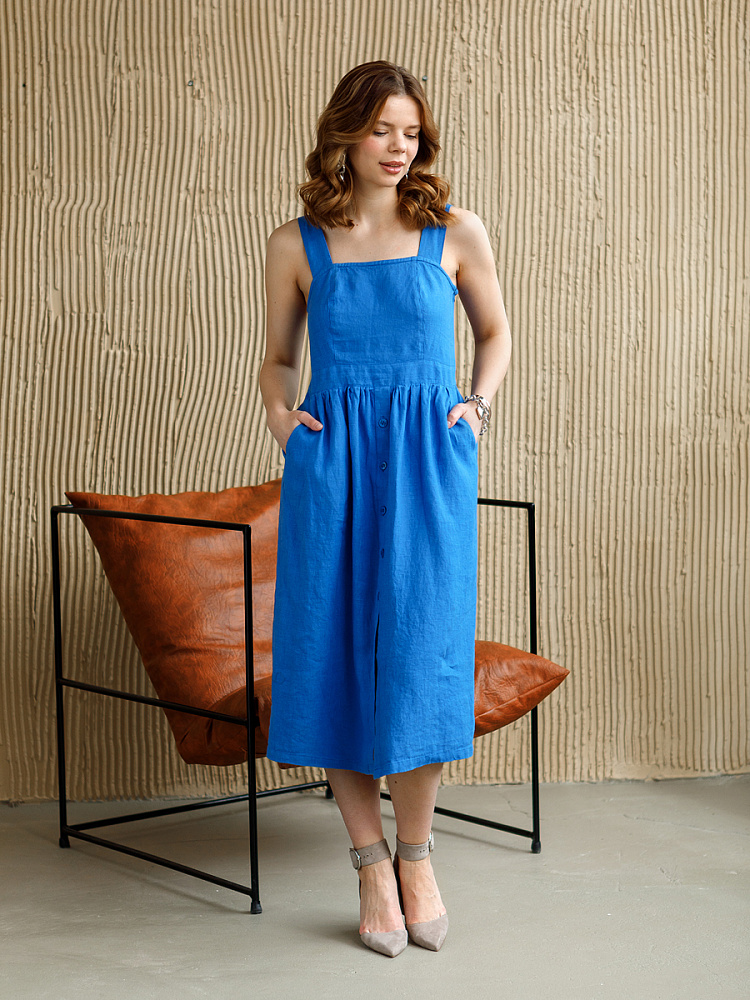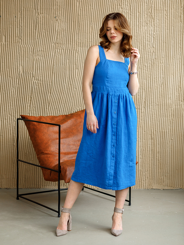 Каждая девушка или женщина в определённые моменты жизни испытывает романтические чувства, или стремится окружить себя такими эмоциями. Именно поэтому на такой случай ей необходимо иметь в своём гардеробе вещи, которые подчеркнут её настроение. Сарафан как нельзя лучше, справится с этой задачей. А если он изо льна – бонусом к внешнему виду будет комфорт в использовании. Обратите внимание на представленную модель. Отрезная деталь по талии деликатно подчёркивает силуэт «песочные часы». Мелкие складки придают округлые формы, что на контрасте еще больше подчёркивает утончённость женской талии. Застёжка на пуговицах создаёт выгодную вертикаль, которая делает силуэт более стройным. Лиф изделия фиксируется широкими бретелями, линия плеч и декольте – открыты, что даёт возможность продемонстрировать красоту женской фигуры и такой долгожданный бронзовый загар. Карманы в боковых швах придают функциональную направленность модели.