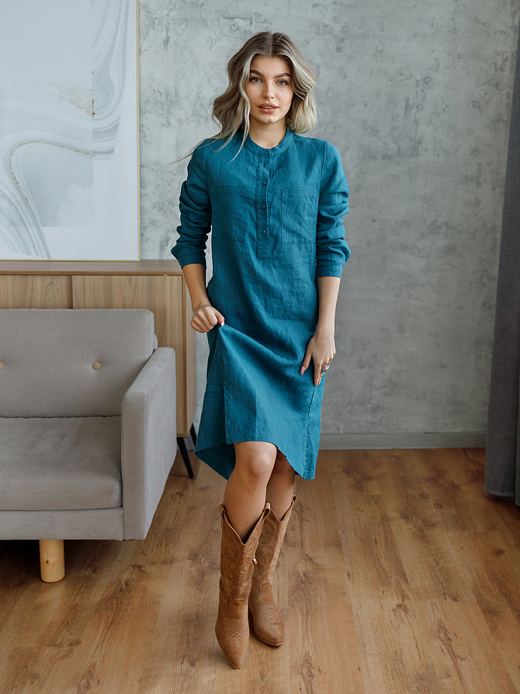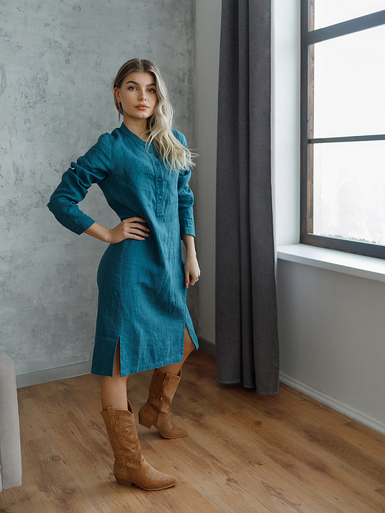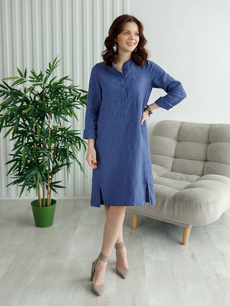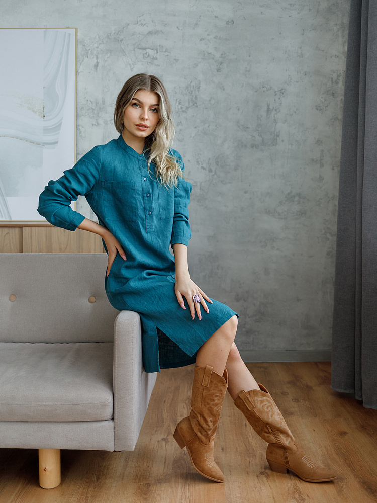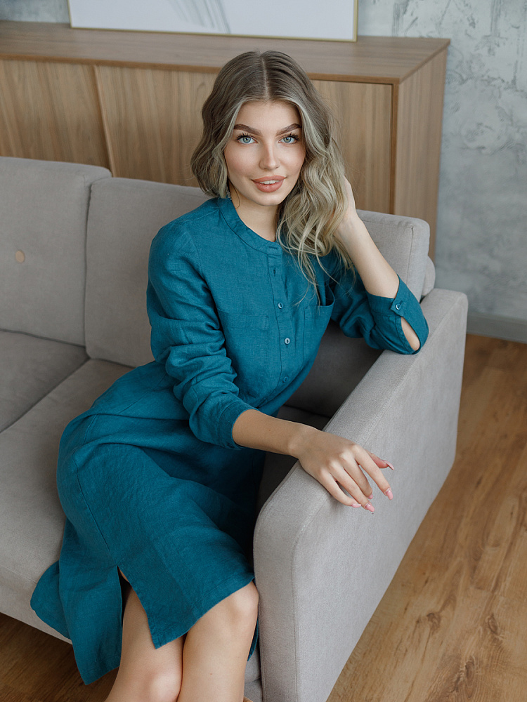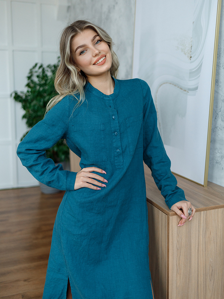Невозможно не согласиться, что платье – рубашка очень удобная и универсальная вещь. Идеально подходит для создания повседневного или делового образа. Именно поэтому такая модель должна присутствовать в женском гардеробе. Это будет хорошим приобретением, которое оправдает вложения, не надоест и не потеряет своей актуальности многие сезоны. Ну а если, подобная модель изготовлена из натурального материала – все сомнения должны уйти. Представленное платье как нельзя лучше соответствует всем перечисленным критериям и качествам. В прямом силуэте удлинённого платья угадываются черты любимой мужской сорочки. Укороченная застёжка – планка как лаконичное продолжение воротника – стойки. В области груди расположены большие накладные карманы прямоугольной формы, которые подчёркивают геометрию силуэтных линий. Низ изделия лаконично дополнен разрезами в боковых швах. Жатая текстура натурального льна великолепно воплотила все дизайнерские задумки.